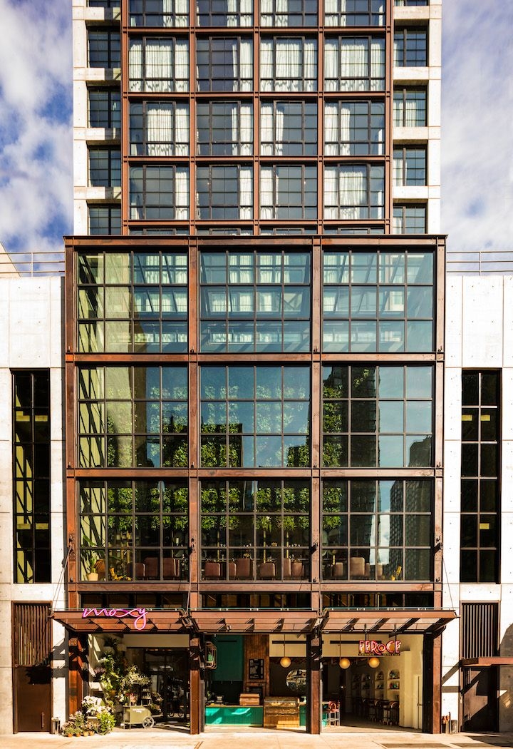 At 35 stories, the architecture of the 349-key Moxy NYC Chelsea is inspired by the dichotomy that exists within the surrounding Flower District neighborhood. The hotel brings together industrial and natural design elements to create a destination in dialogue with its location while maintaining a modern edge through innovative design.
