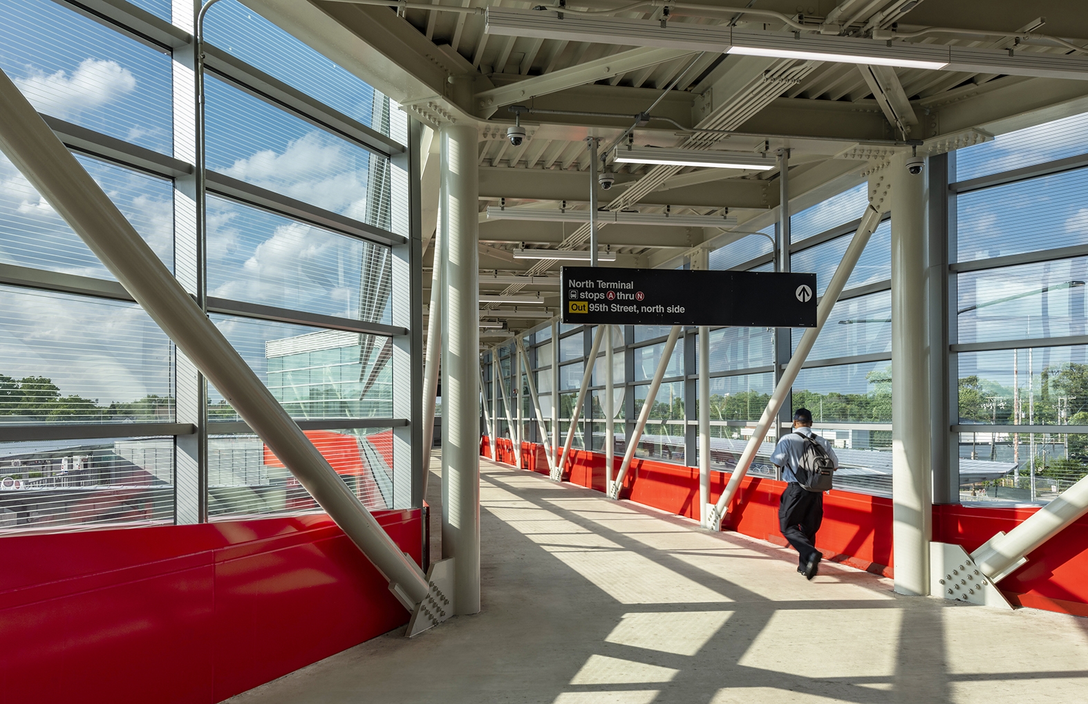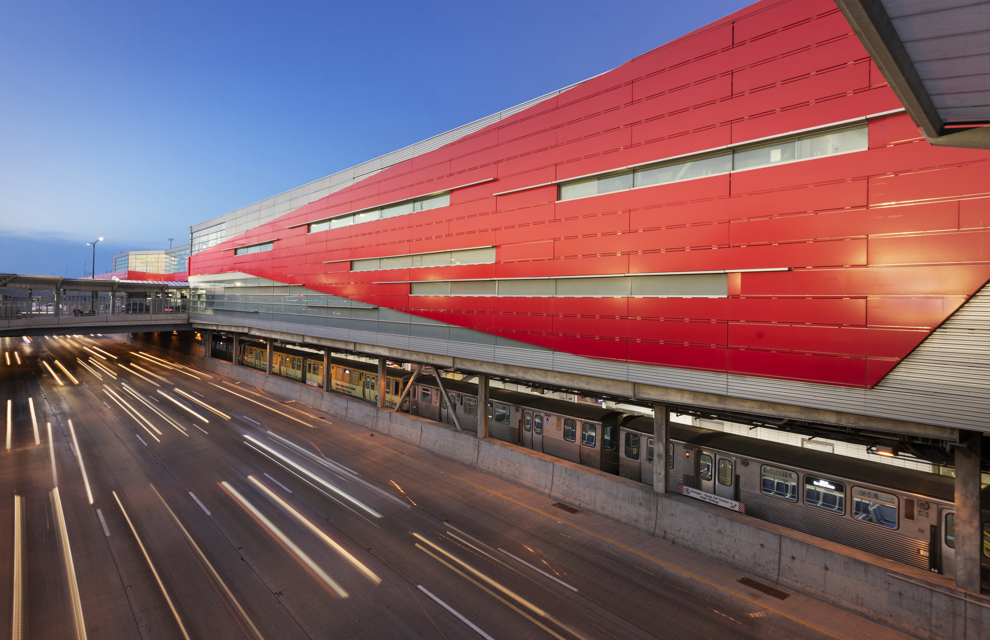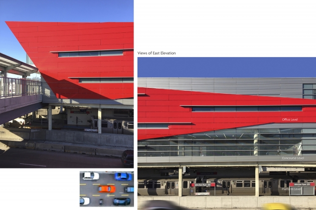 Designed as a gateway to Chicago with it’s iconic “brow” projecting over the highway at the north/south entries, it was conceived as a continuous ribbon stretching south to north, tying the terminals together with the thinnest point at the pedestrian bridge across 95th Street.