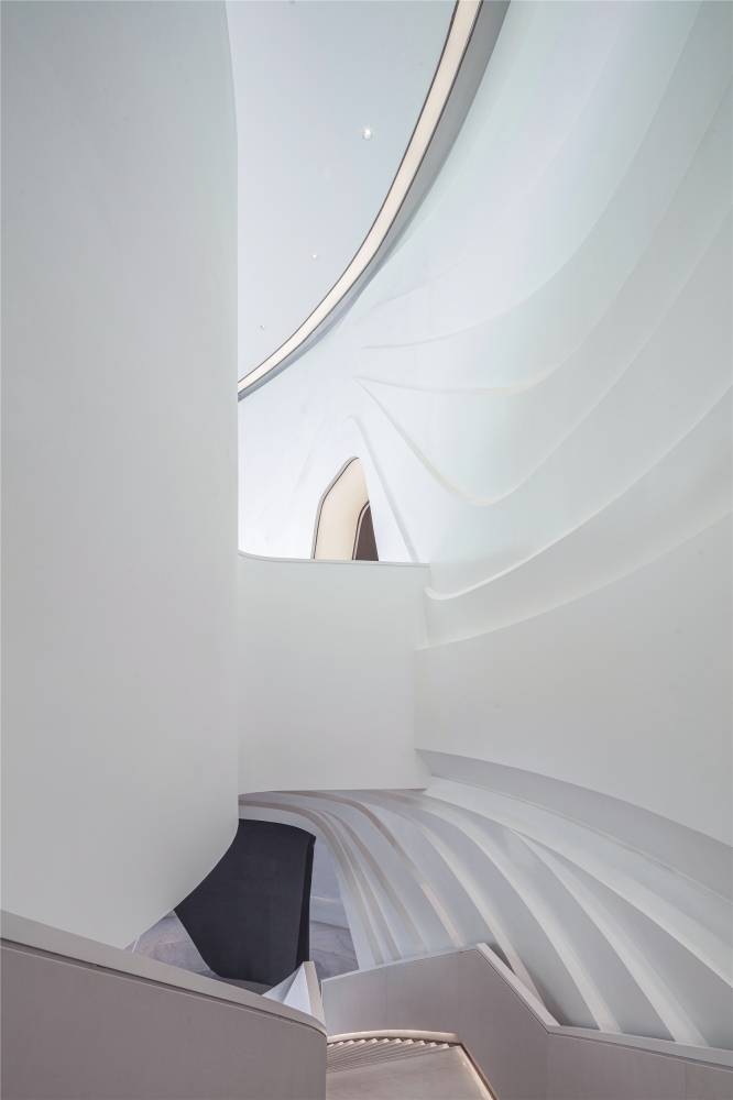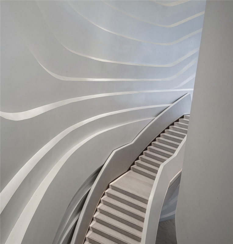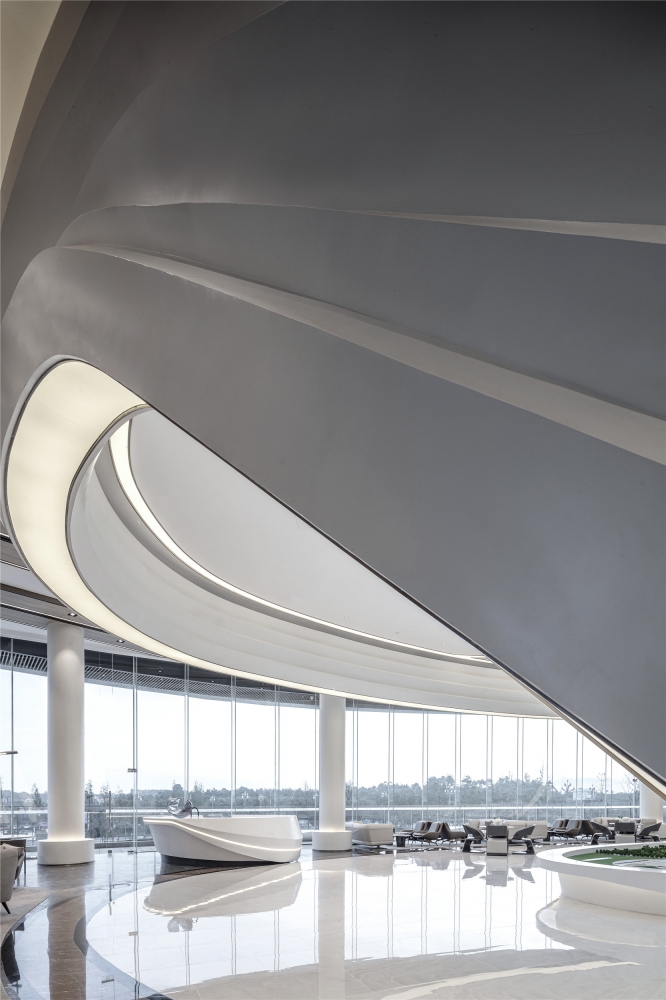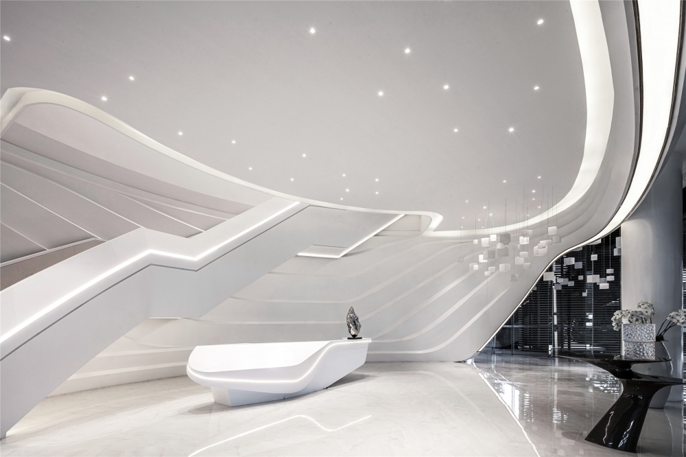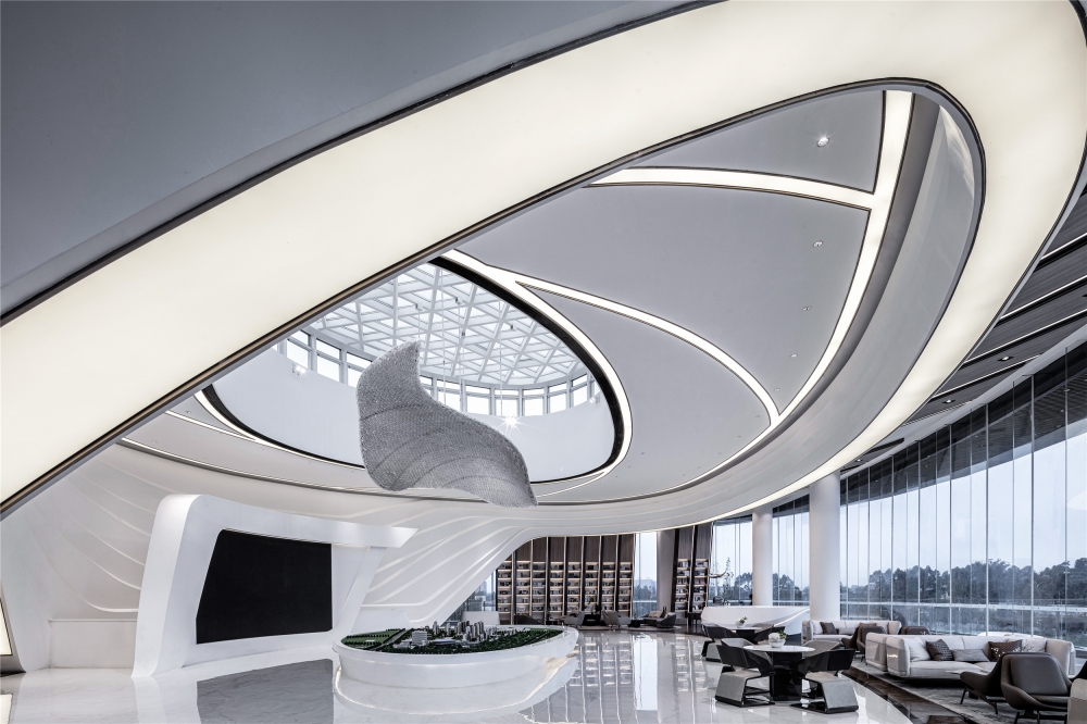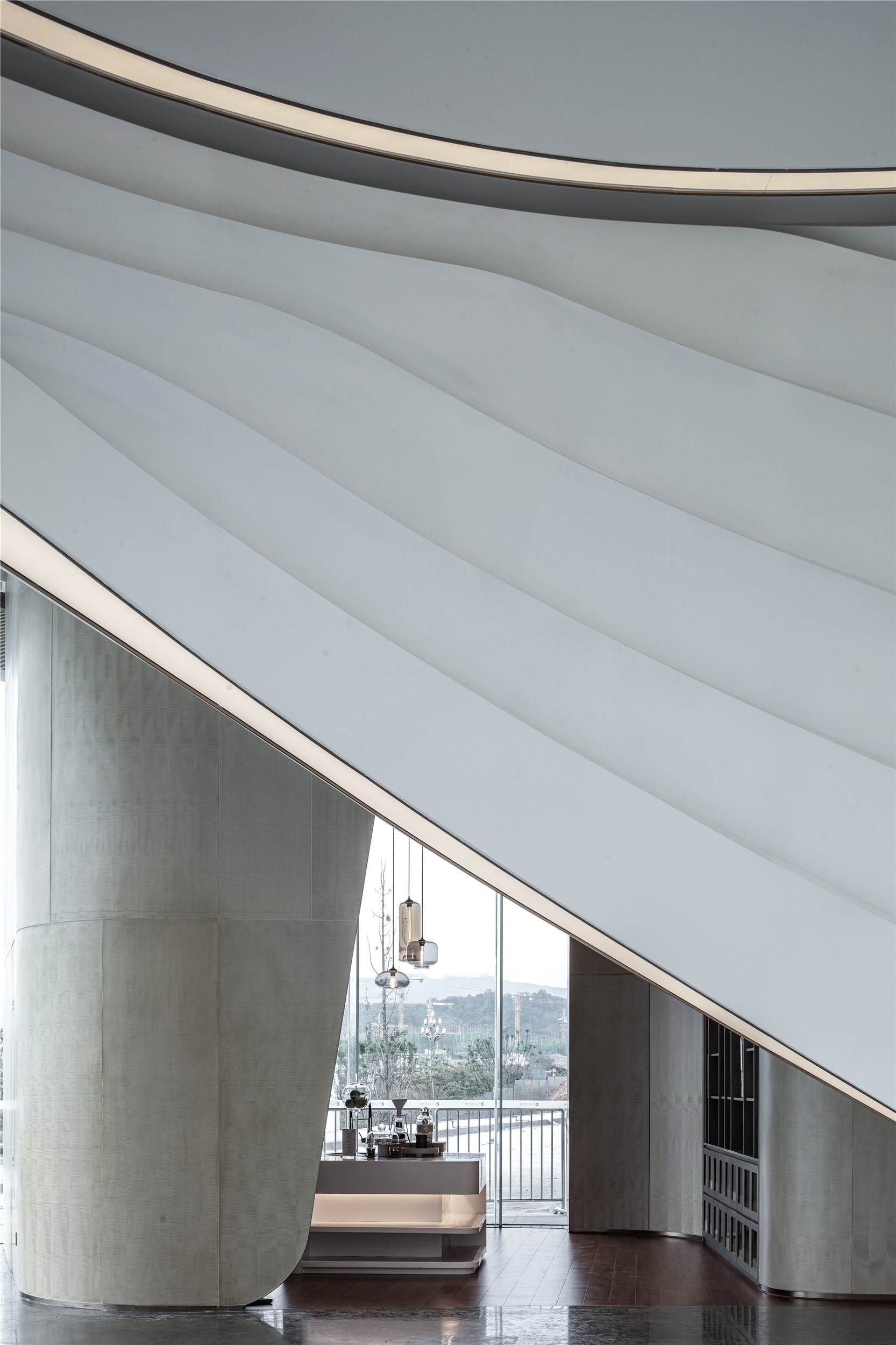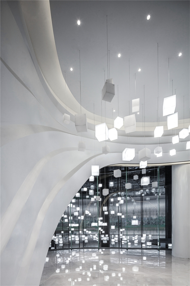 The project is located in Chengdu. It is a development and exhibition area for the community.The community is focus on clean energy as its main industrial chain to create a smart city covering the new and clean generation of information technology. The designer takes the two elements of "water" and "light" as the themes, allowing nature and technology to collide to re-establish the emotional connection between man and nature.The light cube art installation in front of the entrance of the lobby hangs over the water. People are attracted to these light cubes and take pictures here.When people enter the interior, the curved wall resembles the ripples produced by the flow of curved water.Through the sand table and scenic area display, to create a harmonious and humanized life imagination space for customers.