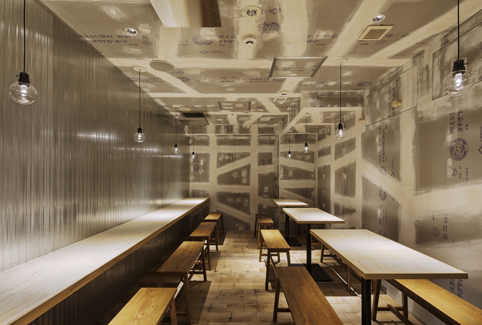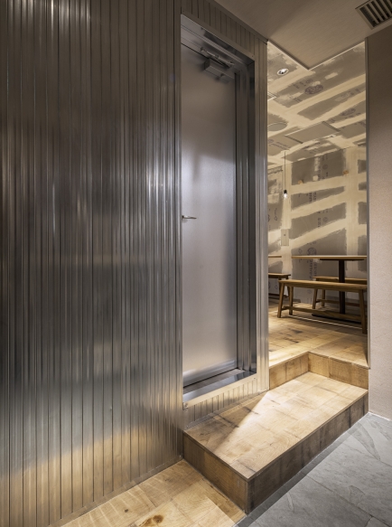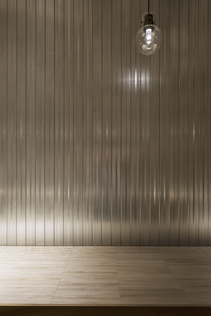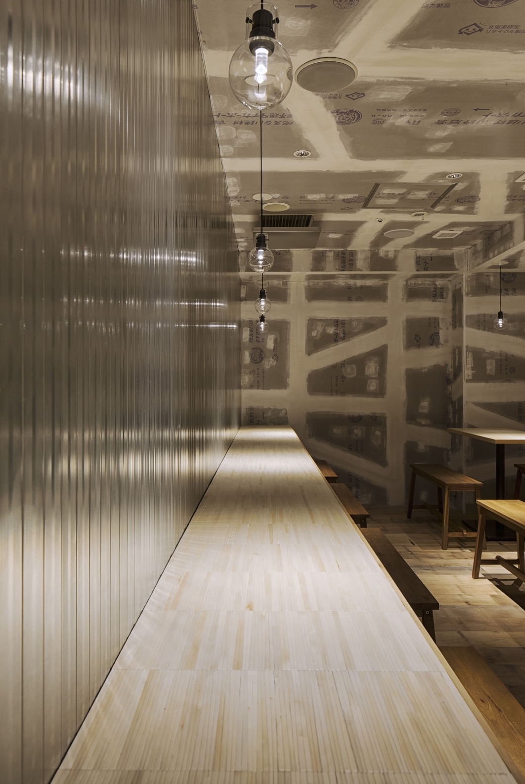 Additionally, the existing plasterboard was peeled off and the studs, as the base materials, were lined out and used as fine finishing material. Moreover, we used an existing flooring as the main floor texture and the desks were spread out throughout the space and blanked with thinned wooden chopsticks.