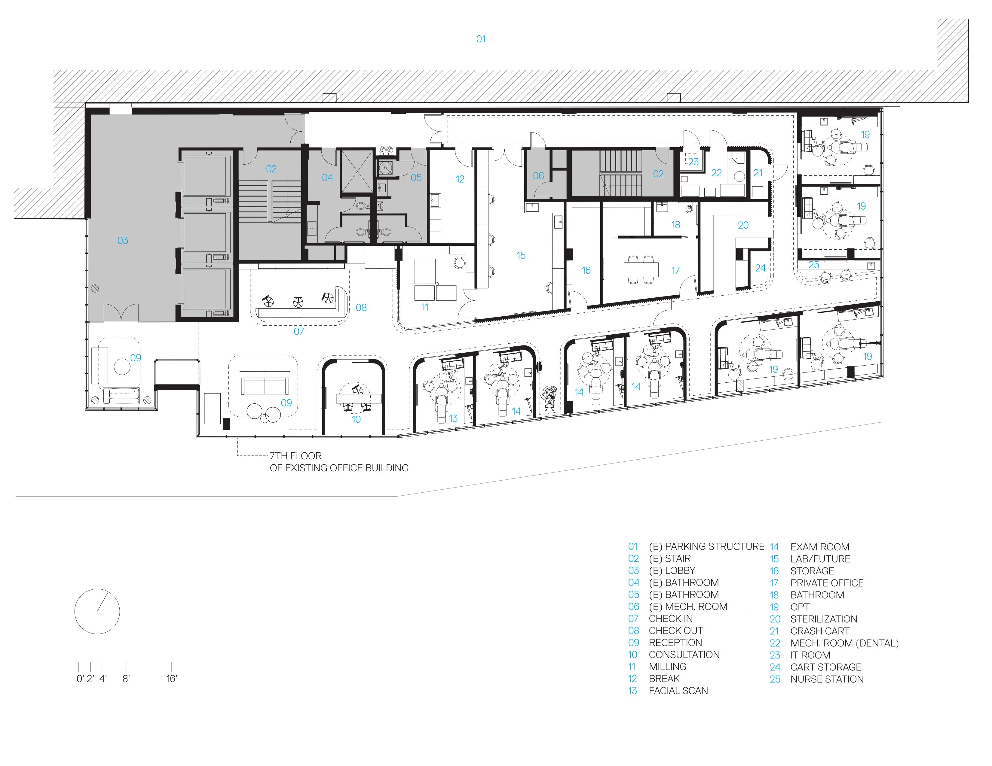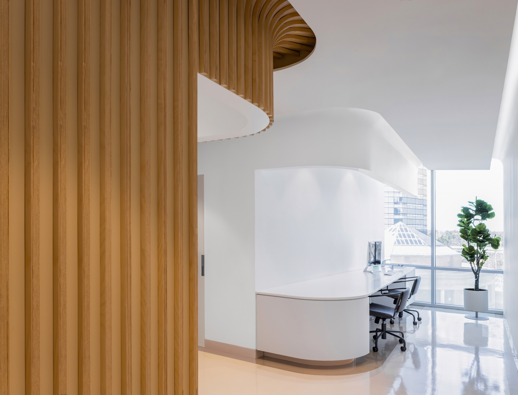 An urban design approach at a much smaller scale was employed in this project. The Clinic Promenade was remodeled and re-examined for its importance as a counterpoint to the substantial offices. Groupings of the clinic's programs were based on the promenade's sequence of experiences. In the reception area, guests may get a glimpse of the whole operation and the clinic's vision for health thanks to soft walls, informal furniture layout and indoor greenery. Intersections between office peninsulas were added to enliven the promenade and to separate surgical areas for improved sound isolation. Corridors were also used to their fullest potential in every way imaginable. The nurse station, sterilizing room, crash cart room, and dental cart parking are all located at the corner of the promenade, creating supplementary common areas that break up the linear experience.