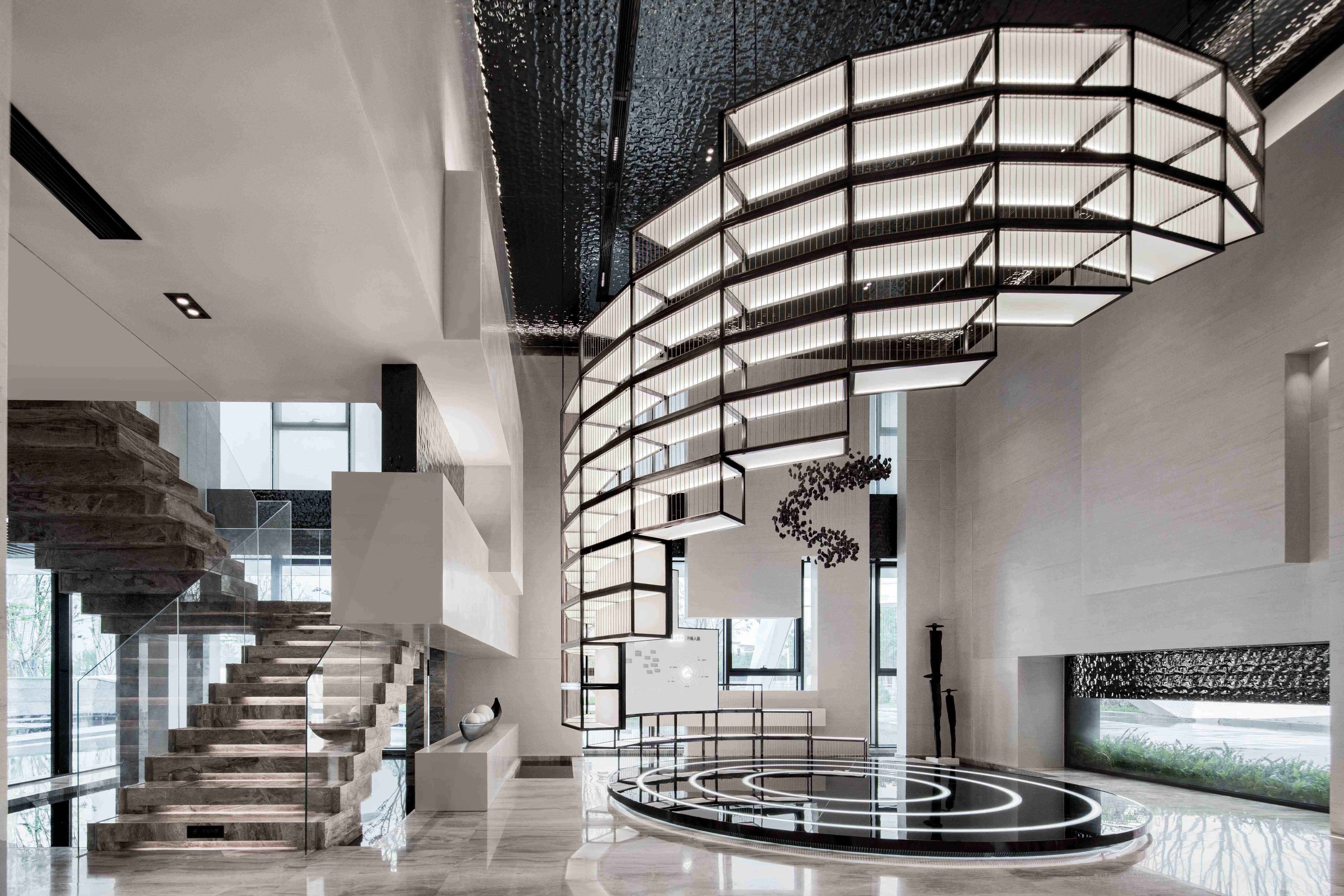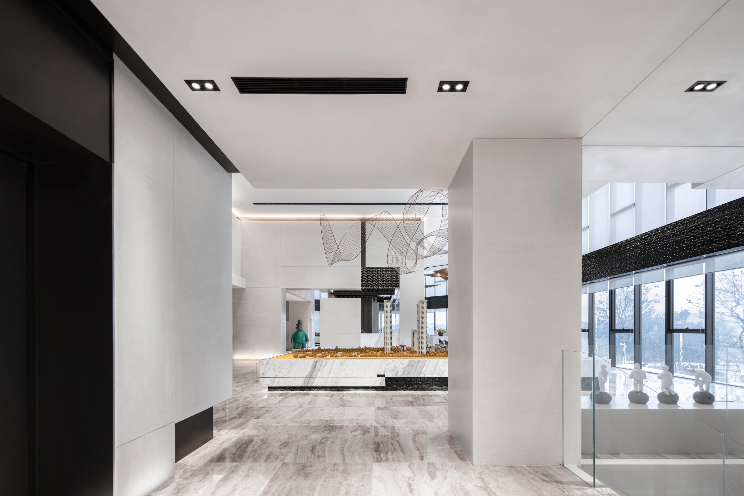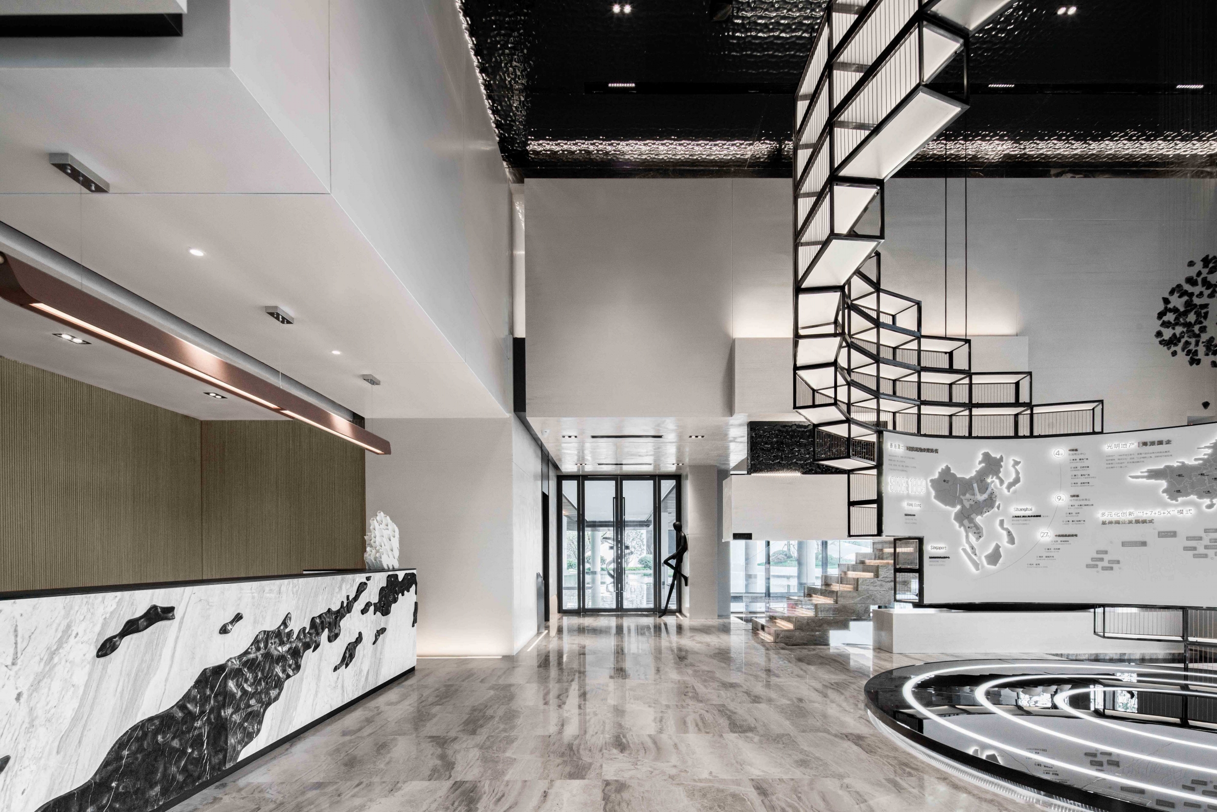 The space comprises three floors that are permeated with the black-and-white gray tone, simple but elegant. The first floor is reserved for the lobby and business exhibition area. The lobby looks simple and bright, where the information counter, made up of Diana gray stones and water grain stainless steel, has a unique rhythm. The business exhibition area fixes the grand tone for the space. The water grain stainless steel ceiling works with the spiraling device to compose an abstract scene of a hurricane blowing up at sea, hinting business prosperity.