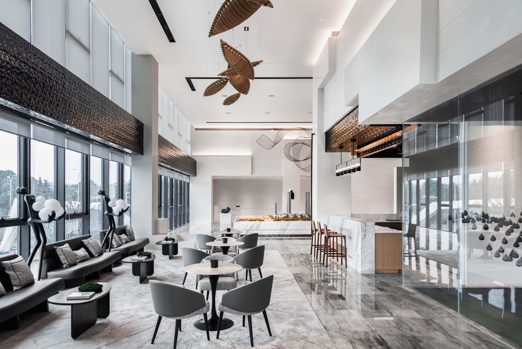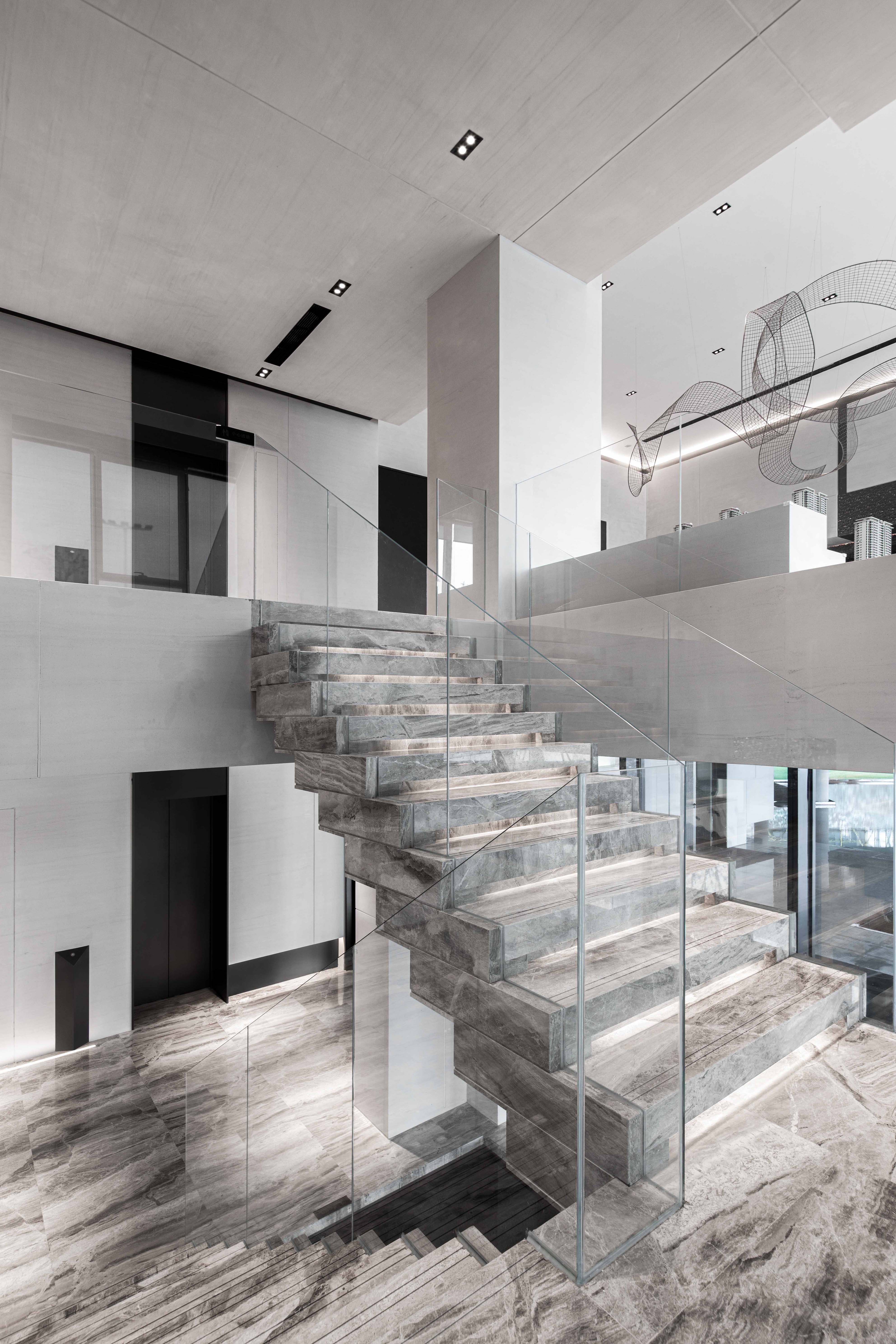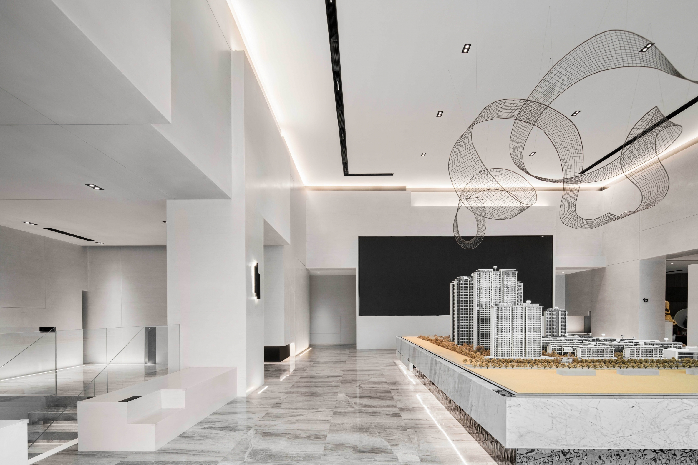 The space comprises three floors that are permeated with the black-and-white gray tone, simple but elegant. The first floor is reserved for the lobby and business exhibition area. The lobby looks simple and bright, where the information counter, made up of Diana gray stones and water grain stainless steel, has a unique rhythm. The business exhibition area fixes the grand tone for the space. The water grain stainless steel ceiling works with the spiraling device to compose an abstract scene of a hurricane blowing up at sea, hinting business prosperity.