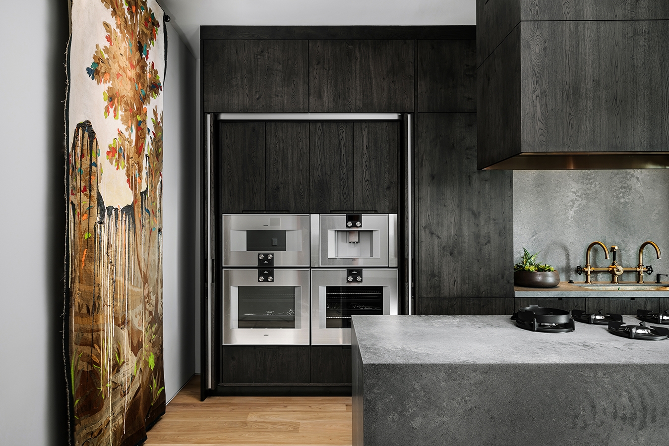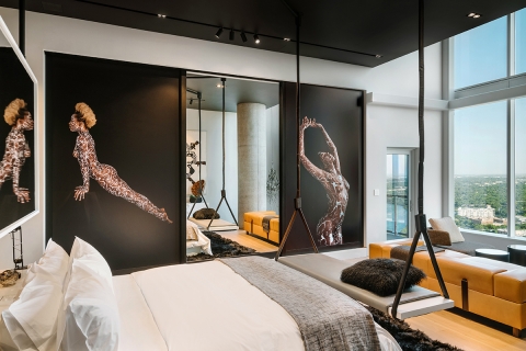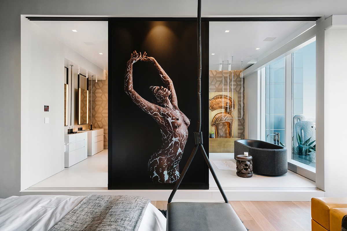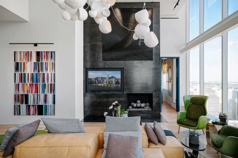 The client wanted his 34th floor penthouse to be a unique expression, filled with art and life. Our intention was to meld comfortable interiors with the sprawling views. As you enter, you're greeted by handmade "Bubble Lights" that give a cloud-like effect the living room. The kitchen to your right is handsome and clean with hidden drawers and popup appliances. You enter the master bedroom and discover two separate sitting areas, one designed for comfort and one to enjoy the view. There's carefully curated artwork in every room, including a unique painting in the dining room by Thomas Schoos.