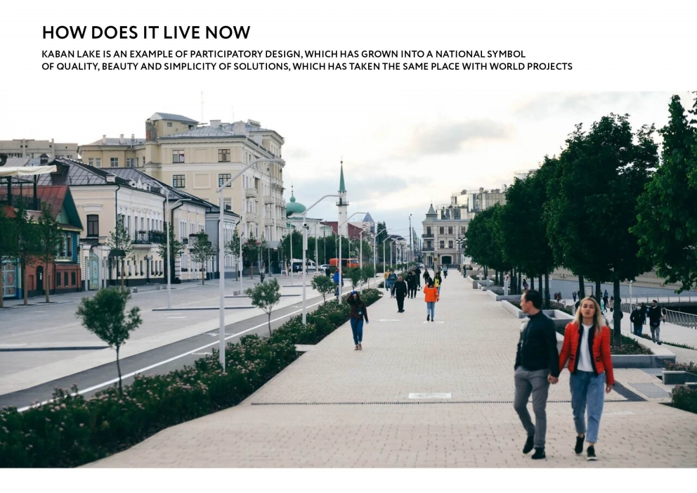 The Kaban lakes system is a natural monument, the largest lake system in terms of water area (193 hectares) in Tatarstan. There are 24 cultural heritage sites along the design area. Since 19th century, industrialization has been the cause of lakes` water pollution. Despite the 30-year-long treatment measures, the water remains dirty and the ecosystem is deteriorating.