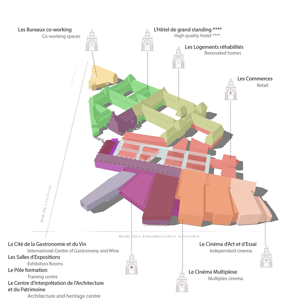 Our architectural approach aims to establish a dialogue between the traditions and the modernity of French cuisine, reusing historic elements as part of the architectural programme. A residential eco-district rounds out this cultural project. The project will include a living museum of gastronomy, a covered market, a hospitality management school, a start up hub and a 4-star hotel.