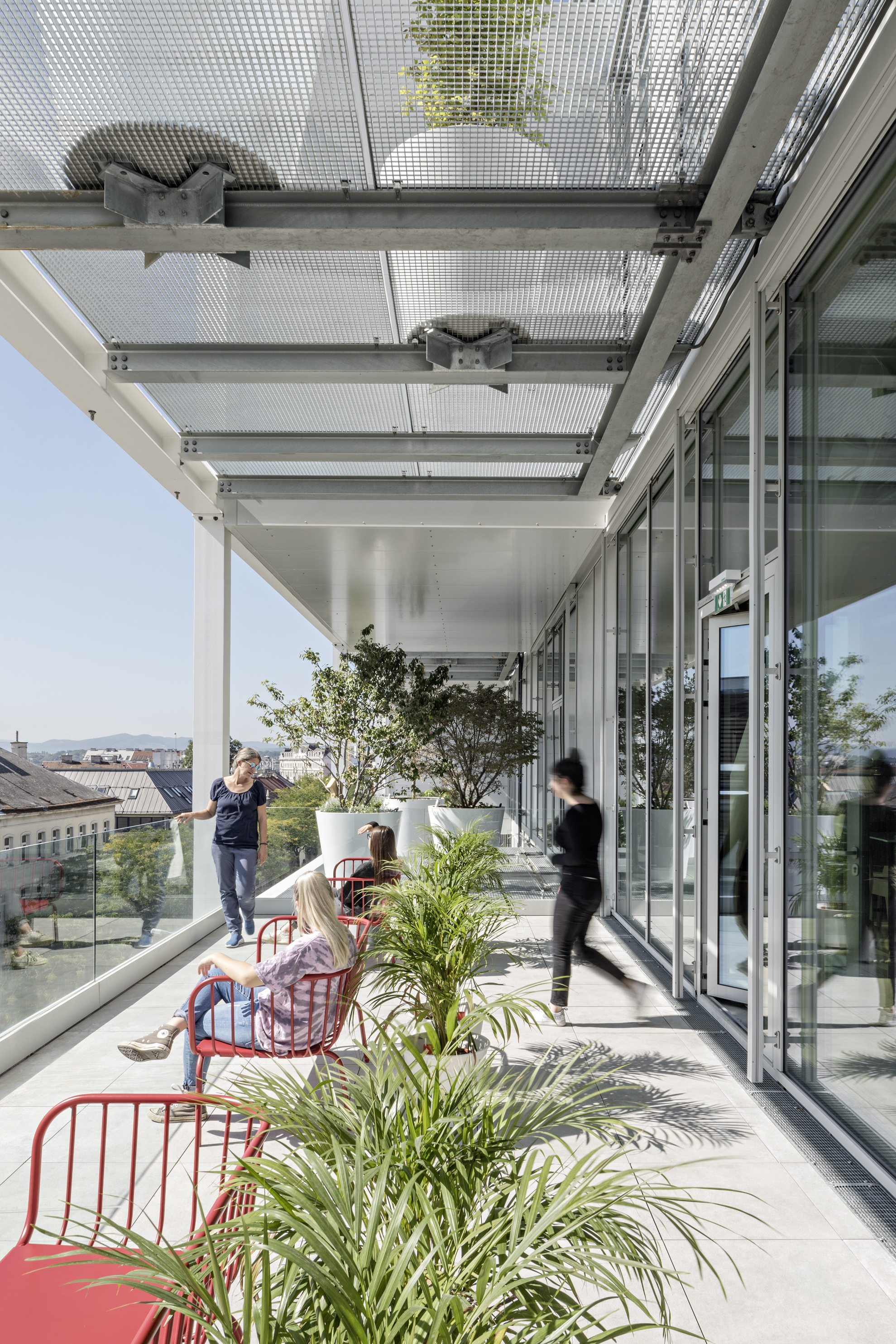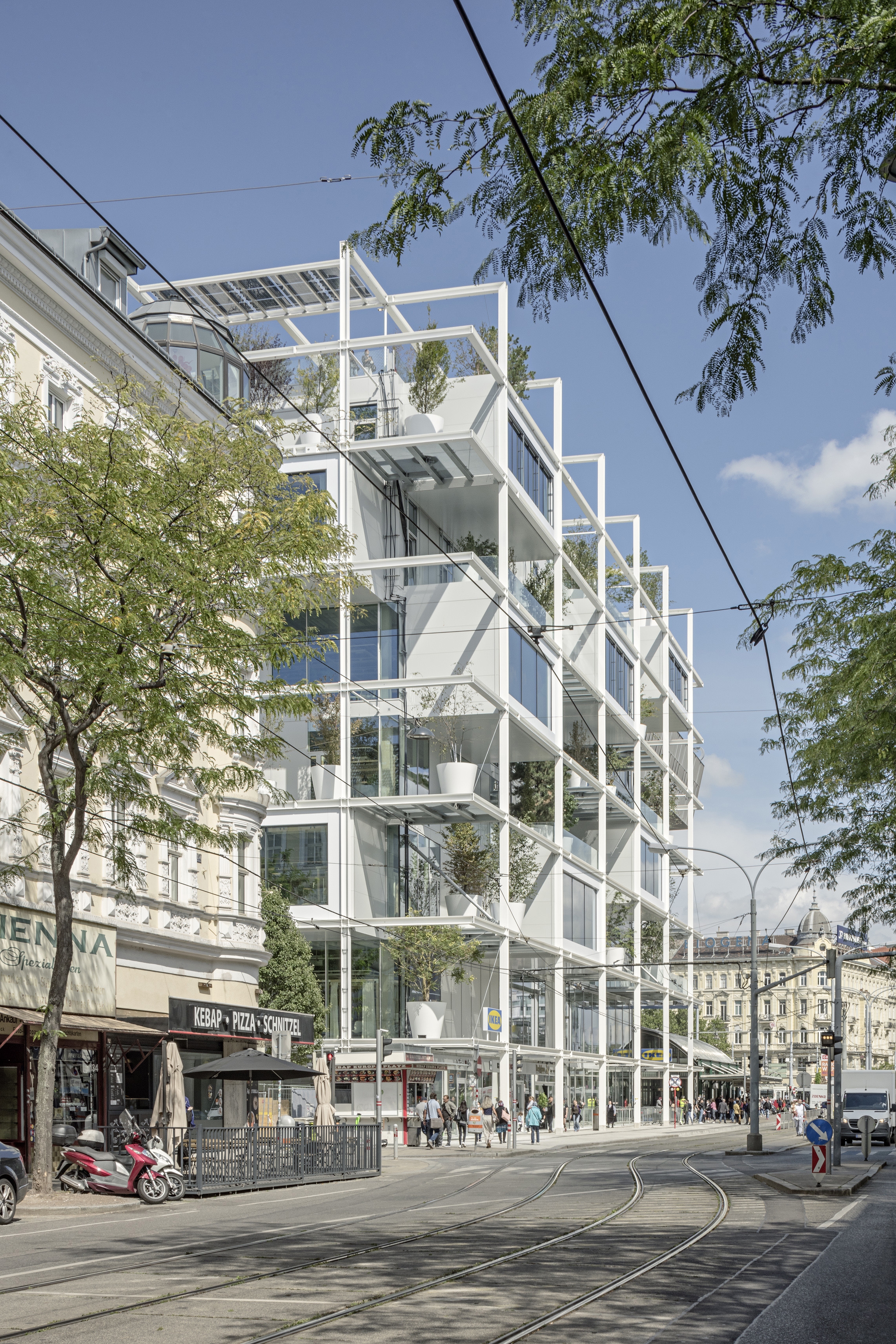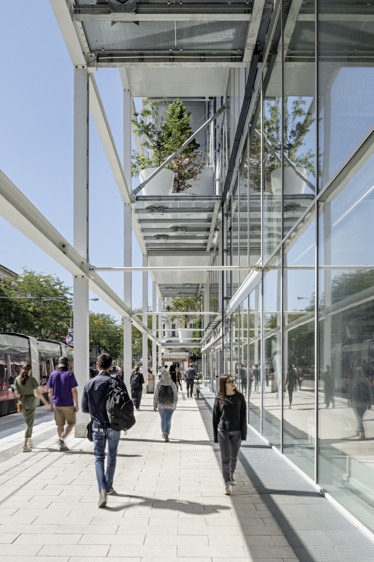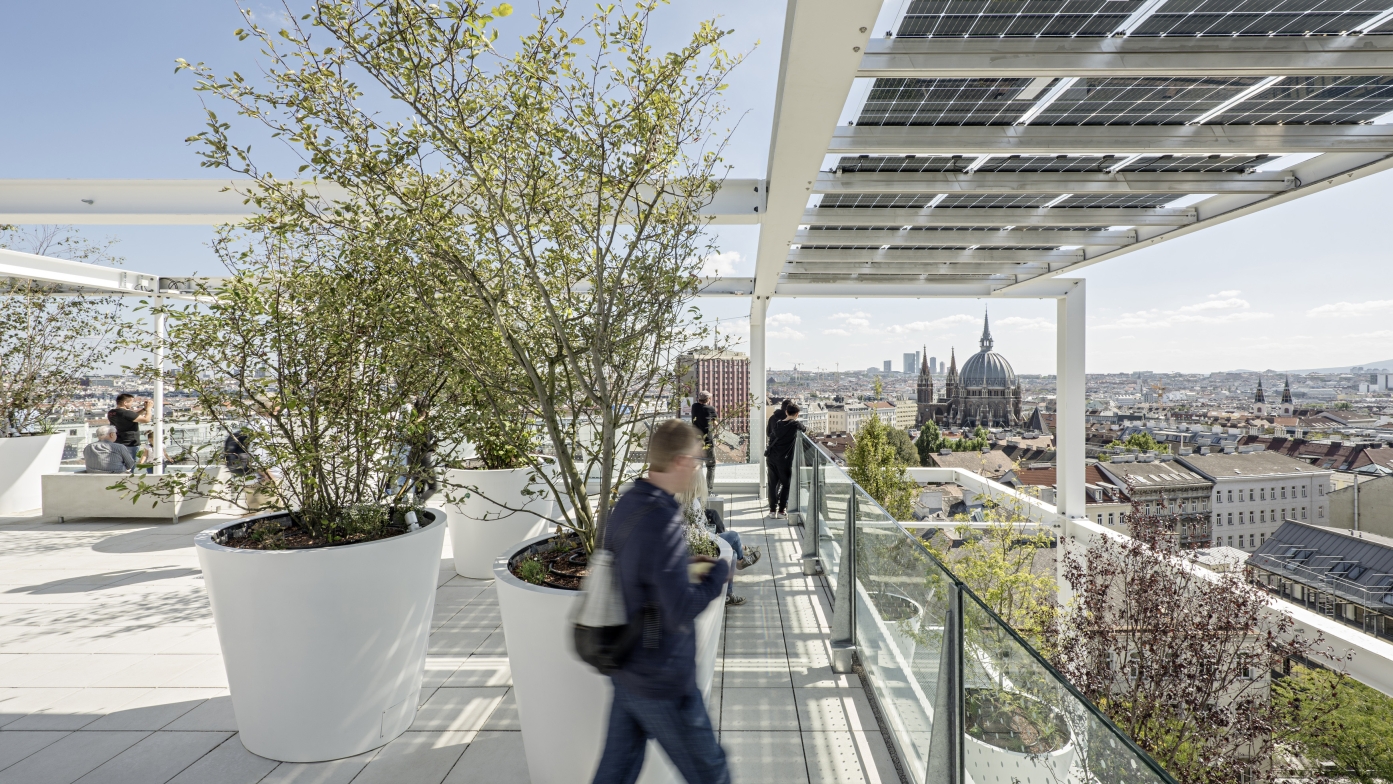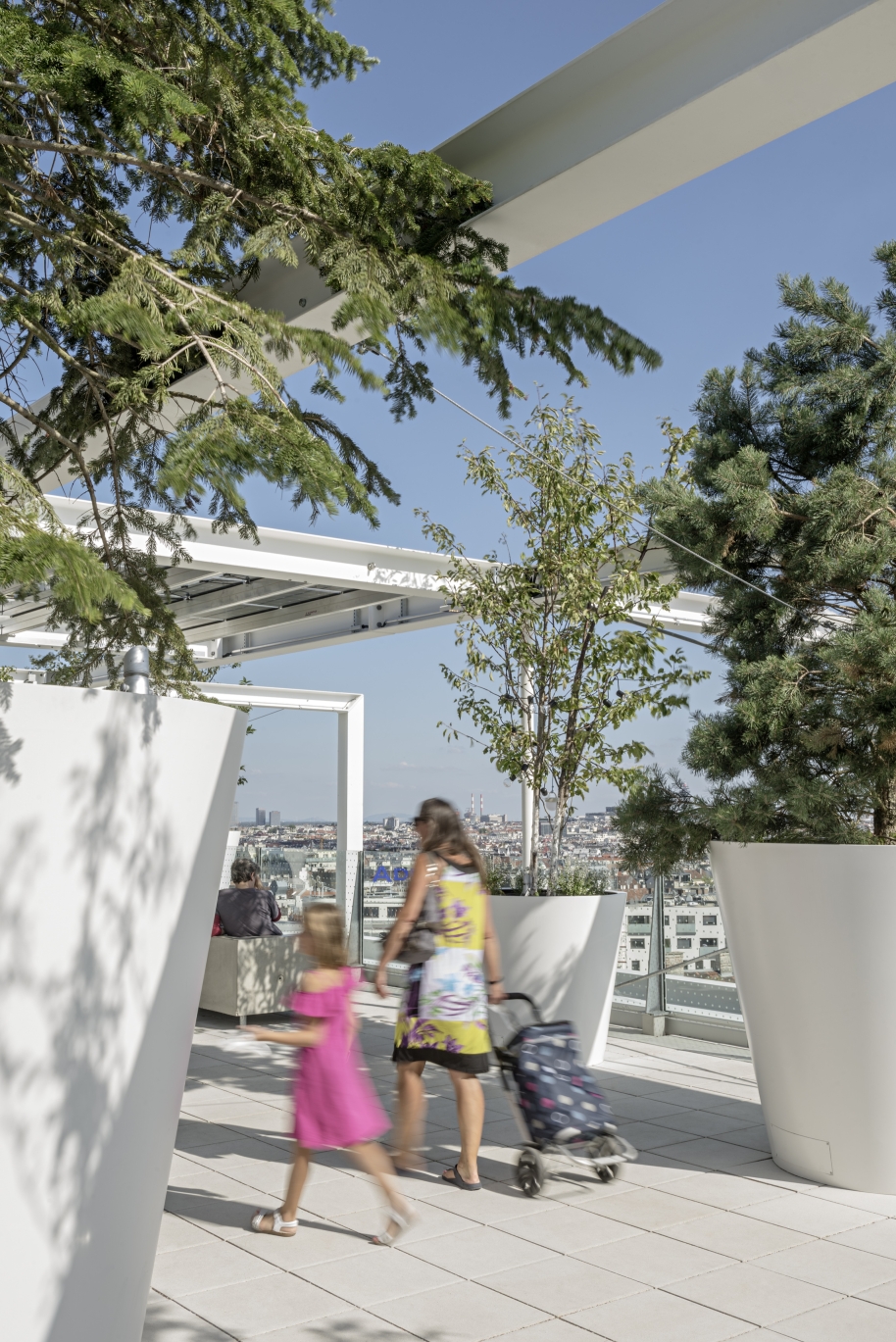 160 trees in the facade and on the roof sustainably influence the micro-climate. computer-simulations indicate a temperature decrease on pedestrian level of 1.5 °C.