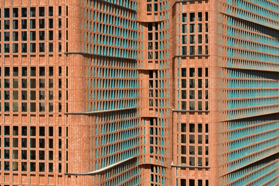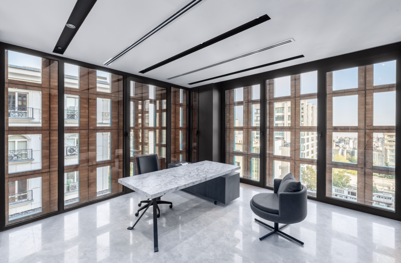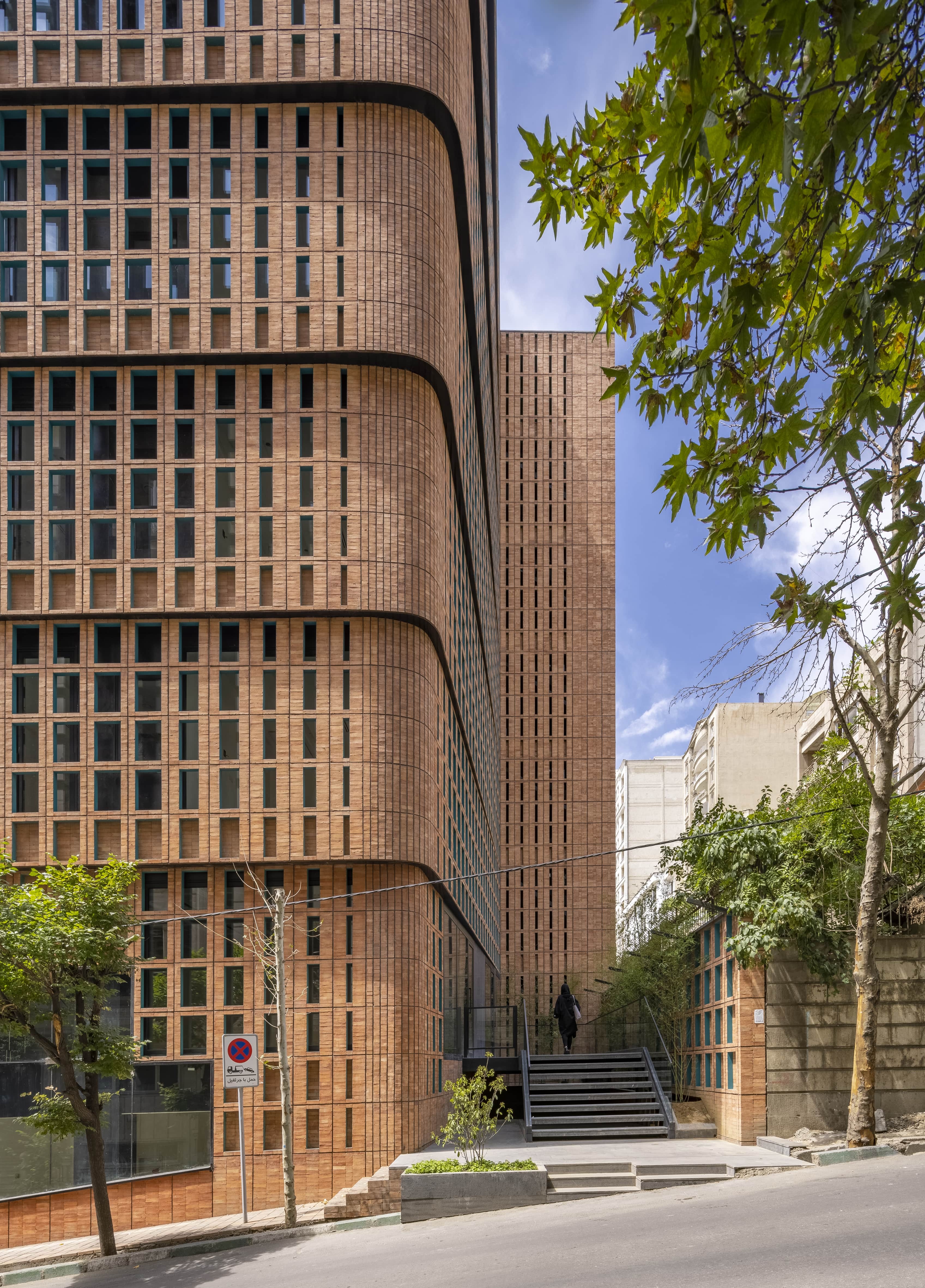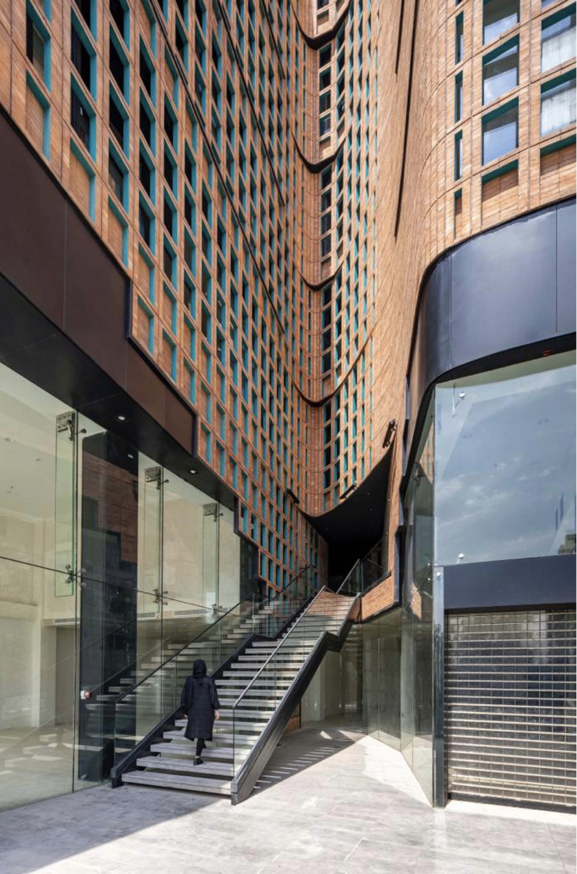 Also, the allowable proportion of glass to other materials on the façade is 40%. To create a homogeneous whole, an integrated double-skin façade was created with the inner continuous glass and outer porous skin by brick and torques metal frames forming modules that enable bigger and various sizes of openings on the façade.