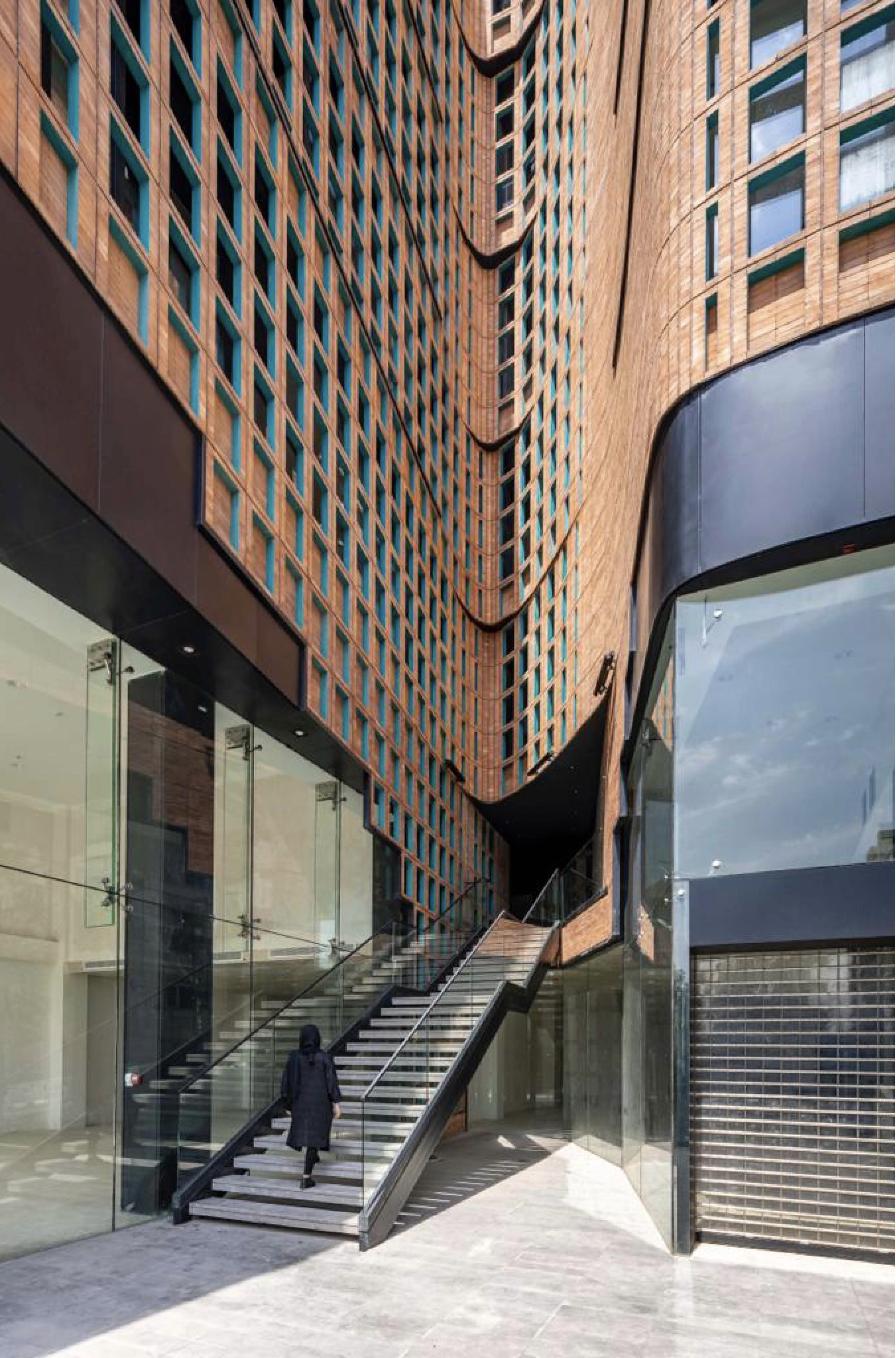 The regulation indicates that the occupation area of the building should not exceed 60% of the land in Tehran. So, a central light well to provide light to the central units is mandatory. Therefore, in reevaluating the morphology of this project we relocated the central void to the facade to form a plaza, letting people interact with the commercial zones of the building.
