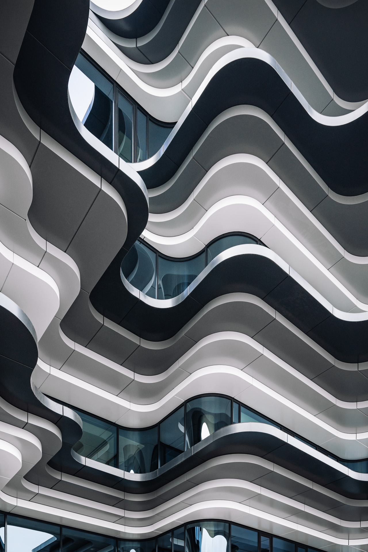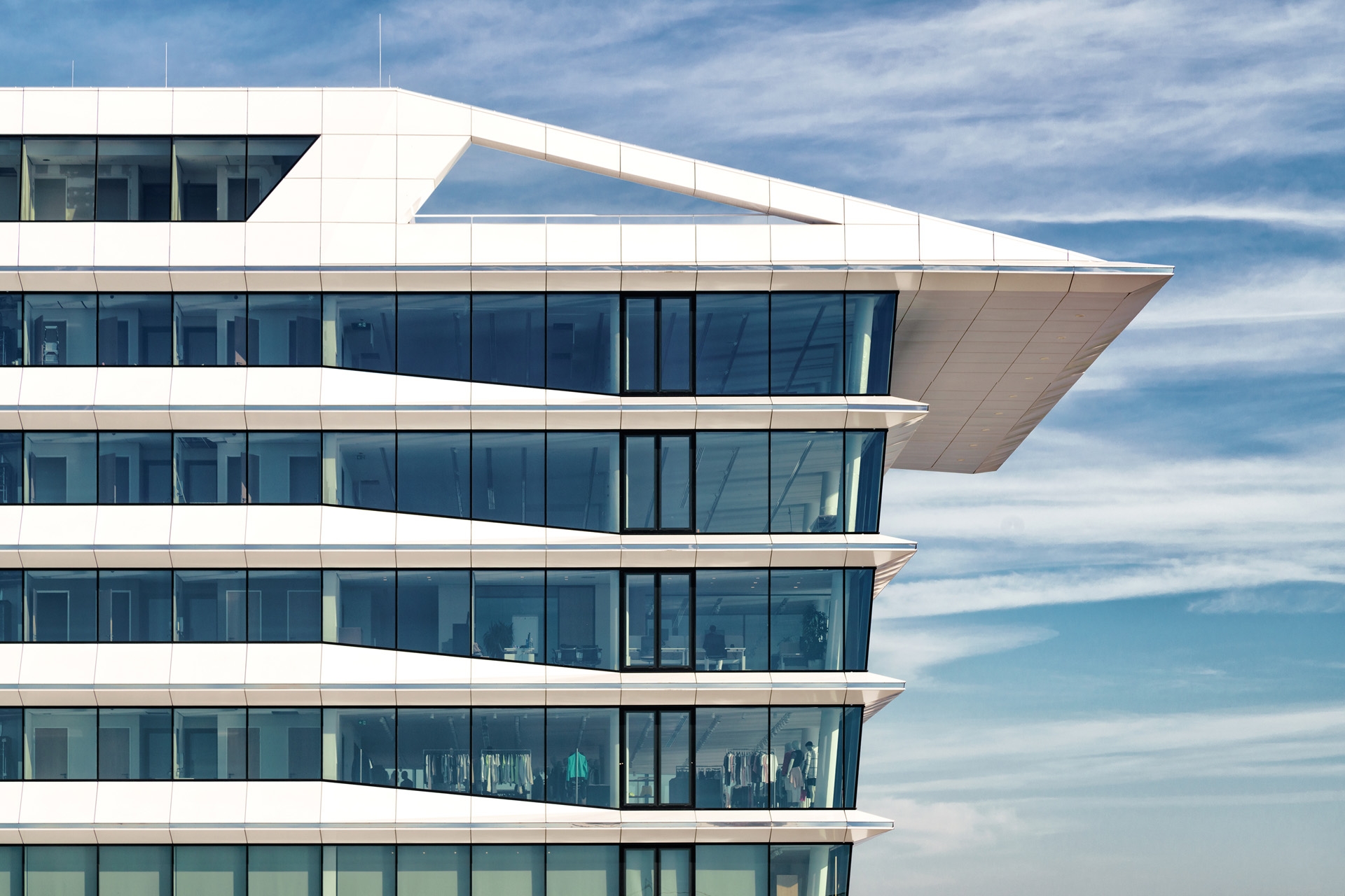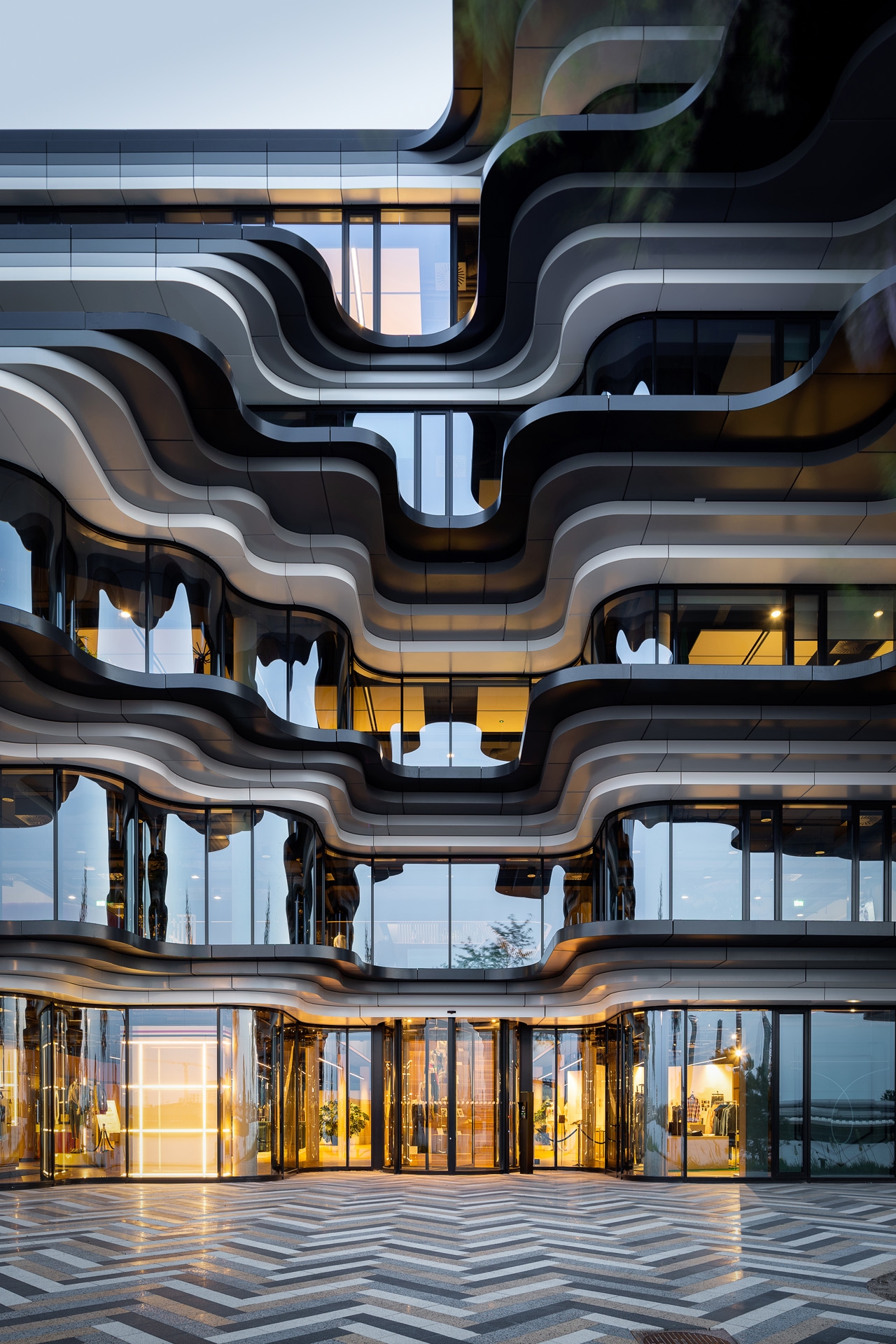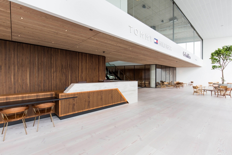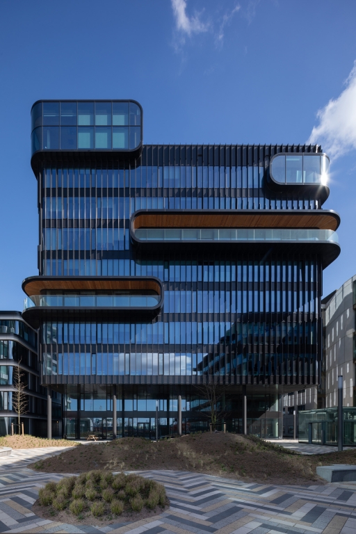 A maritime setting suggests a variety of associations, so to underline the shared yet separate identity of the 3 buildings, we interpreted it in three different ways. The European HQ Calvin Klein & Tommy Hilfiger building, the first to be completed, has the sleek lines and shiny finishes of a sailing ship. The middle, low-rise building, the social hub of the campus, has a stratified yet flowing form inspired by a waterfall. The third, a high-rise office complex, has a graphic façade that reflects the movement of waves.