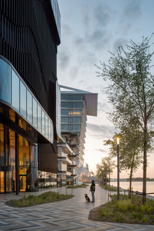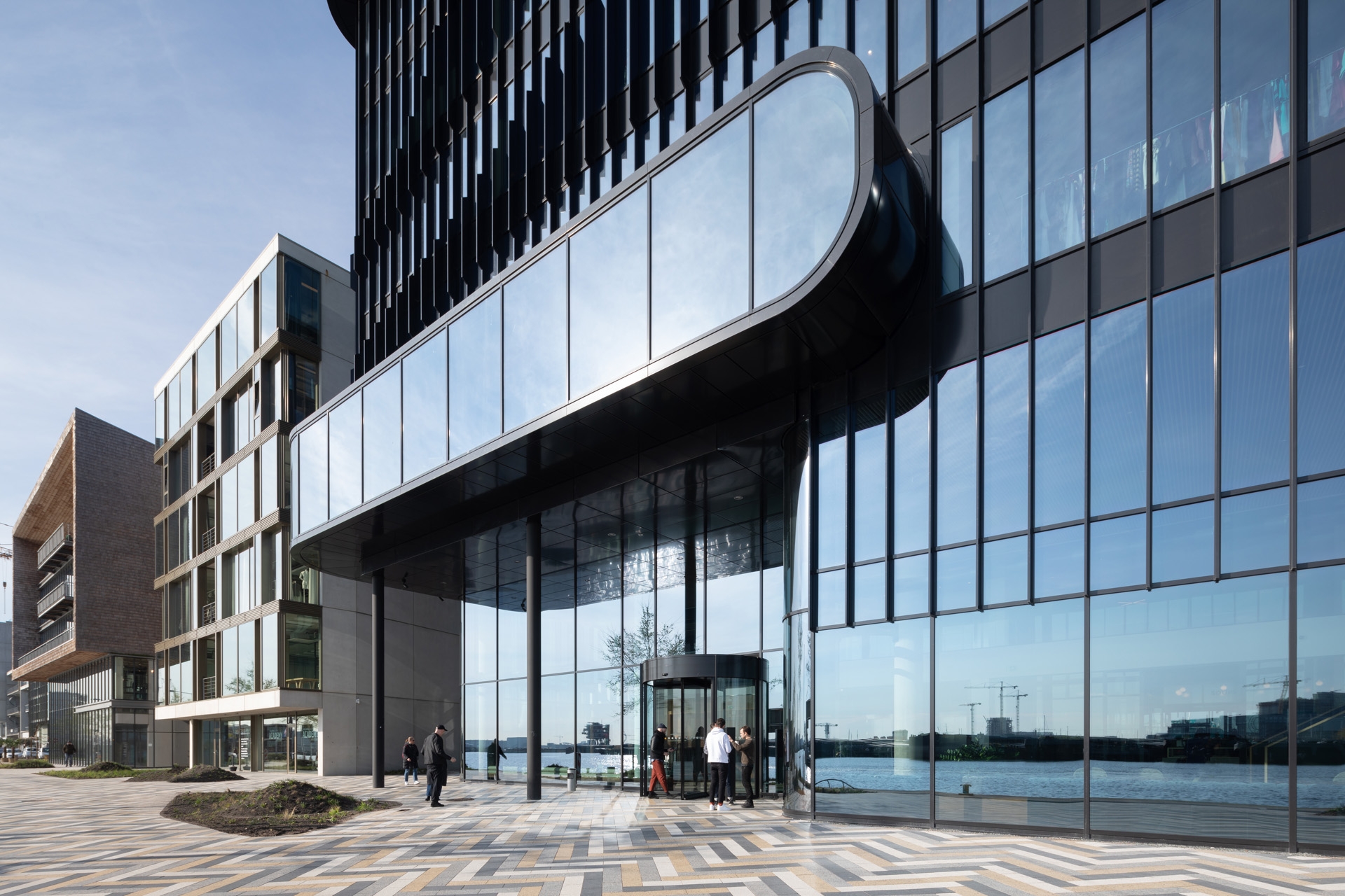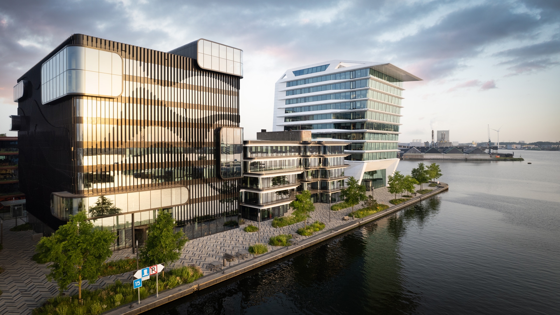 Seen from the water, the three buildings create an intriguing rhythm. The angular forms of the PVH Campus building gradually morph across the façades into rounded edges and flowing lines.