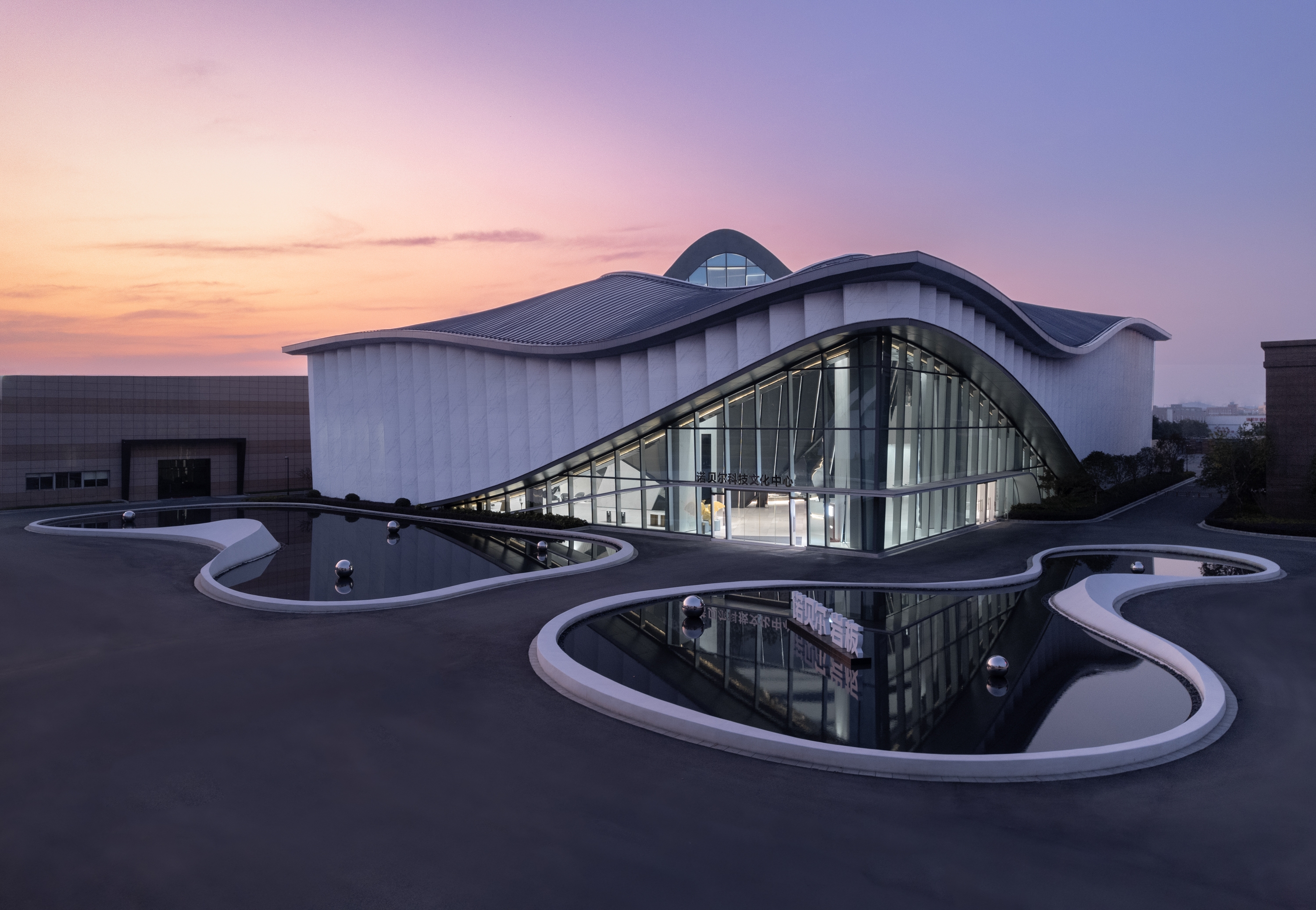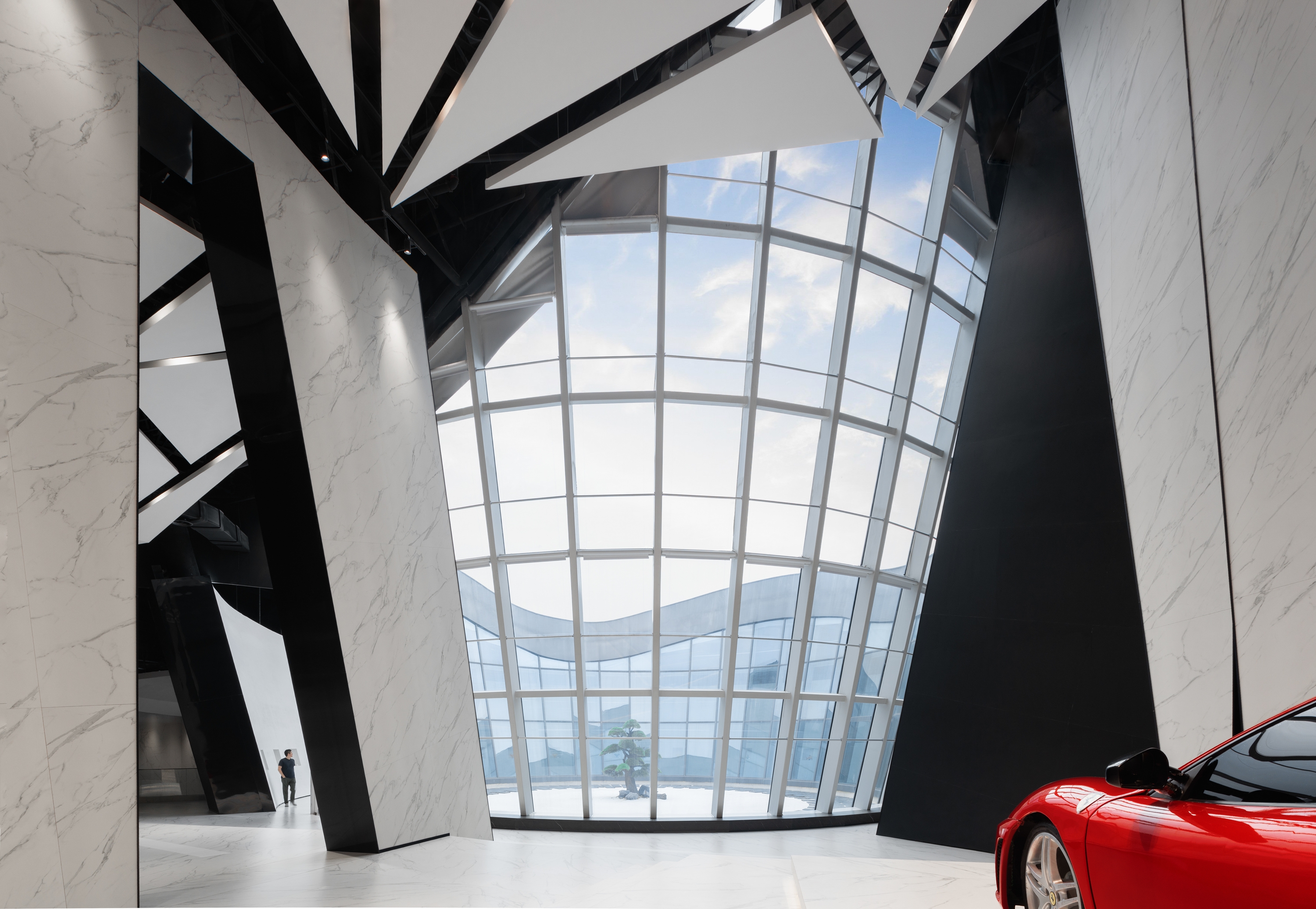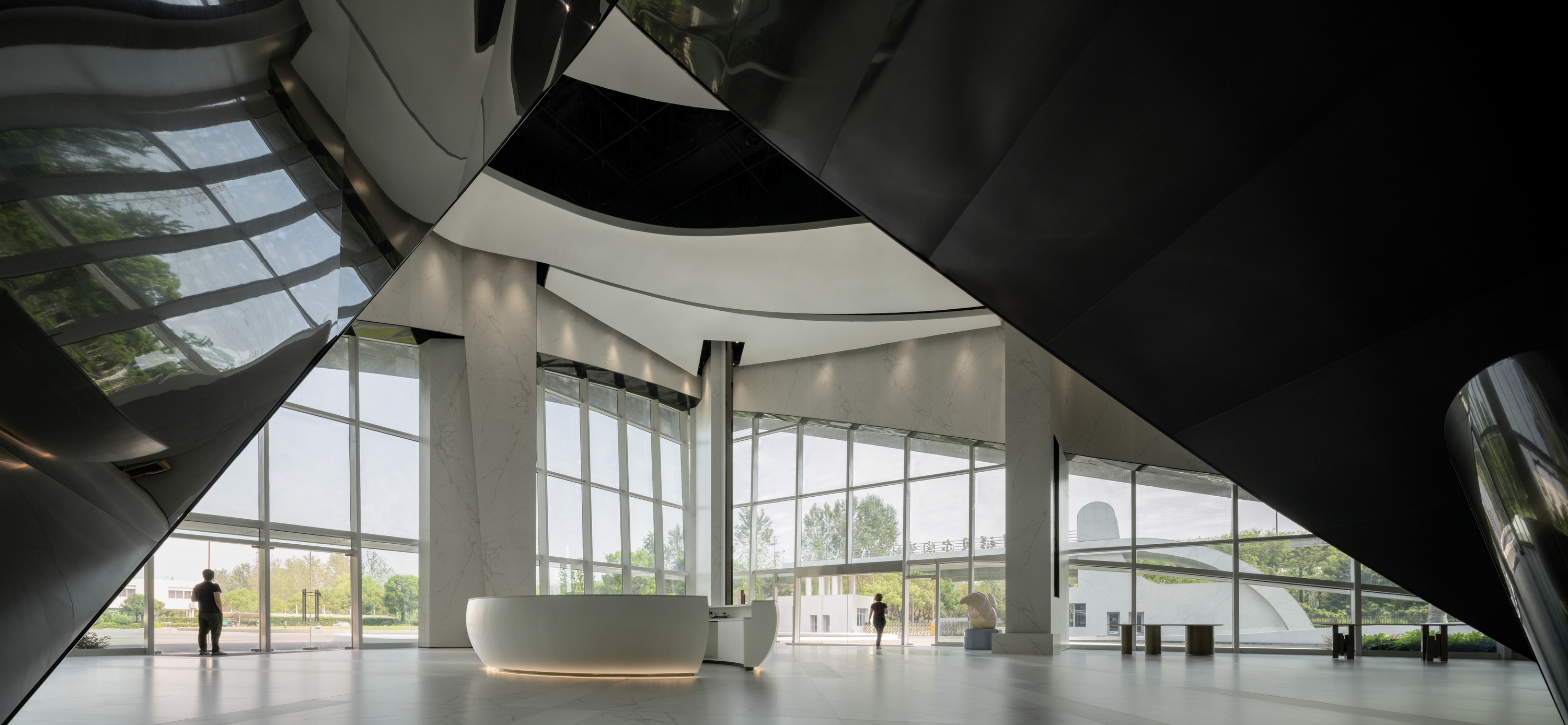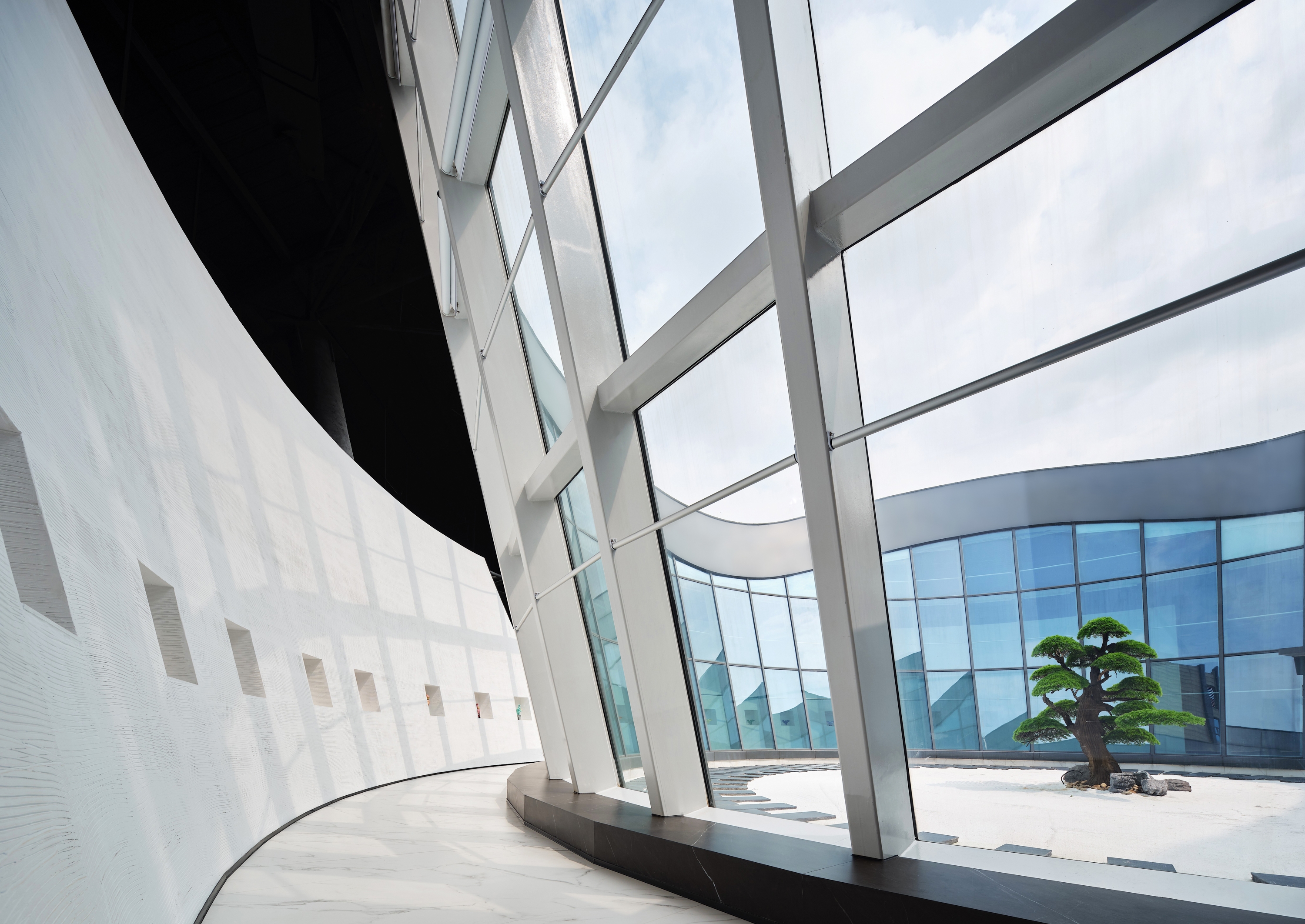 The outer surface of the building is assembled by the large-scale ceramic slab. The slab based on ‘SIMM-TEC’ technology that developed and produced by Nabel. This is the first time in China to use the large-scale ceramic slab for exhibit projecting to establish a new using standard for the construction industry. The overall facade is composed of a large ceramic slab and transparent curtain wall. The vertical solid plate and glass curtain wall highlight the topographical sense of the building surface and form a fascinating and orderly body.