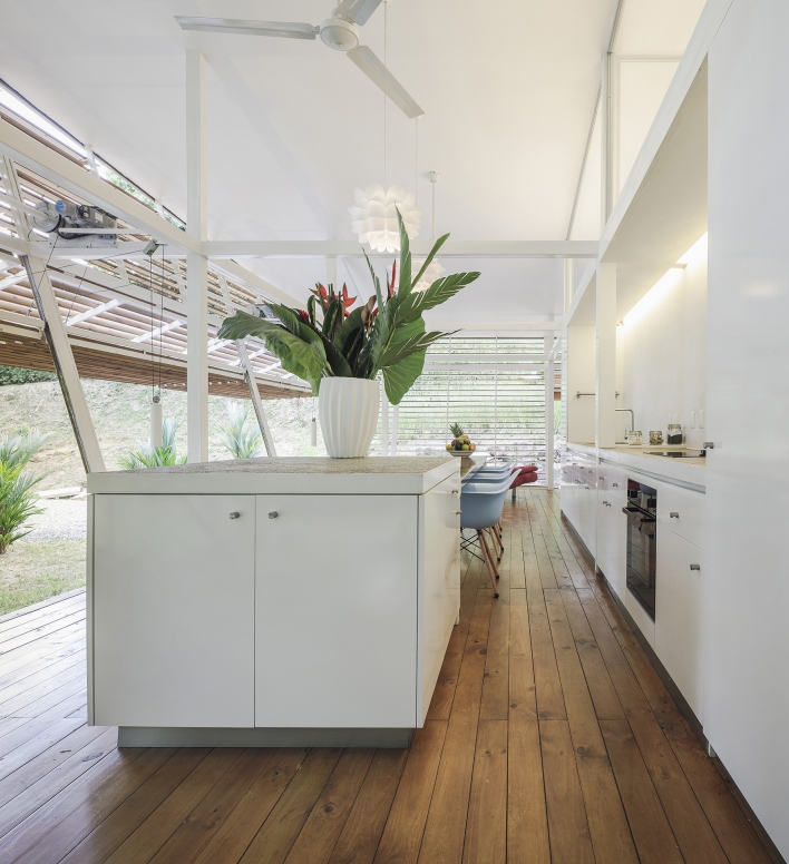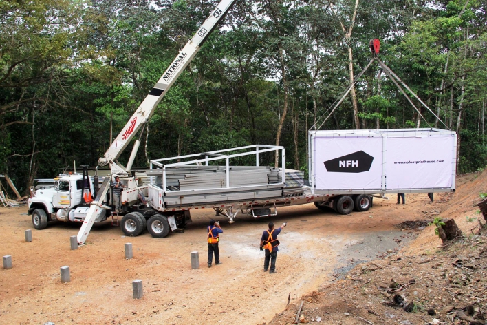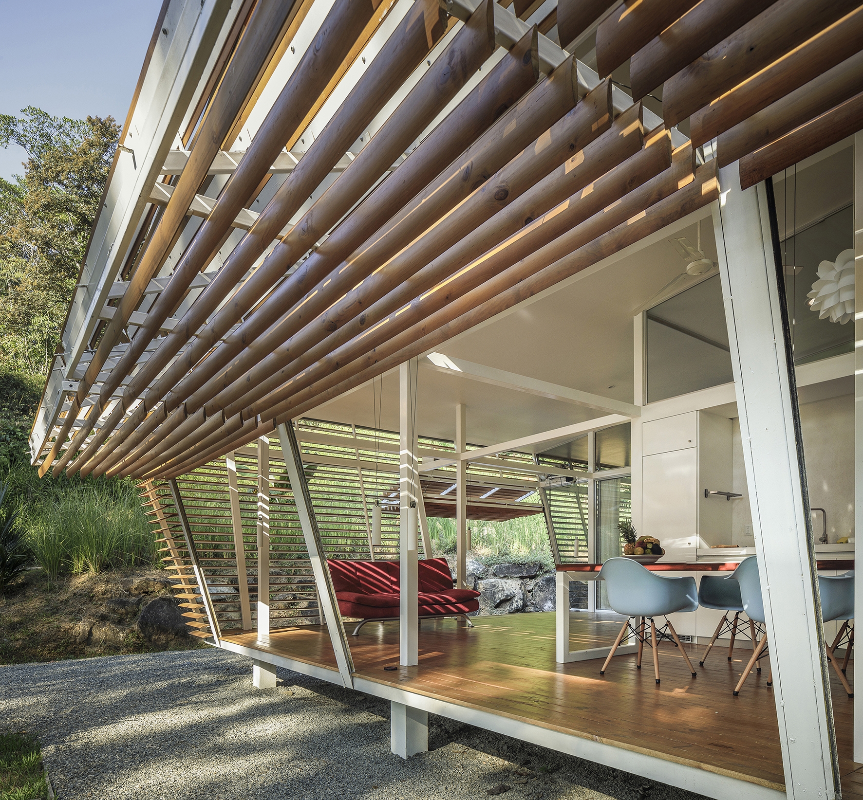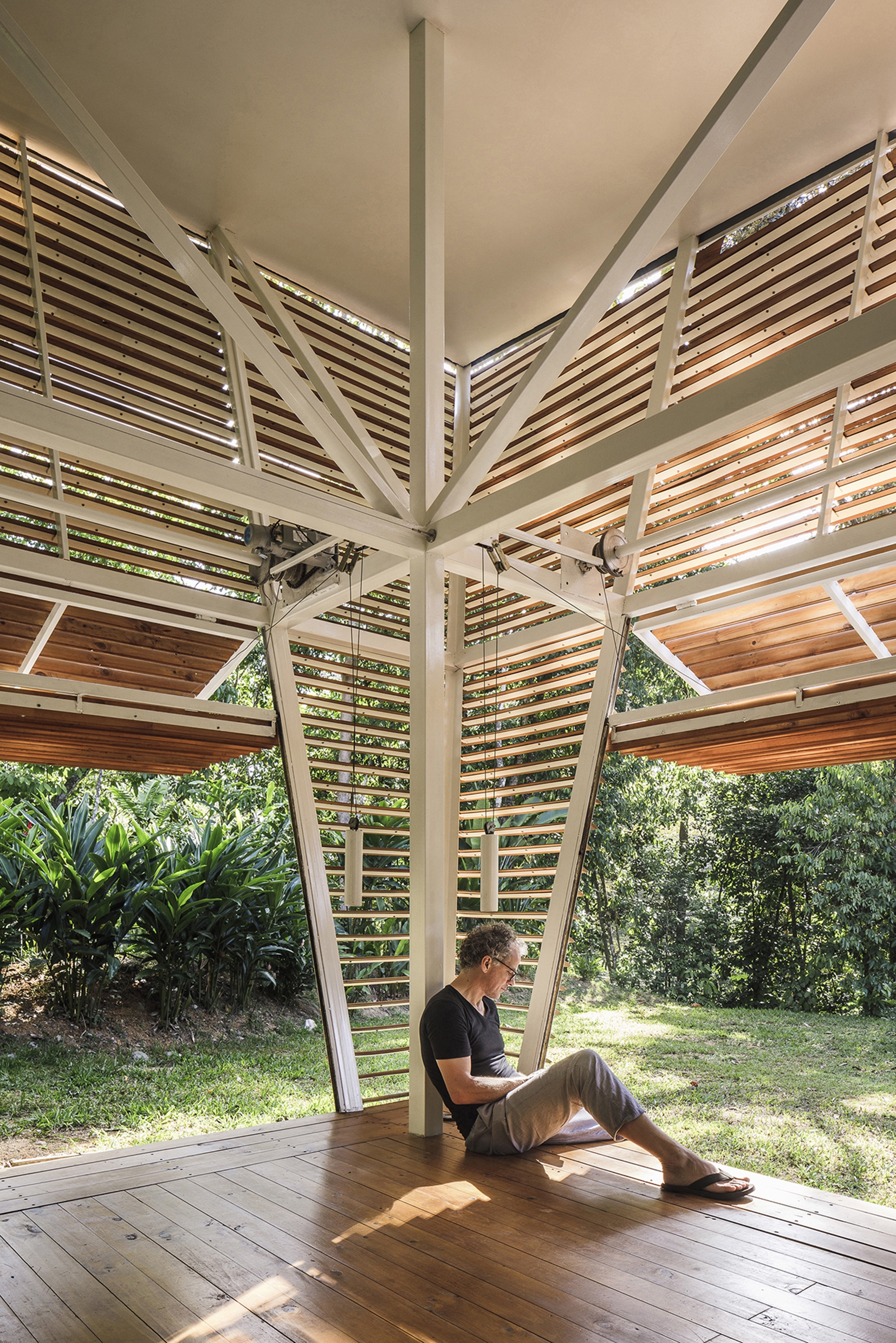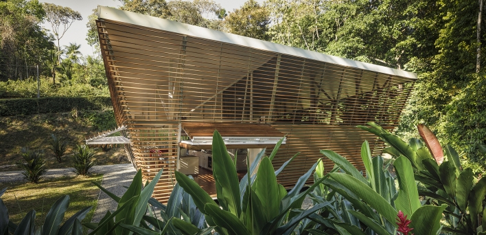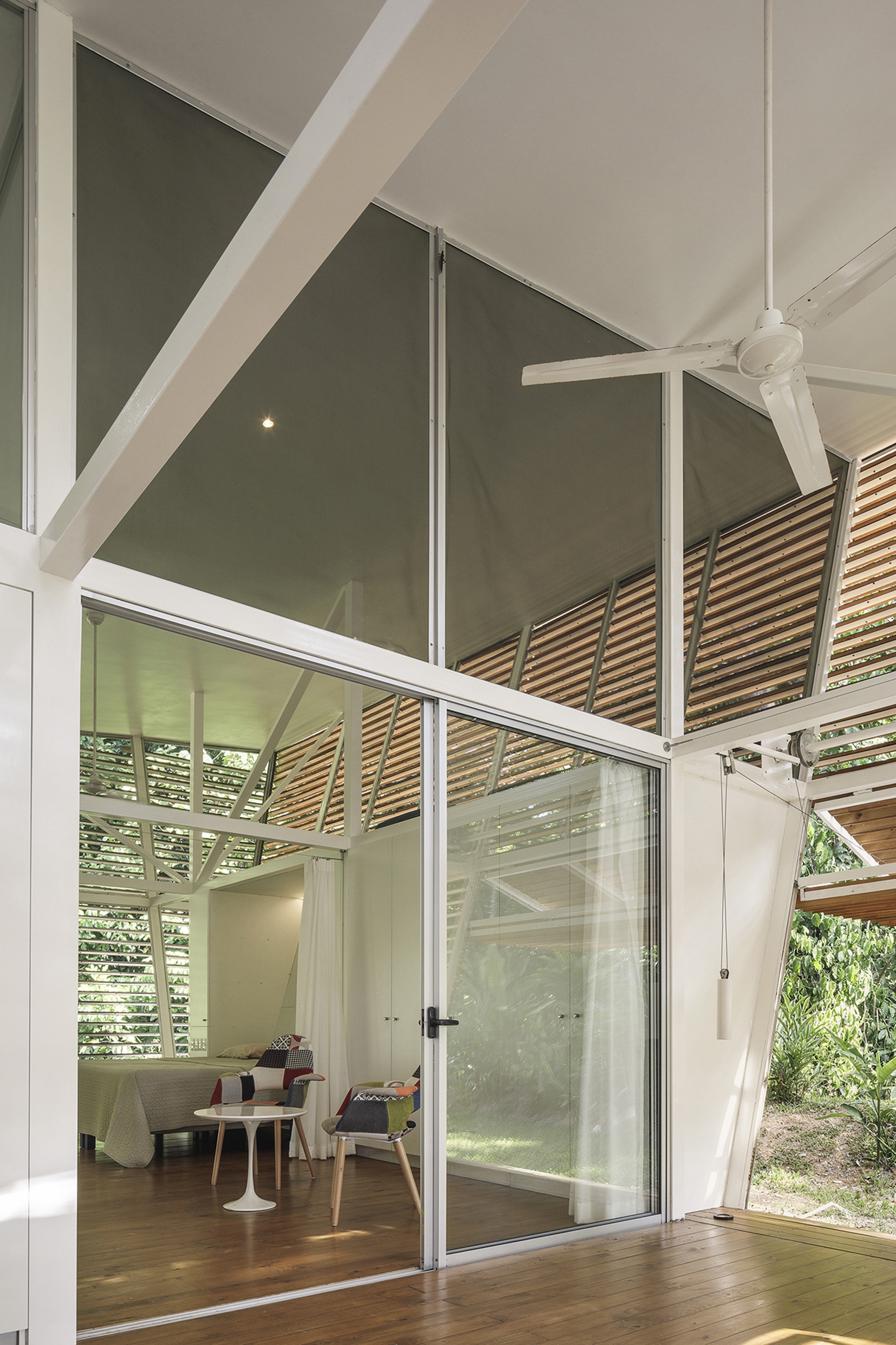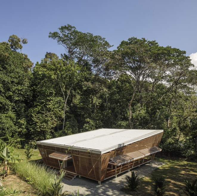 The No Footprint House (NFH) is located in Ojochal, a small village at the edge of the vast tropical rain forests along the southern Pacific coast of Costa Rica. Placed in a humid tropical climate, the building design responds to its surrounding habitat by passive climate control through natural ventilation and solar shading. The NFH is organized around a central service core, which includes all services, machinery and intelligence. The compression of utilities in one compact unit enables an open floor plan all around the core. Moreover, it contributes to the building efficiency in terms of assembly and maintenance. Additional furniture pieces are “plugged” into the double-layered facade, which is created by the vertical structural columns and the inclined outer enclosures. The slanted skin decreases direct impact of sunlight and precipitation, which protects the elevated floorplan from overheating and splashing water. Façade panels can be opened or closed individually in order to regulate views and exposure, augment or reduce air flows, create privacy and security. They convert interior to exterior spaces and play with the dynamic among nature and the built environment.