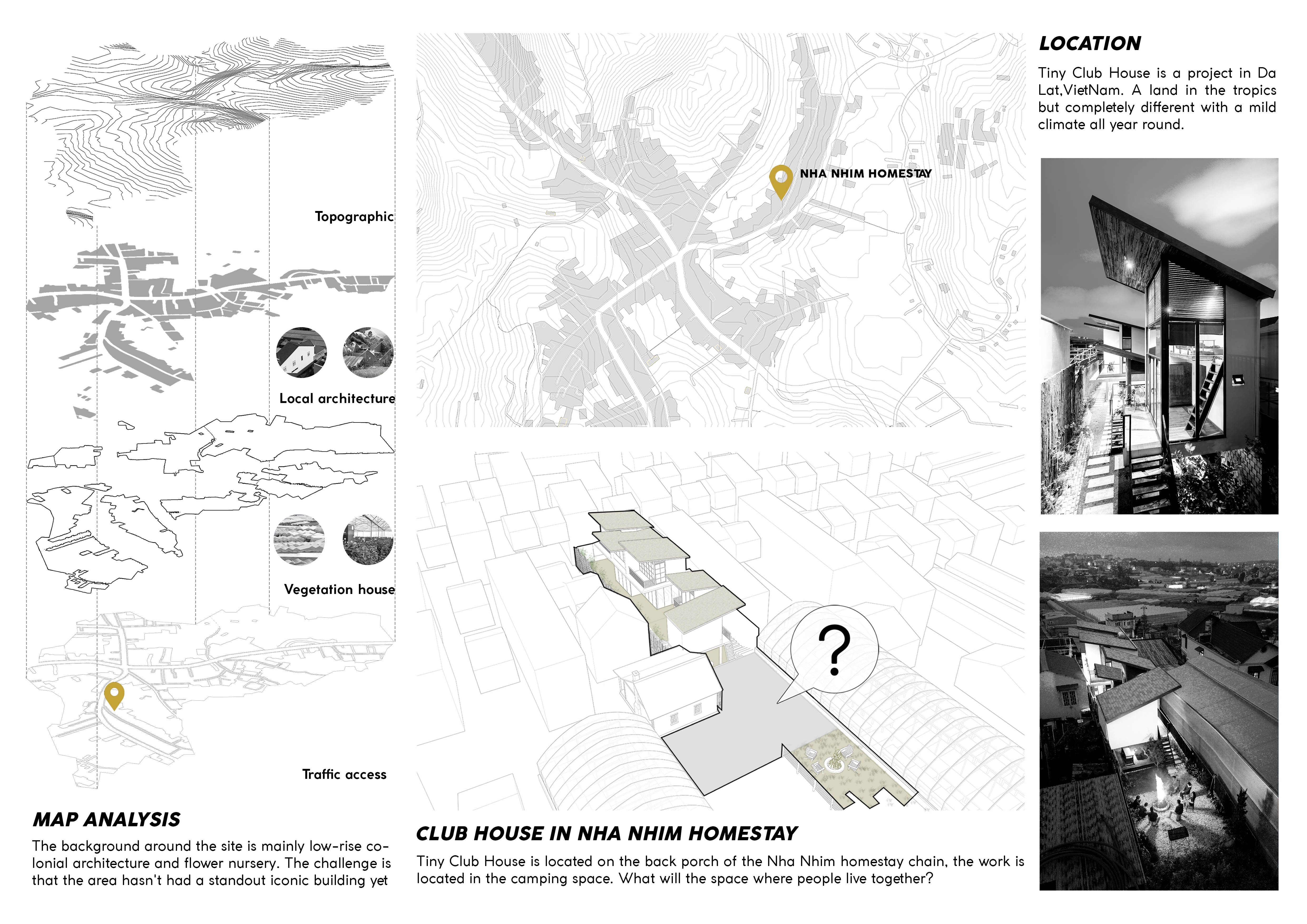 Tiny Club House was born based on the investor's desire to have a space where visitors come to connect and rest space for the manager. The building is located in a camping space where is the back porch of a homestay chain in Da Lat.
