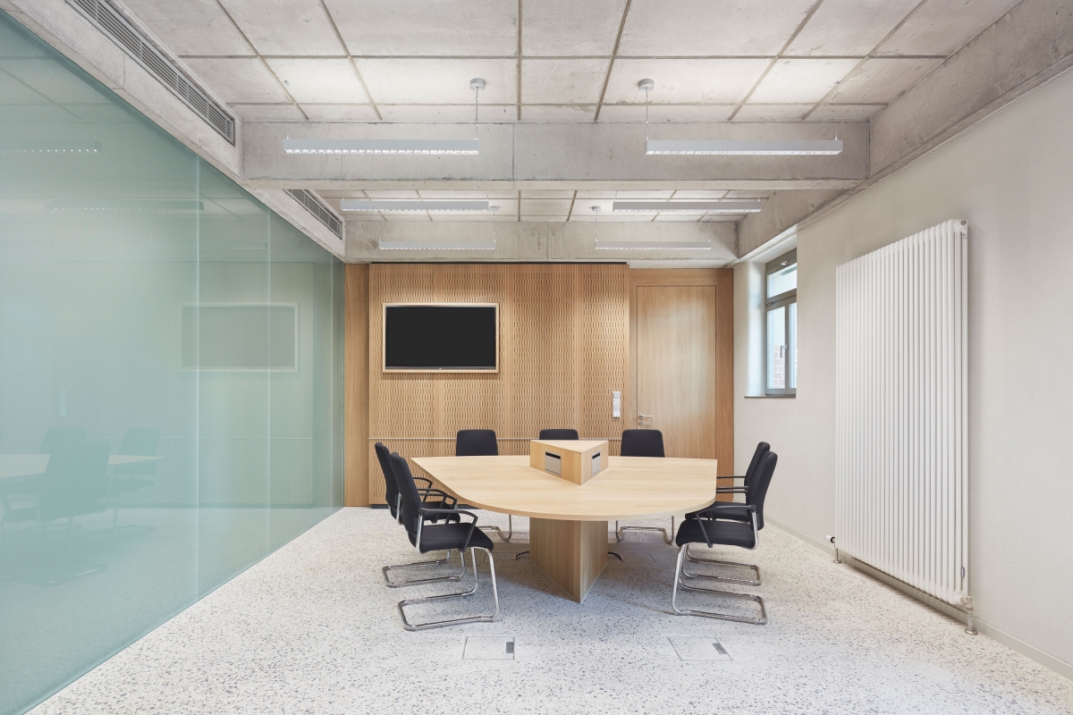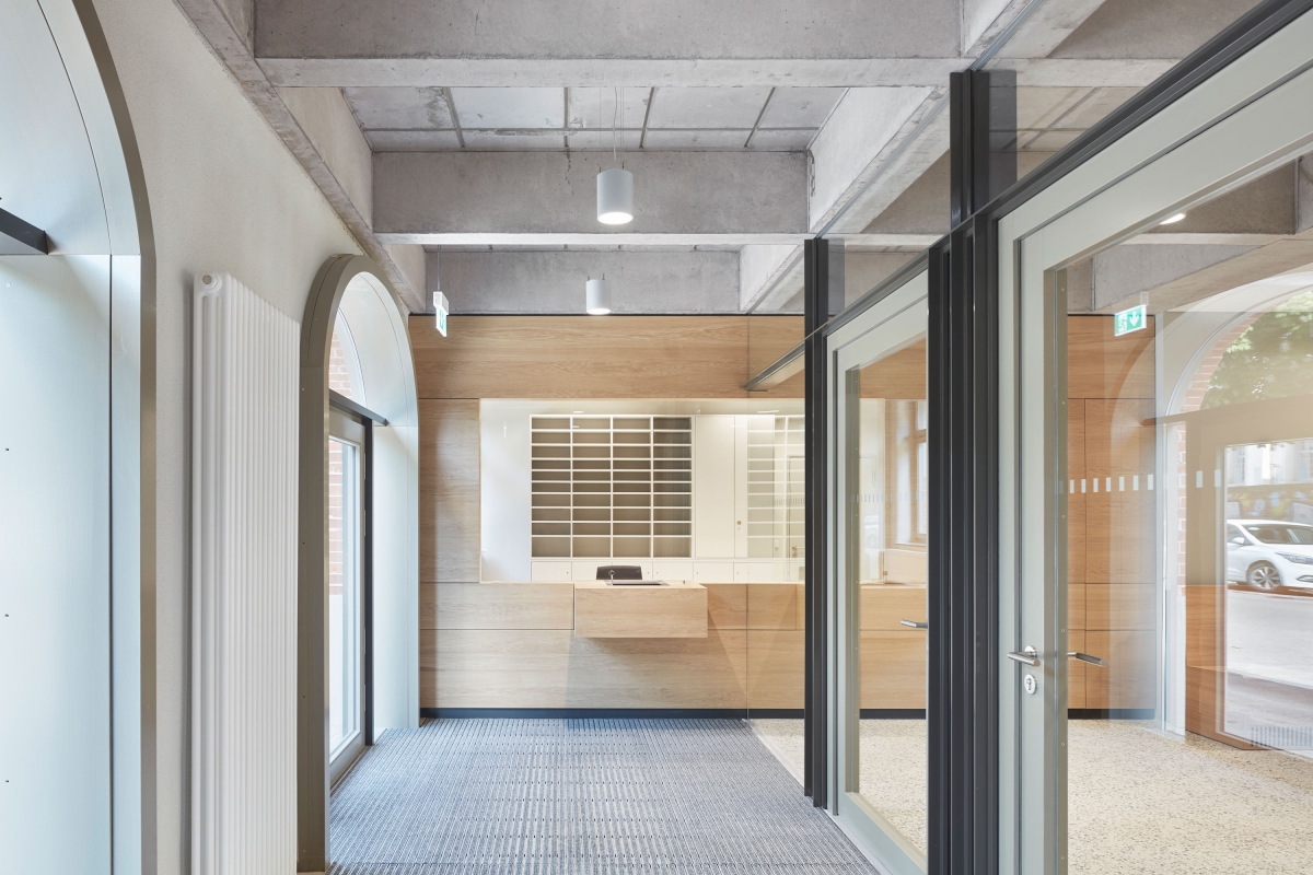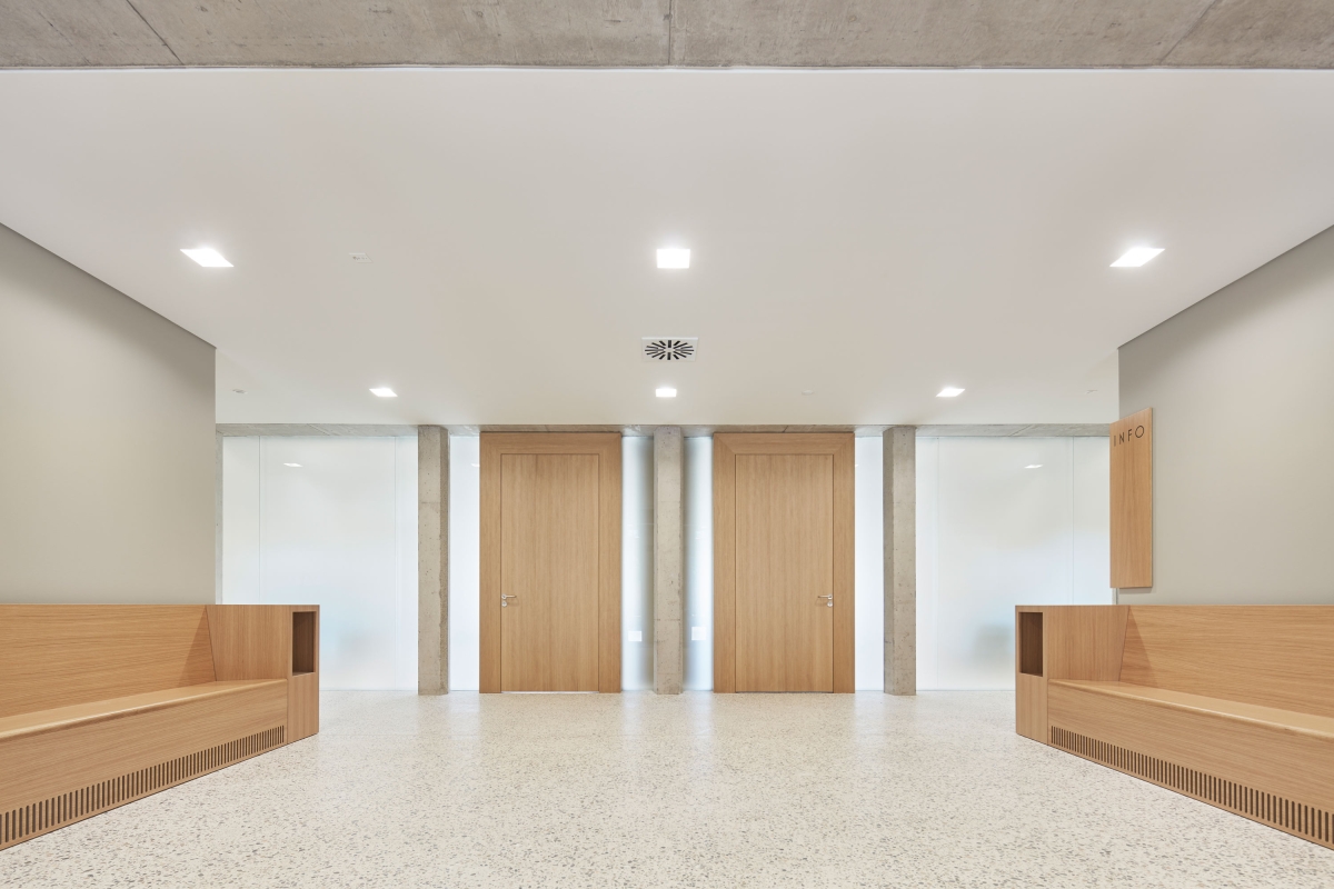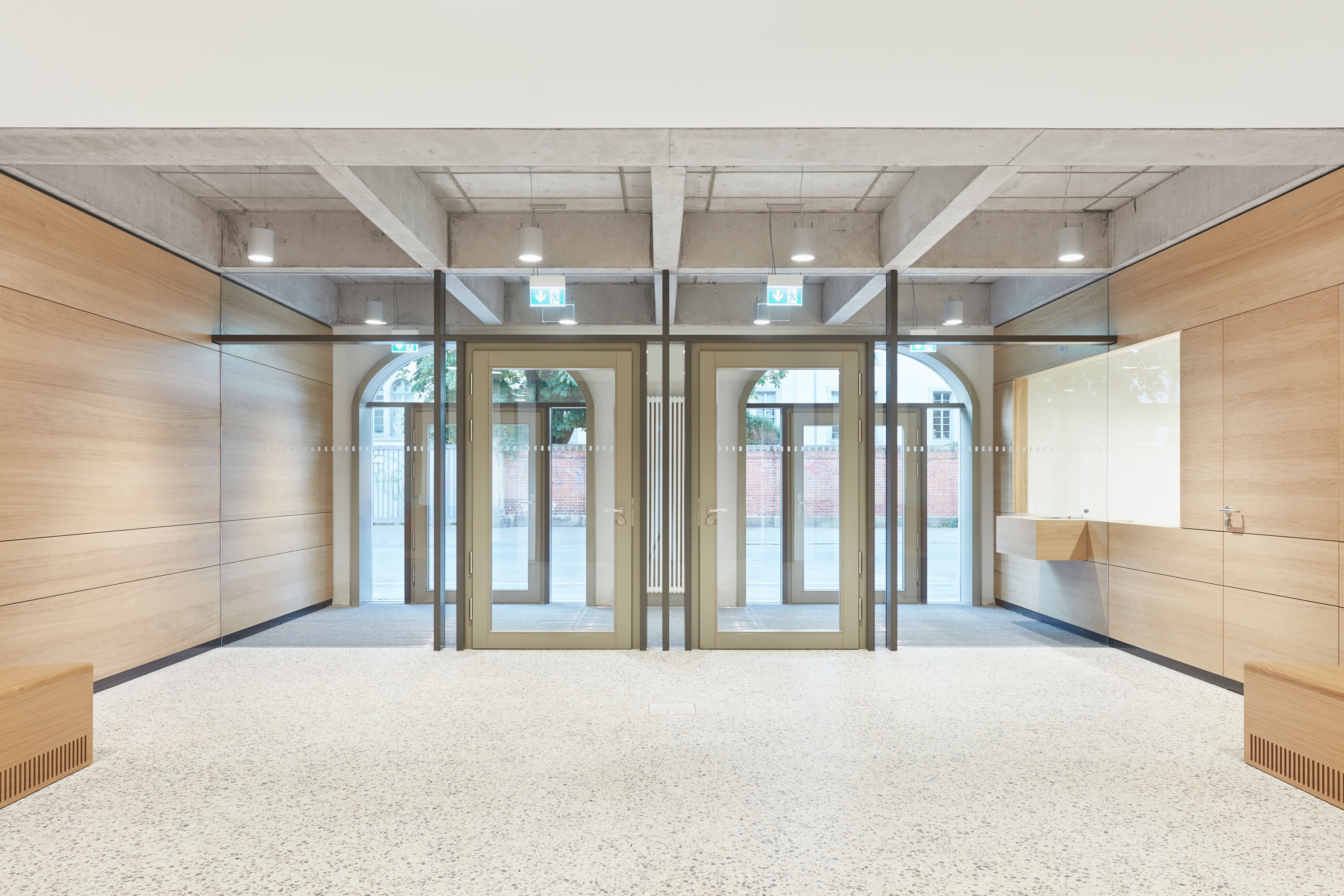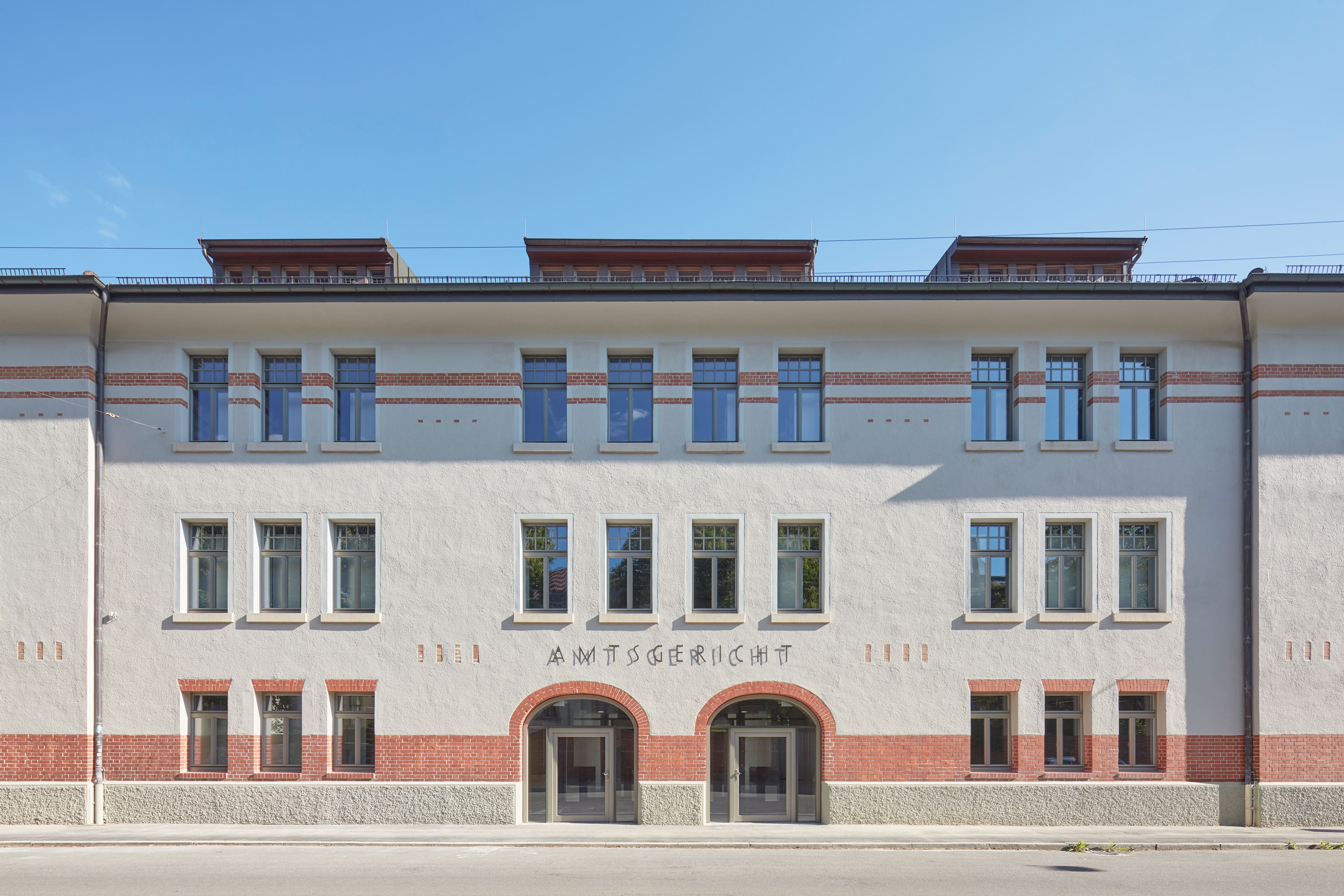 The 1907 chamber building was converted between 2018 and 2021, in a balancing act between military construction and the modern requirements of a place of jurisdiction. Due to its use as a vehicle hall, the fabric of the building had been severely damaged, which made it necessary to replace the ceiling above the ground floor with extensive support measures.The former garage doors to the rear were opened up to allow light into the courtrooms. Reminiscent of the wooden gates, the glass panes are staggered in terms of their depth, lending the façade a moving pictorial quality.The inserted reinforced concrete ceiling, attached to the expression of the removed ceiling, is visible in places as a construction. Roughly plastered walls and the sanded, exposed screed contrast harmoniously with the oak wood of the furnishings, while asymmetrical reinforced concrete columns pick up dynamically on the brittle nature of the earlier functional building.The careful confrontation of the original and the contemporary enabled the functional transformation into an atmosphere of respect for a place steeped in history.