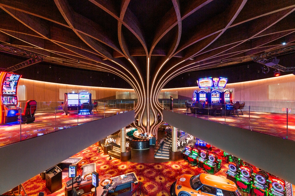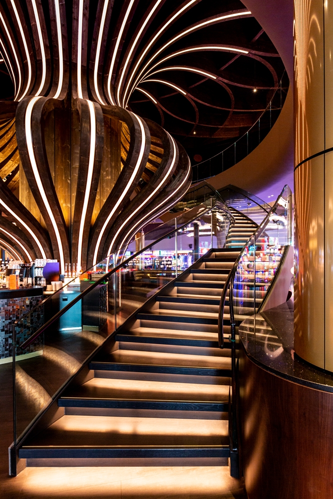 A generous, Vegas-style porte-cochère leads guests into the centre of the building, where they find themselves in the heart of the giant flower. The interior, with its inviting bar and gaming spaces, revolves around the curving wooden ‘stem’ in the casino’s core. This sculptural structure evokes the proud Dutch shipbuilding tradition.