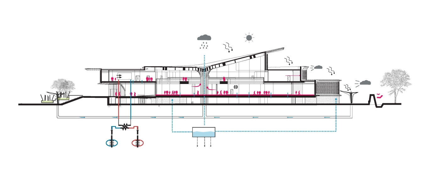 The total concept is based on biomimicry. The building is a self-regulating organism with a skin, skeleton, metabolism and brain. The Trias Energetica method determines its energy management, (EPC 0.34, equivalent to Breeam Outstanding). This is the best-ever energy performance for this type of building.