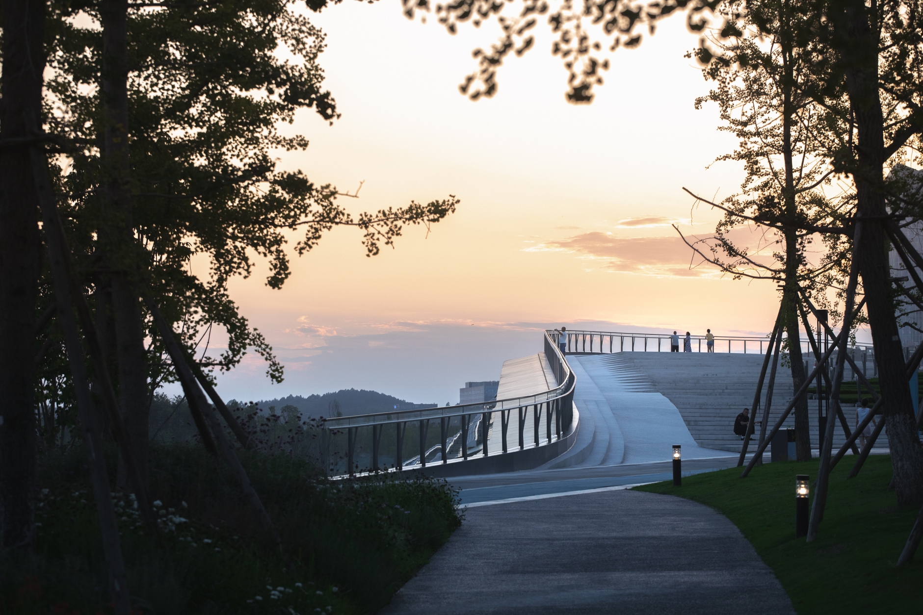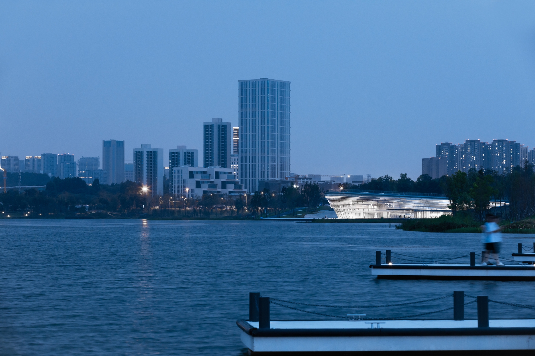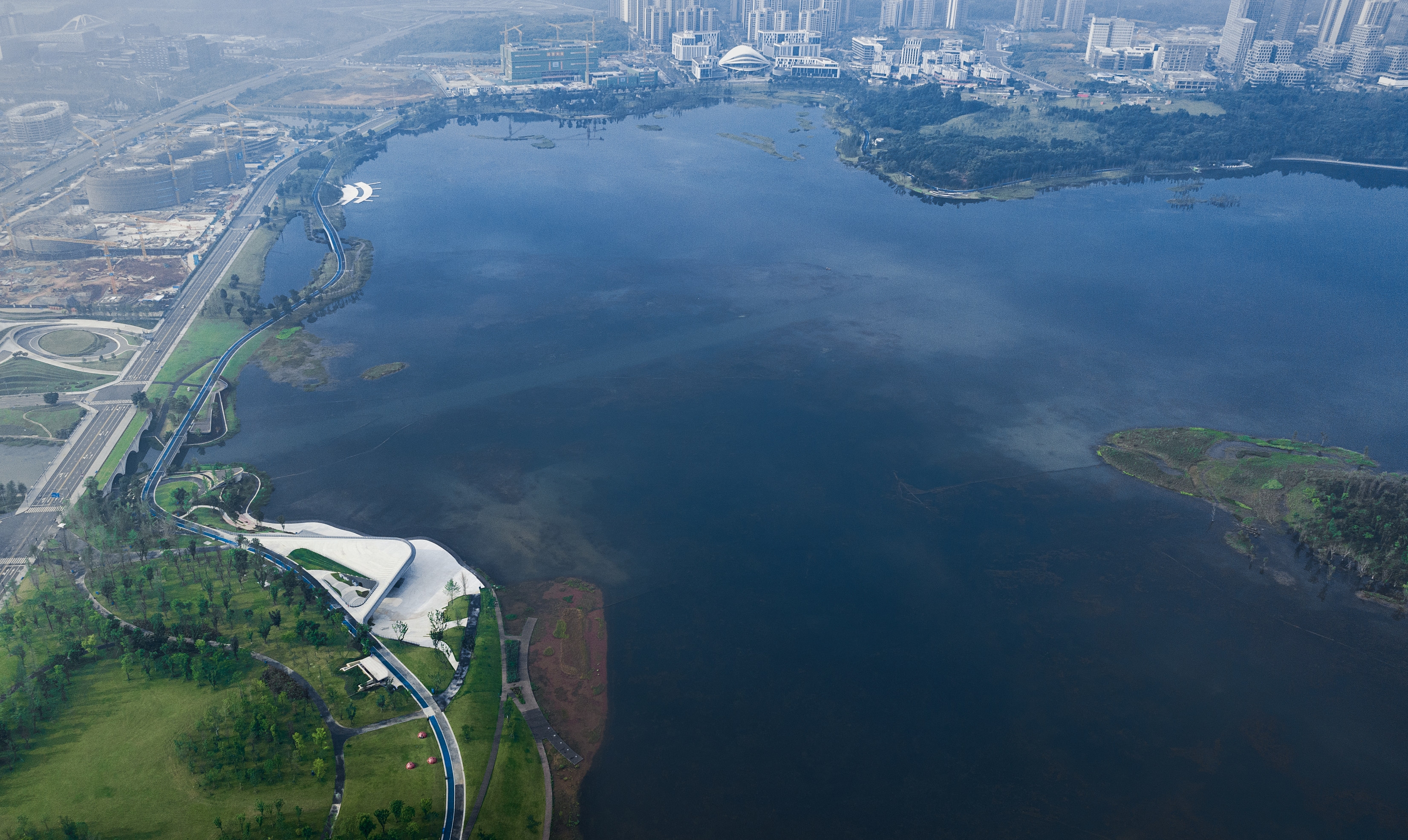 The Roadshow Centre is located in the largest open area of the city, adjacent to the lakeshore, with a unique view up to 3km. The building is fully integrated into the landscape, with the exposed volume twisting slightly to form a modest viewing platform for the park side, on the other side, a series of spaces for diverse public waterfront activities. The simple form of the building, with its rough sense of materiality, is seen from afar as if a beast in the lake suddenly leapt out of the water, frozen and integrated into the environment.