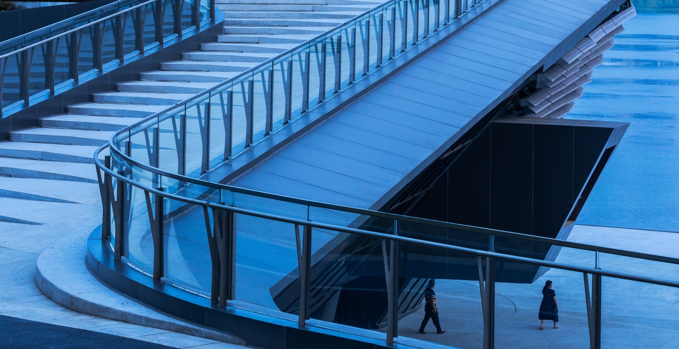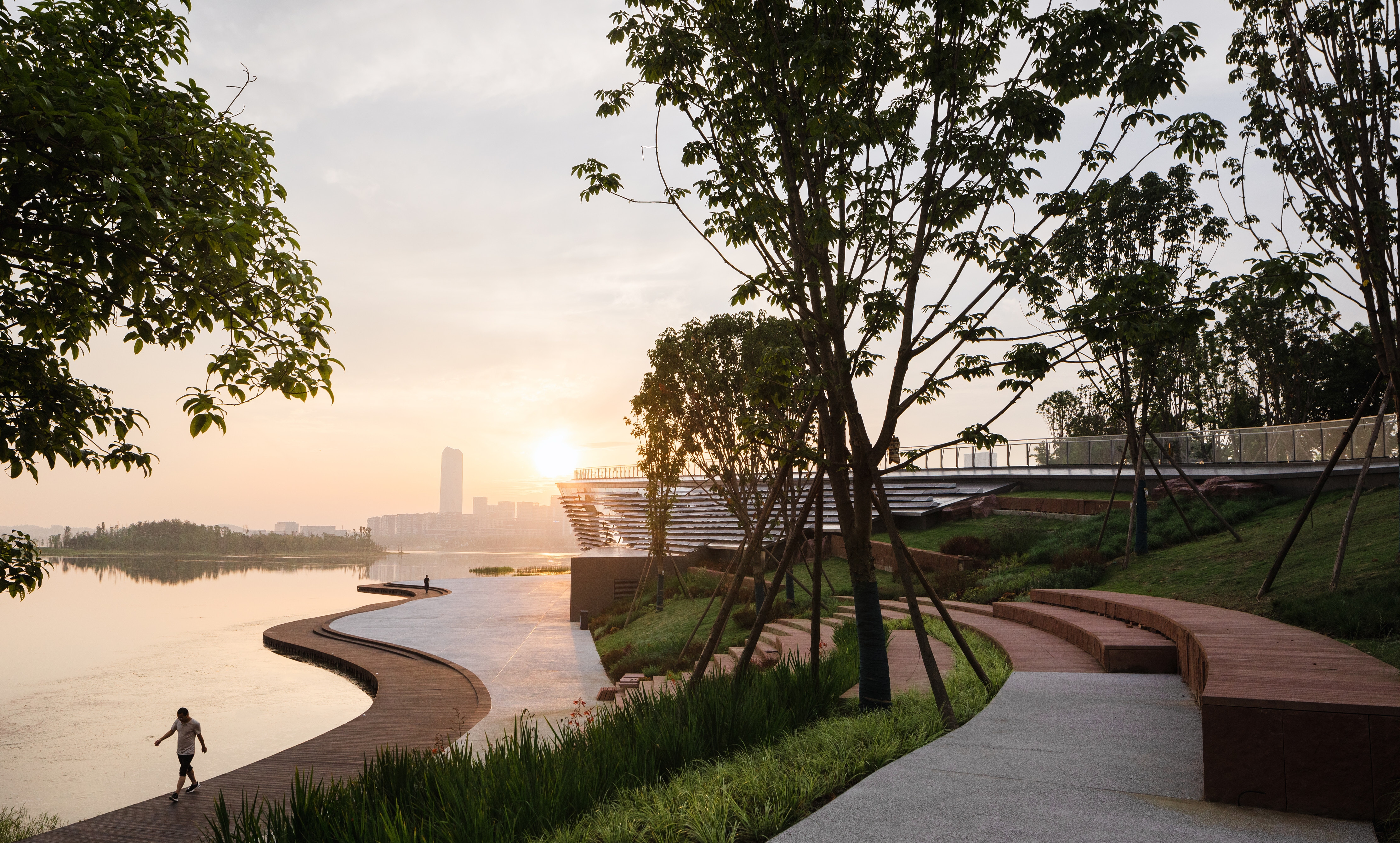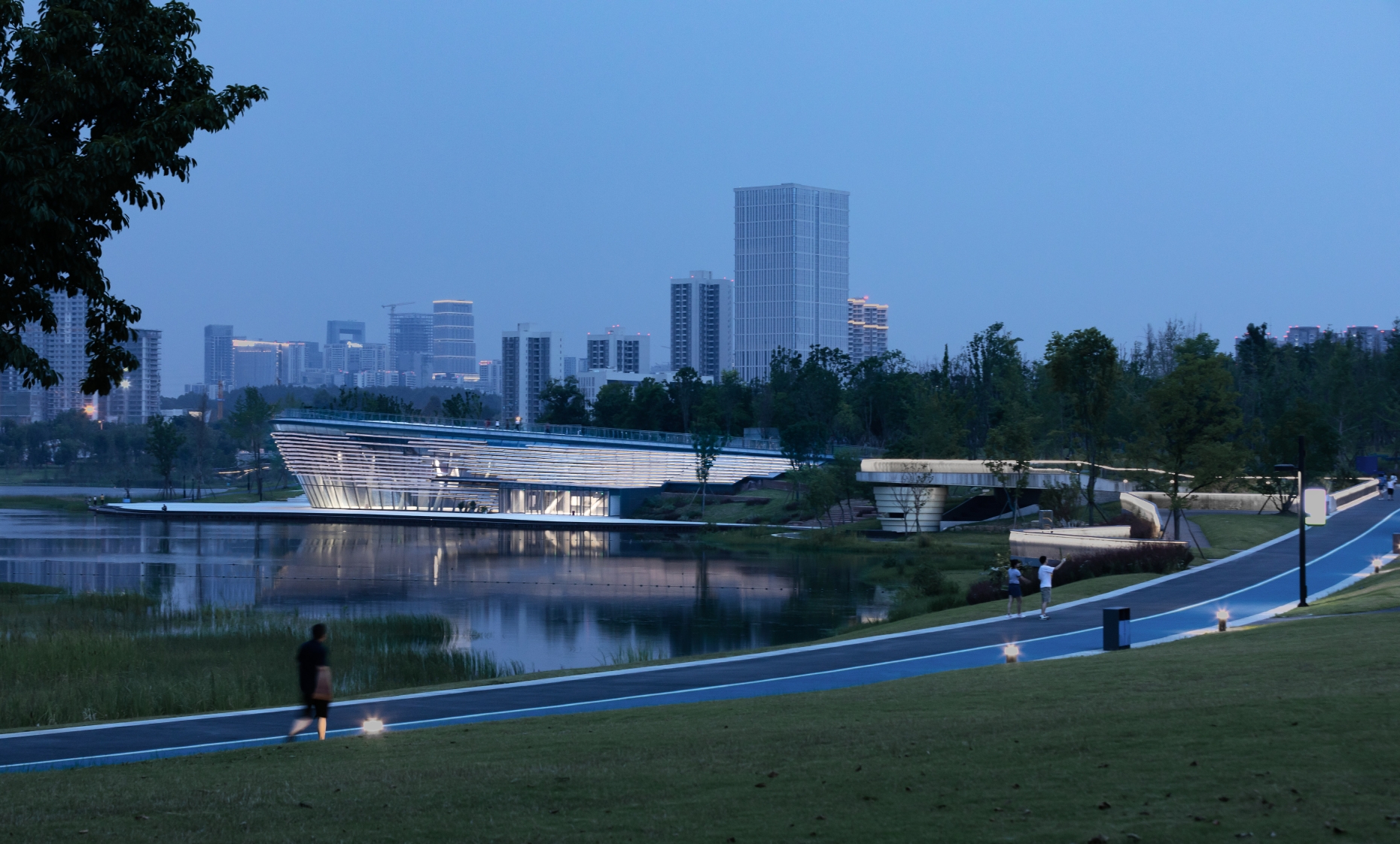 The Roadshow Centre is located in the largest open area of the city, adjacent to the lakeshore, with a unique view up to 3km. The building is fully integrated into the landscape, with the exposed volume twisting slightly to form a modest viewing platform for the park side, on the other side, a series of spaces for diverse public waterfront activities. The simple form of the building, with its rough sense of materiality, is seen from afar as if a beast in the lake suddenly leapt out of the water, frozen and integrated into the environment.