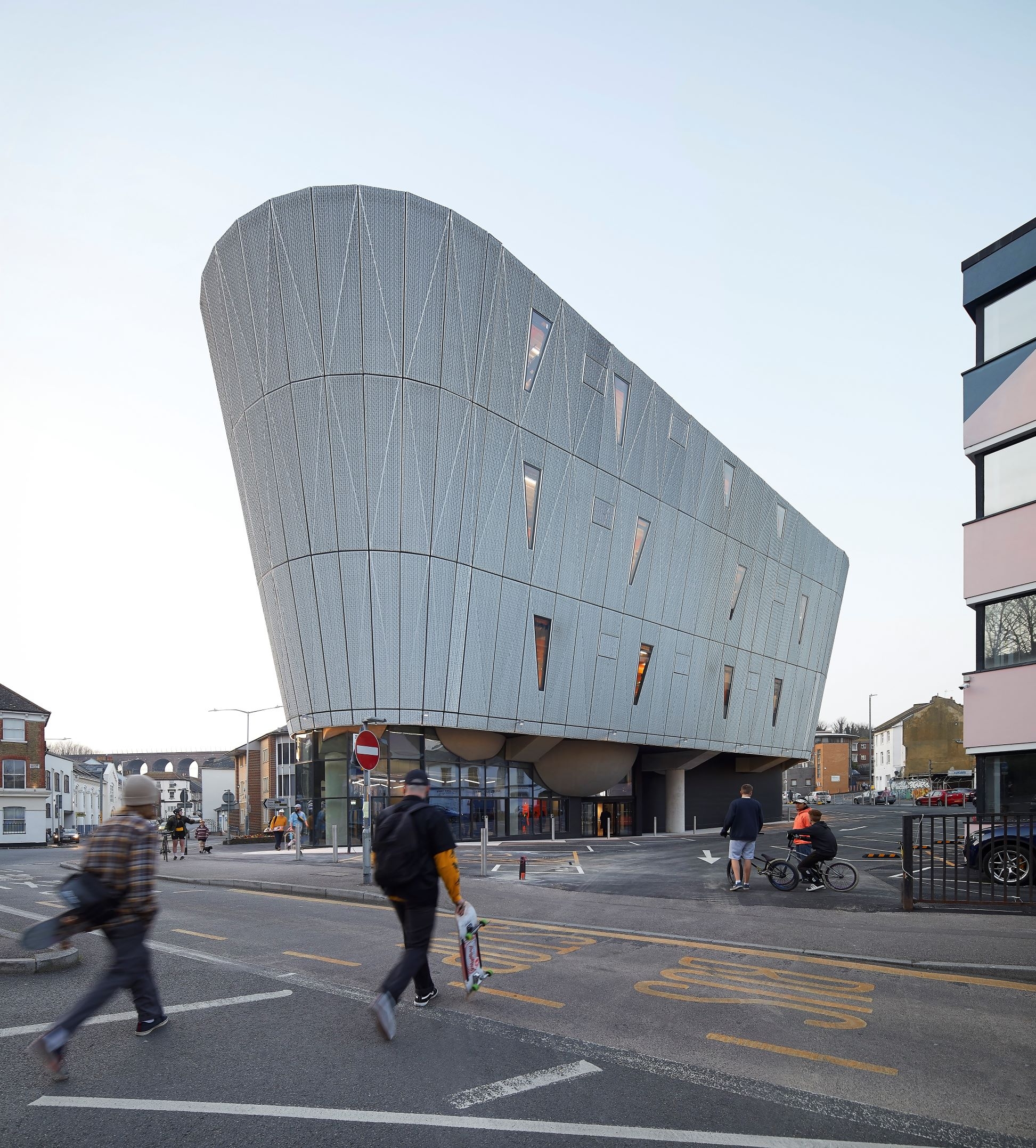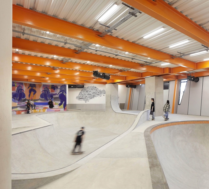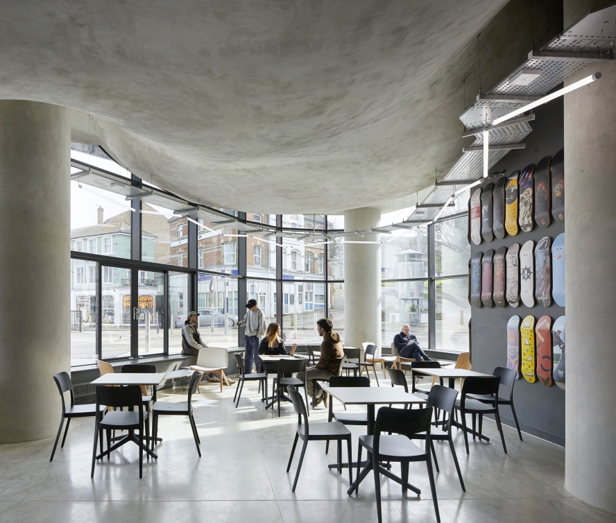 Hollaway Studio has designed the world’s first purpose-built multi-storey skatepark in Folkestone, as part of a major ongoing programme to regenerate the seaside town. Featuring three levels of high quality skateparks, boxing gym, climbing wall (the tallest in the south-east of England) and café space, this landmark building embeds extreme sports, normally banished to the outskirts, right in the heart of town. It is a central hub for youth culture, building confidence and providing independence through mobility. By prompting us to push physical and mental boundaries, within the context of beauty and surprise, F51 not only facilitates thrills but also adds to them.