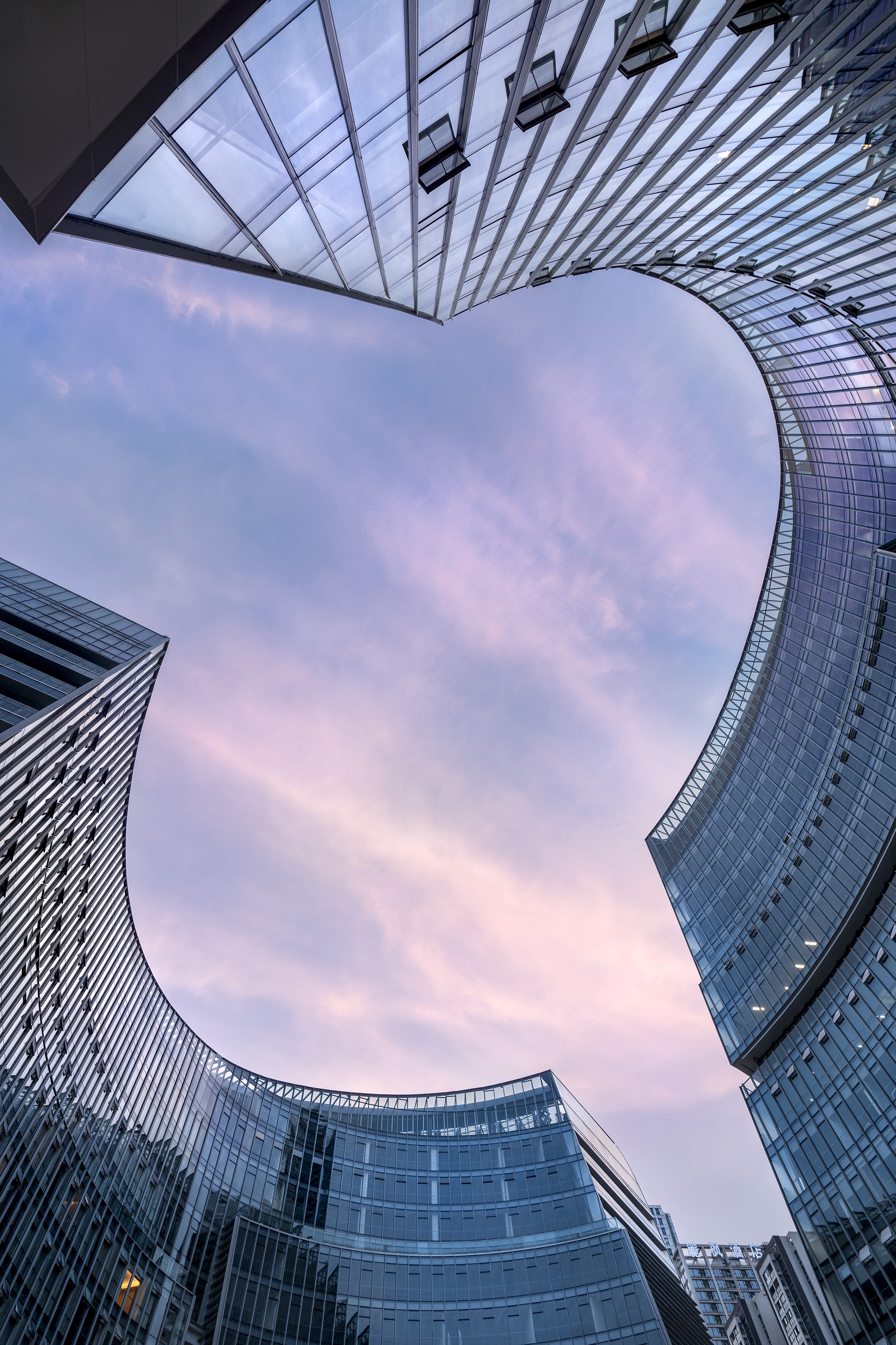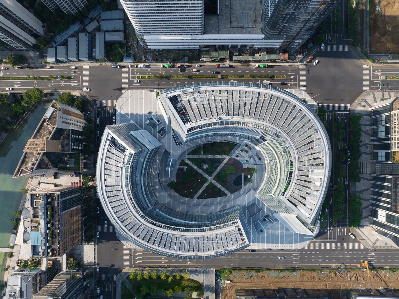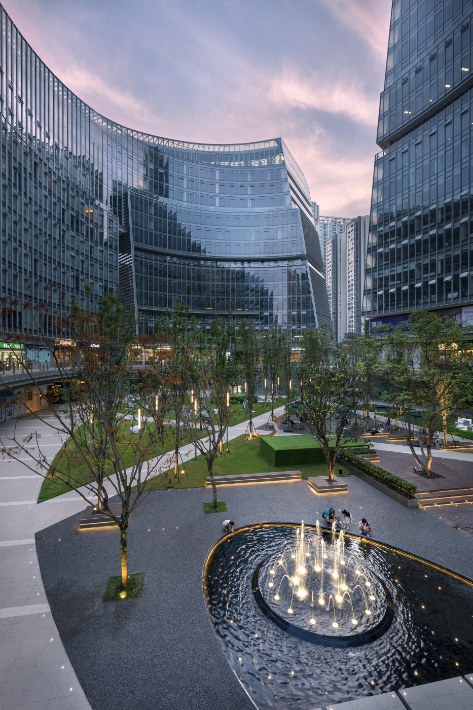 Emerging from the rigid urban grid of the neighboring district, the project is a striking composition of multiple layers applied to a seemingly endless spiral. The ascending and descending halves of the spiral dance around the block, encircling the site with sensuous undulating forms. The two opposing crescents float around an elliptical oasis like Koi fish passing in a pond. The urban garden created within the crescents is contraposed to surrounding high-rise towers in a whimsical nod to the orthogonal grid in which it resides.