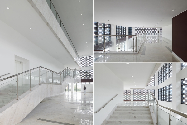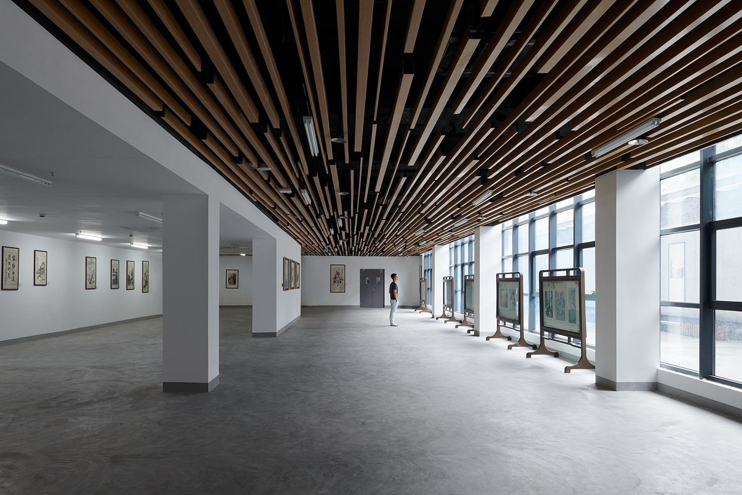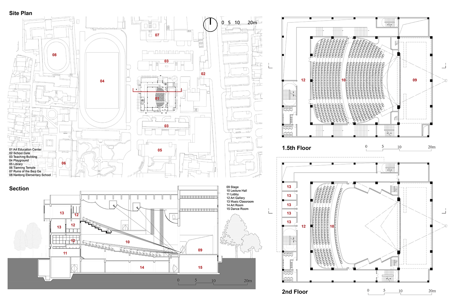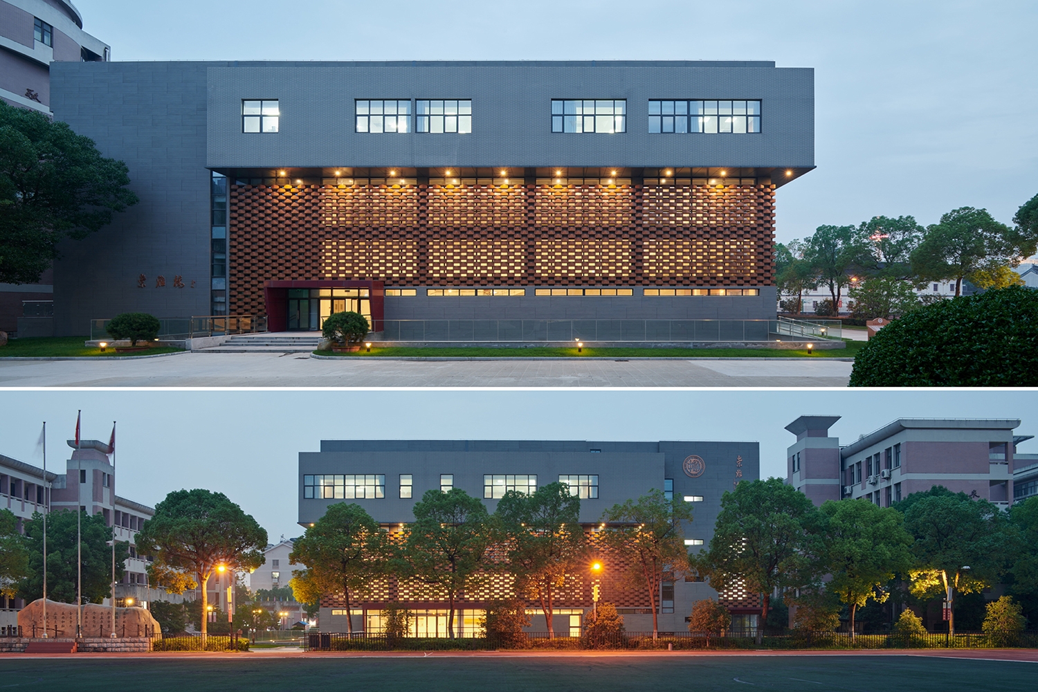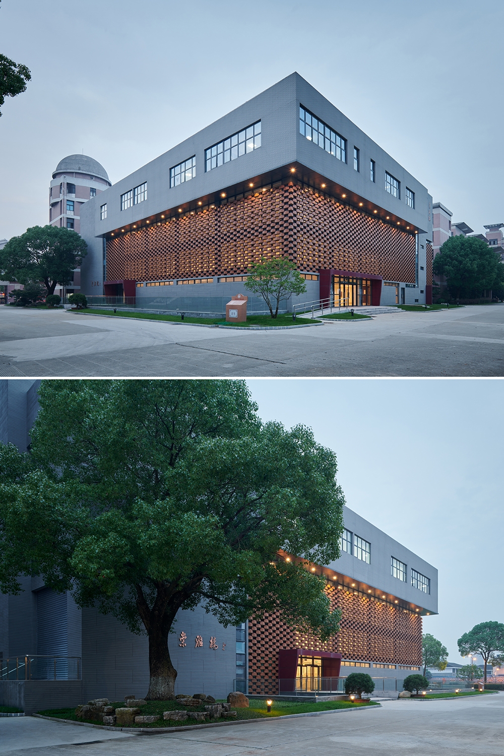 This project is located in a century-old high school on the north side of Hao River Scenic Area in Nantong Old Town. Adjacent to existing buildings on three sides, the volume and height of the site are limited, and the functional requirements of the Center for Art Education are relatively complicated. The building is a transition point between the historical context and the current campus culture. For this reason, the design team aimed to reconstruct the organization of the site and rethink the relationship between old and new through the process of “abstraction – combination – adjustment”. The art gallery ultimately connects the core spaces to construct a complex that builds on the history of Nantong High School while also satisfying the needs for campus art and cultural activities, like a monolith floating on a sea of art. In addition, its form and facade also dialogue with the surrounding areas, opening up the campus from a cultural perspective and enhancing the vitality of public space.