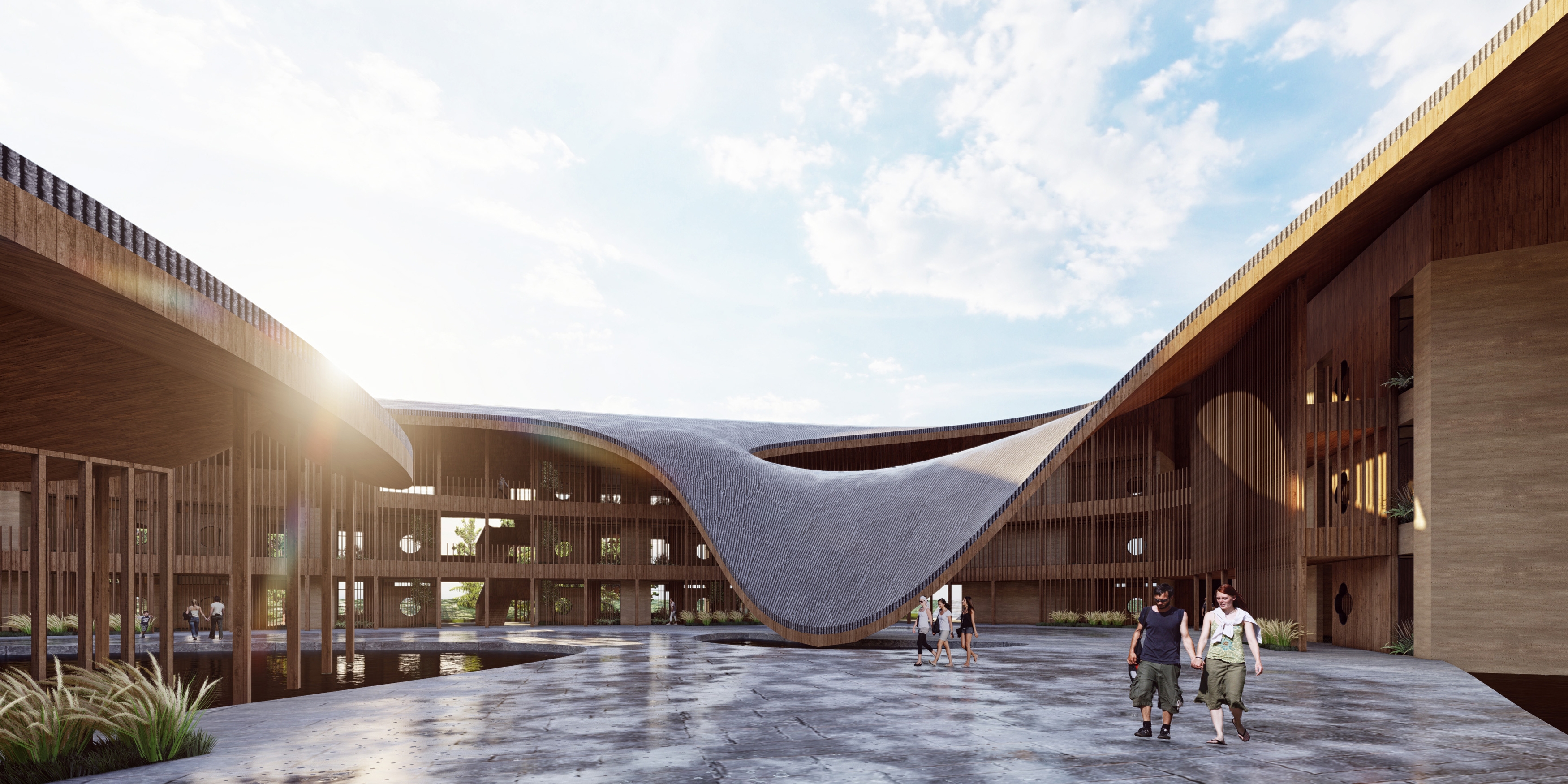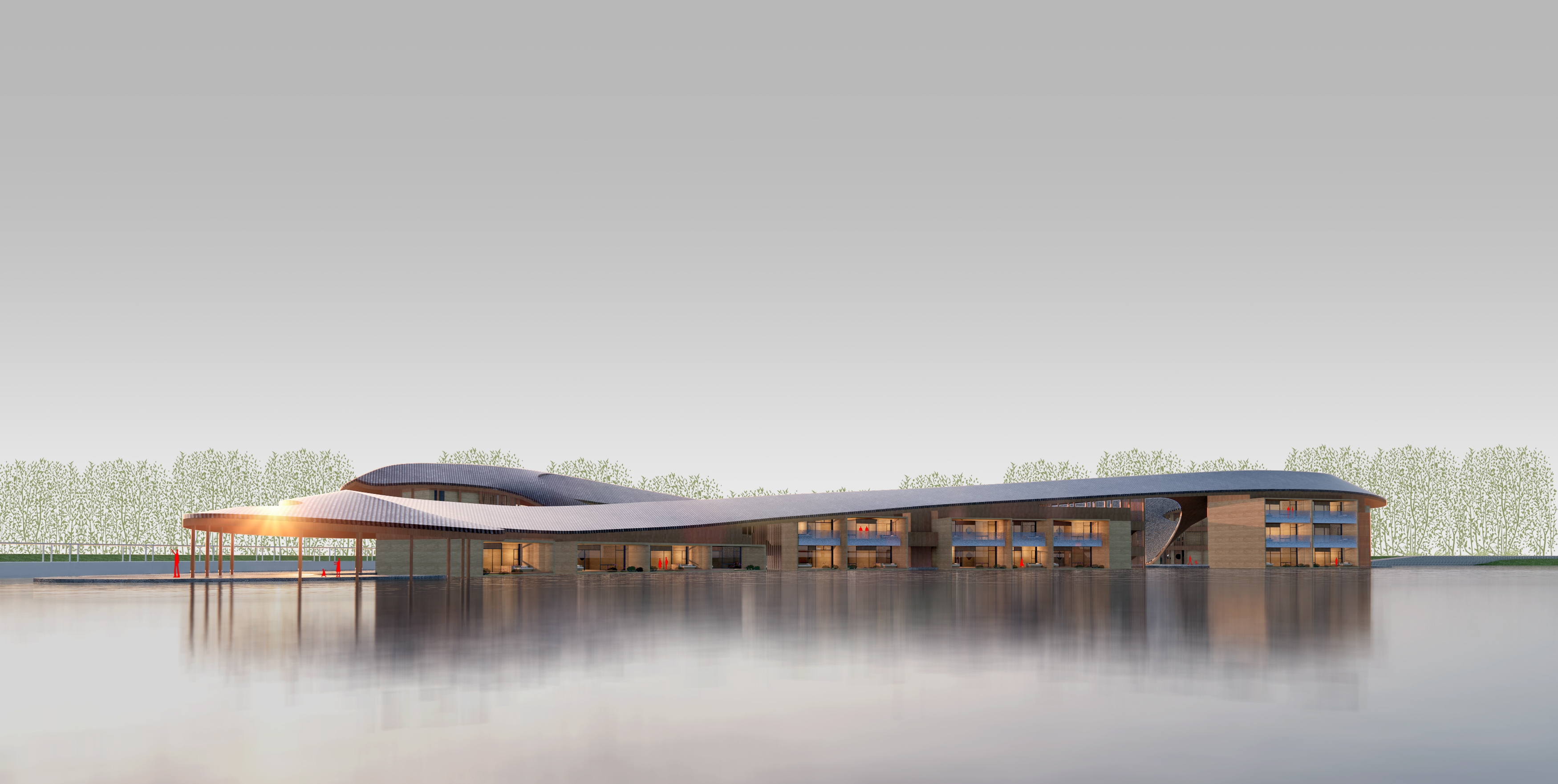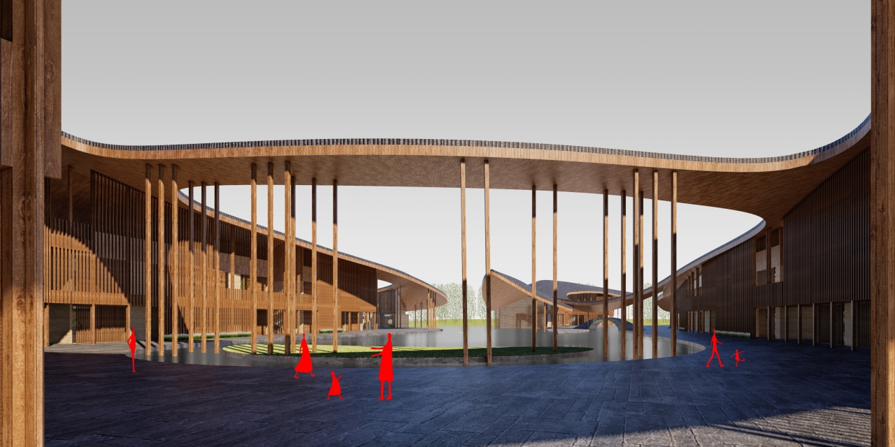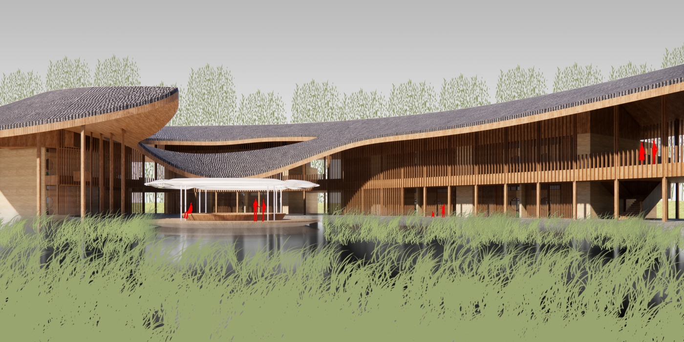 Inspired by the regional vernacular building, pitched roof, wood structure, and rammed earth wall are adopted to create a modern version of water town Shangri-La.