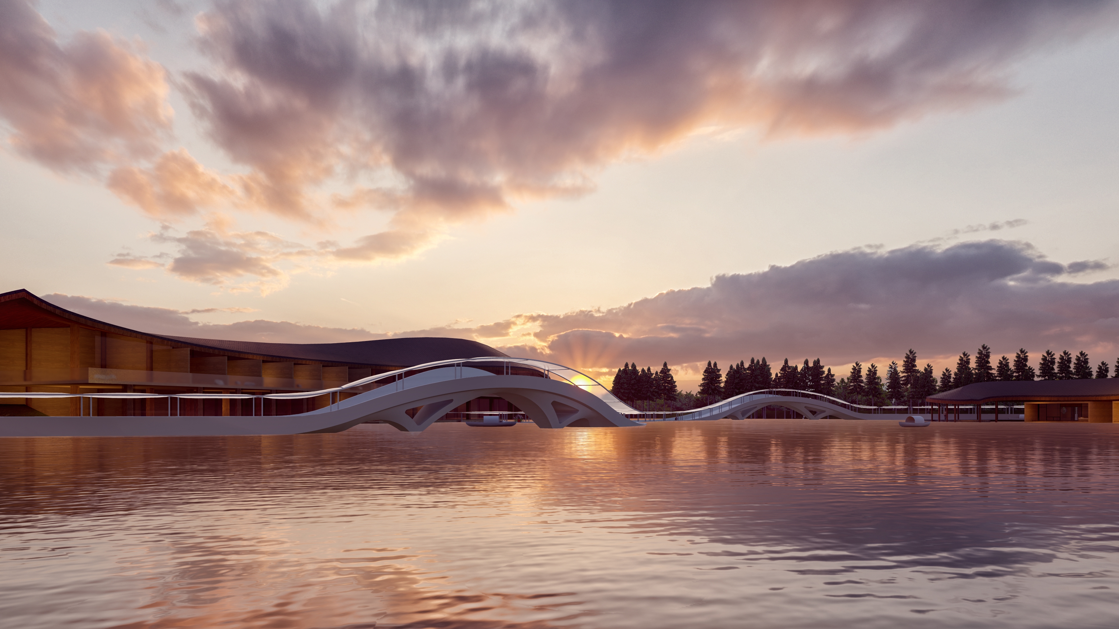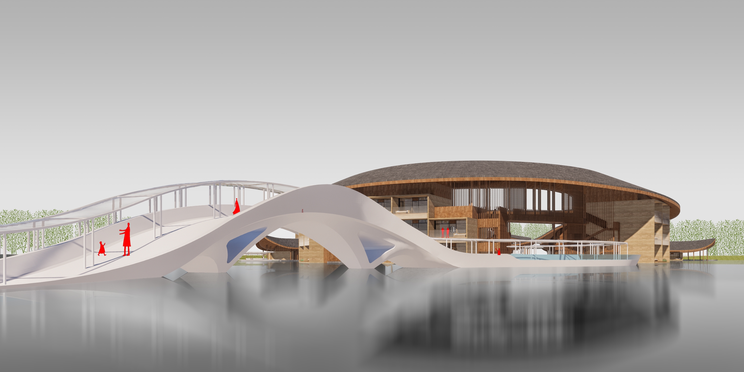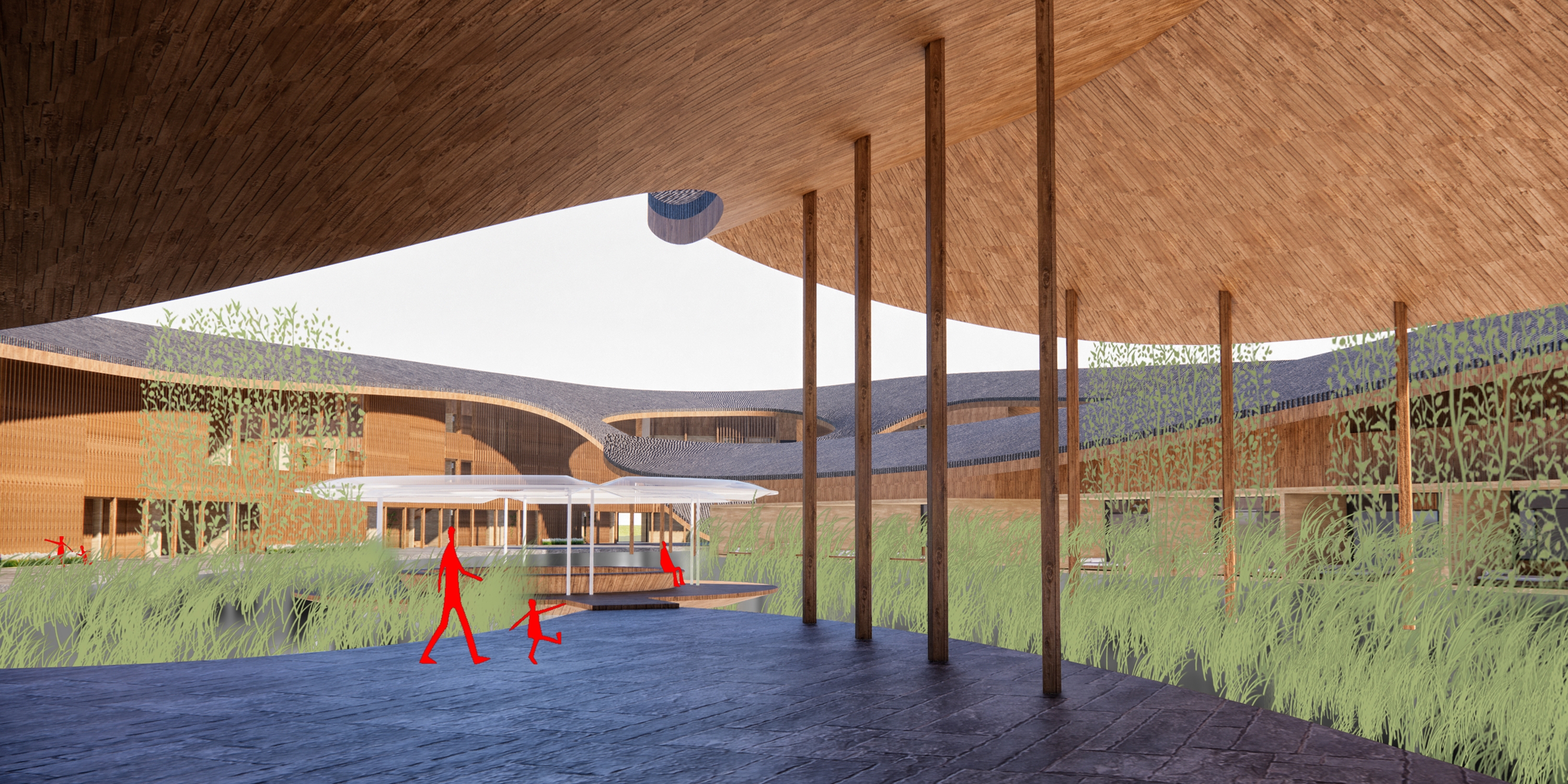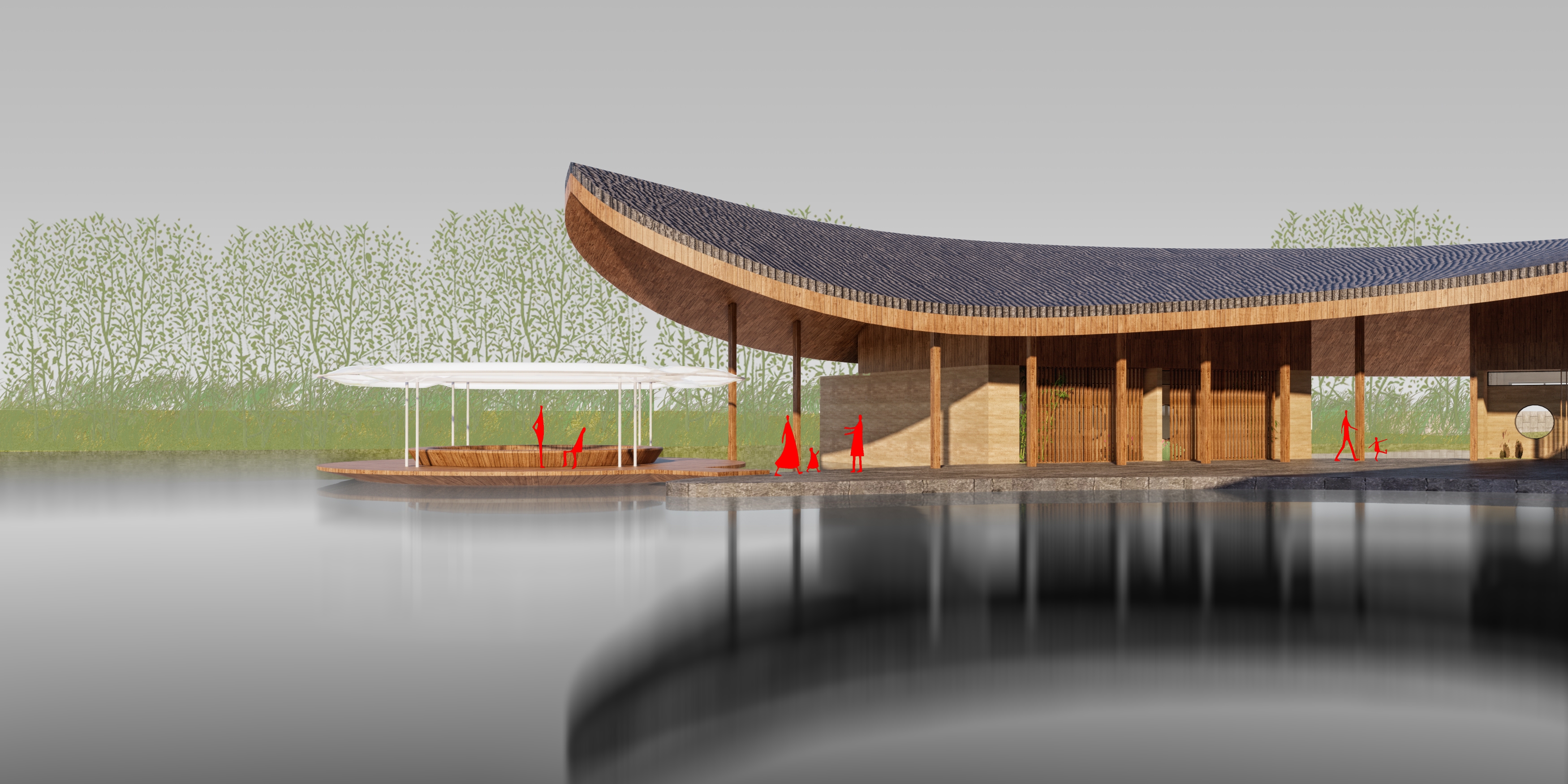 Inspired by the regional vernacular building, pitched roof, wood structure, and rammed earth wall are adopted to create a modern version of water town Shangri-La.