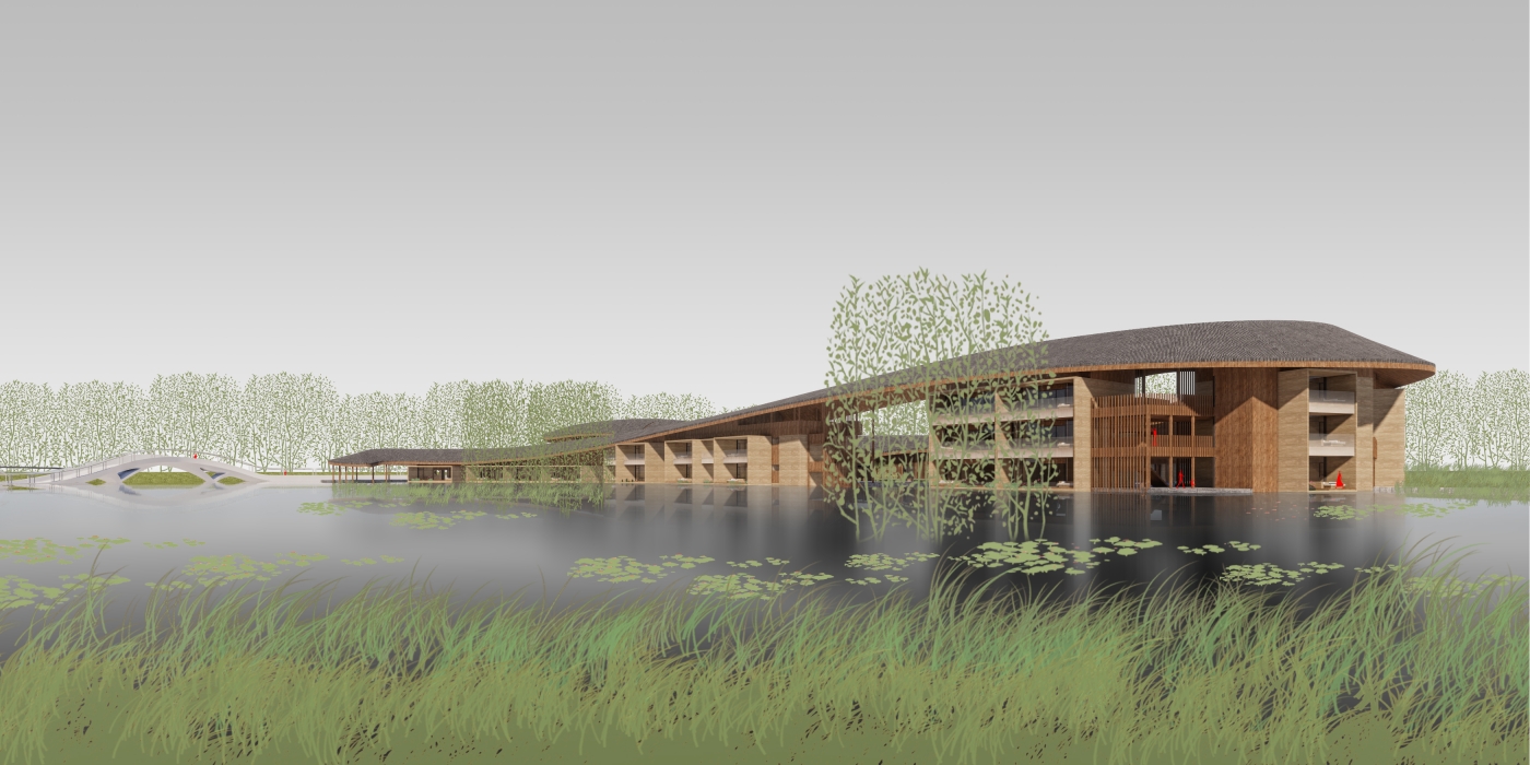 With site constrains, the constructible areas are limited to two pieces of triangular land. 150 guest rooms are arranged within two stroke-shaped clusters, which adapt into the shape of lands respectively. In the agricultural area at the perimeter of the site, crops are planted to create the water land pastoral landscape.