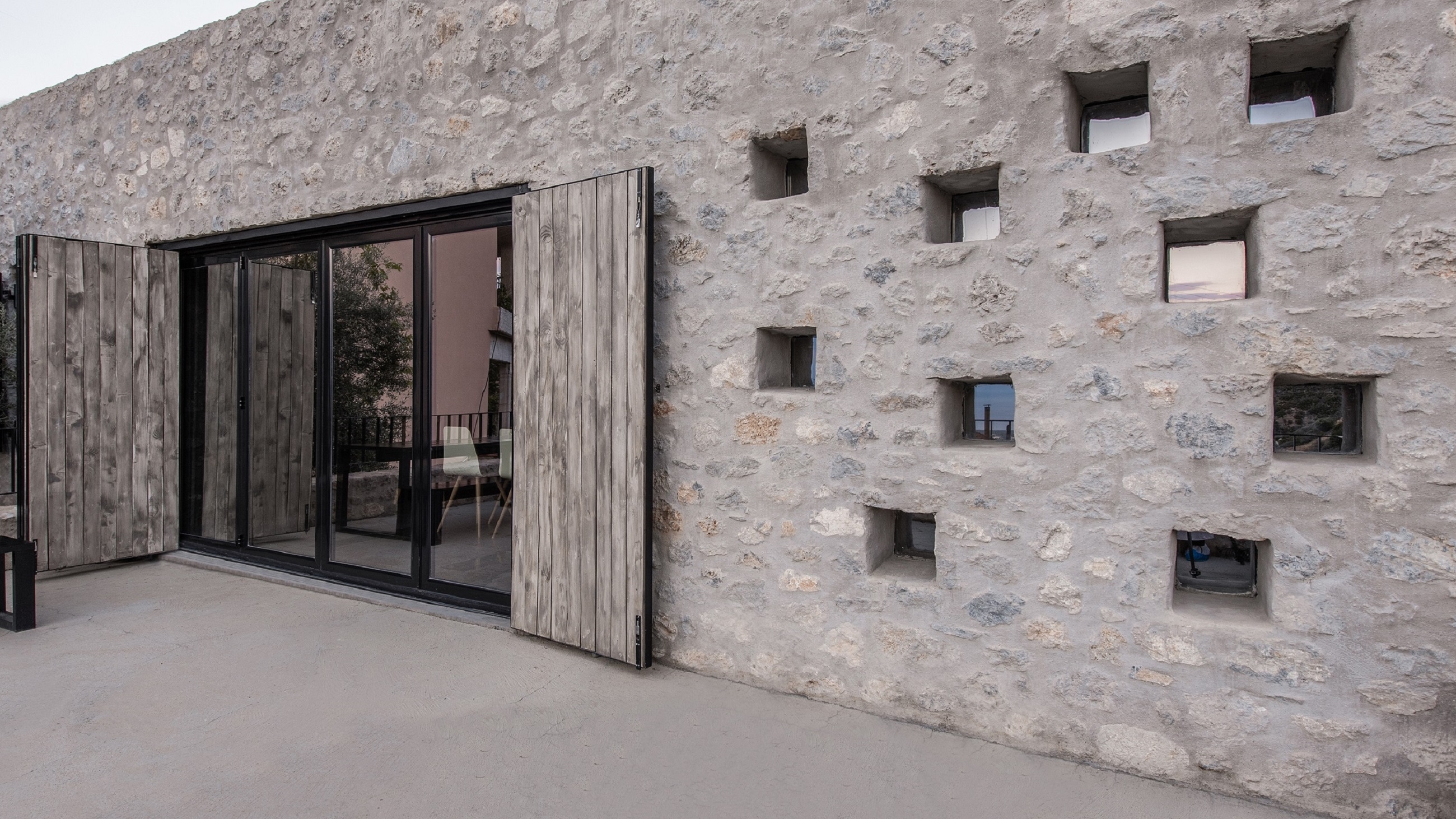 A plot overlooking the Gulf of Corinth, in a village of Kalamia, is a setting for a dwelling. The morphology of the place led to the decision of creating the house with humble, traditional stable-like appearance from the street side, while developing in a two-level construction from the garden.