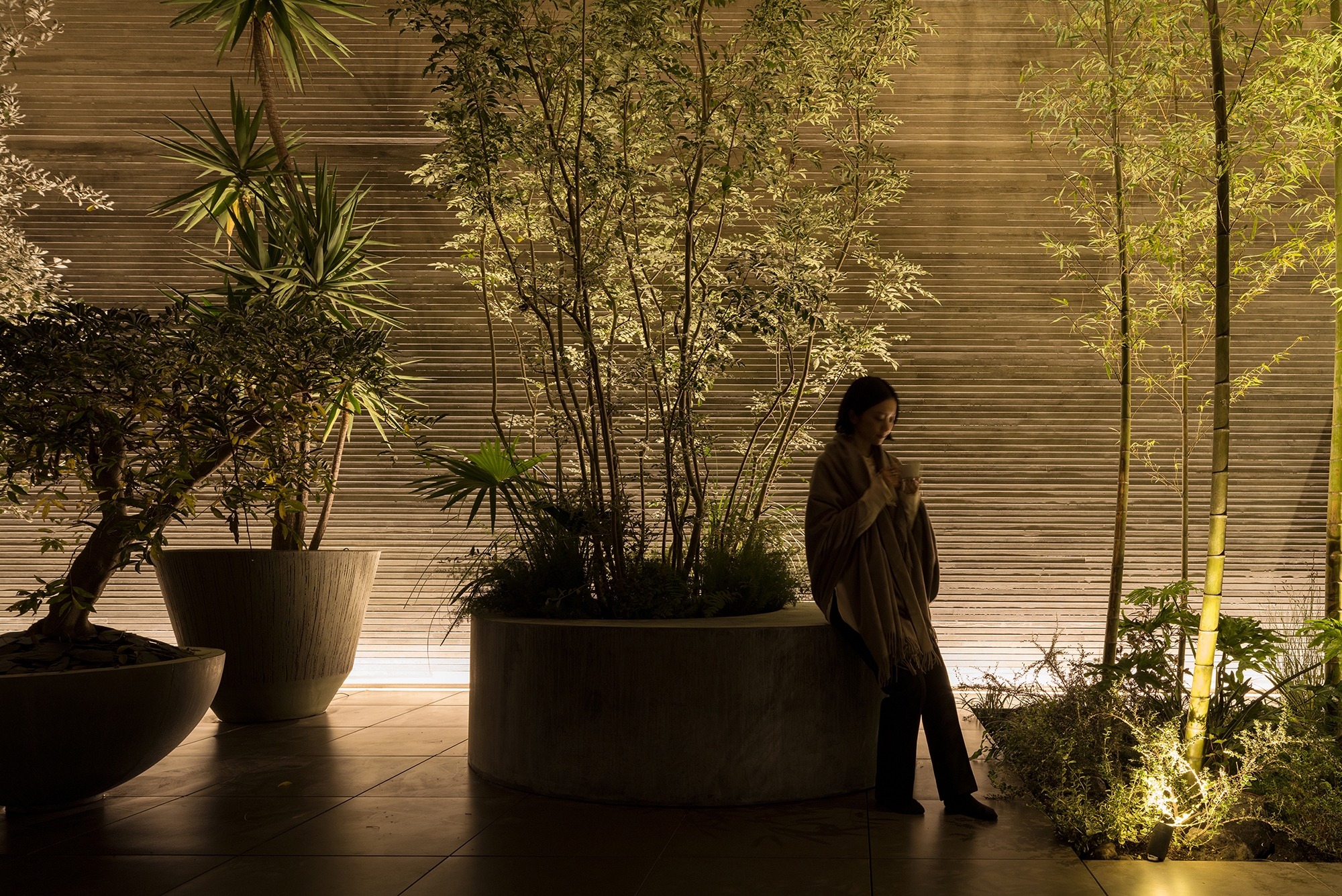 This house in a quiet residential neighborhood of central Tokyo was built for a couple who had long lived on the property but wanted to rebuild as they entered a new phase of life after their three children left home. The simple exterior design comprised of two massive volumes piled on top of each other takes advantage of the corner lot, with a façade of exposed concrete imprinted with cedar formwork. Outward-facing windows are limited to horizontal slits to preserve privacy and increase security.