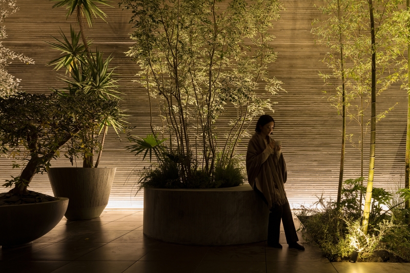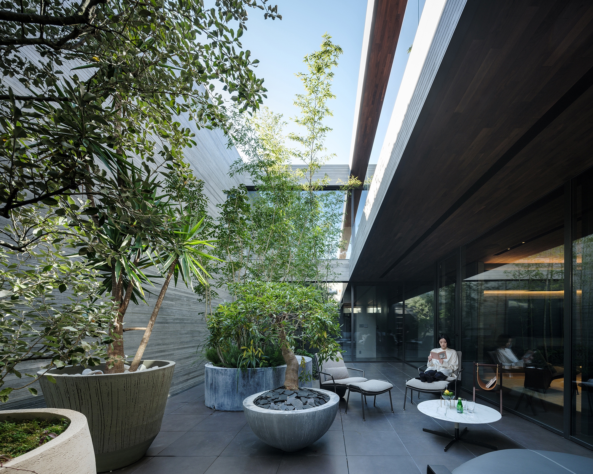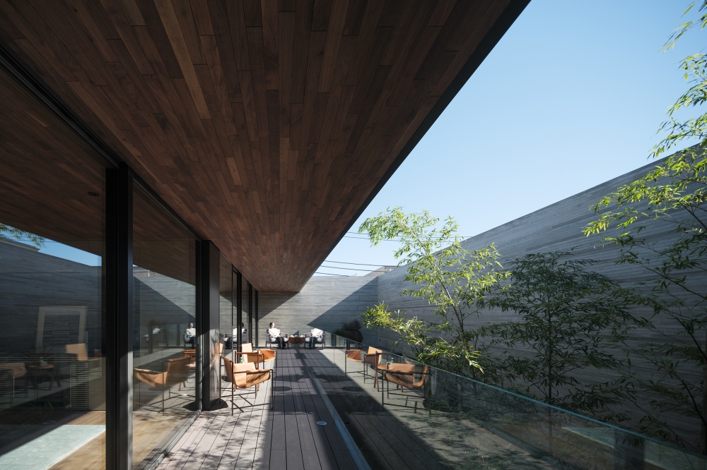 Inside, the house is defined by two courtyards, one large and the other small, that are arranged in parallel. The main courtyard is on the south side and features a bamboo grove that draws the eye when one steps into the entryway. Because the living room, study, and bedrooms all face onto this courtyard, the clients and their dog can enjoy outdoor time as they please. A smaller slit-shaped courtyard on the north side is also dotted with plantings and serves as a lightwell, filling the first-floor living room and entryway as well as a second living room upstairs with pleasant, diffuse light.