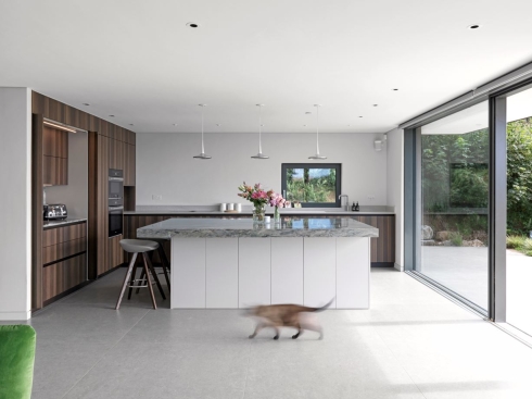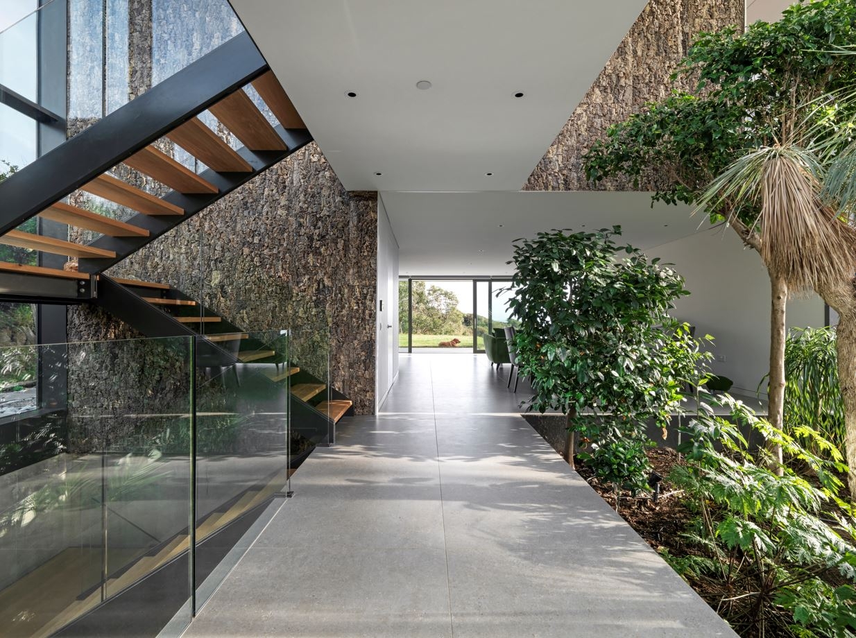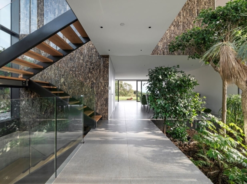 The dwelling is partially cut into the site and carefully designed to create a central atrium planted with specimen trees providing a winter garden for the homeowners, who are keen gardeners. The build demonstrates an architectural focus on eco-friendliness, which is becoming increasingly popular for architectural projects. The result is a striking, sustainable residential build which considers its natural surroundings.