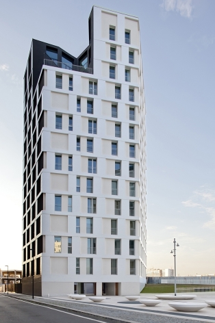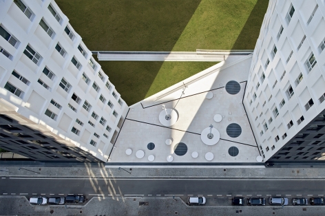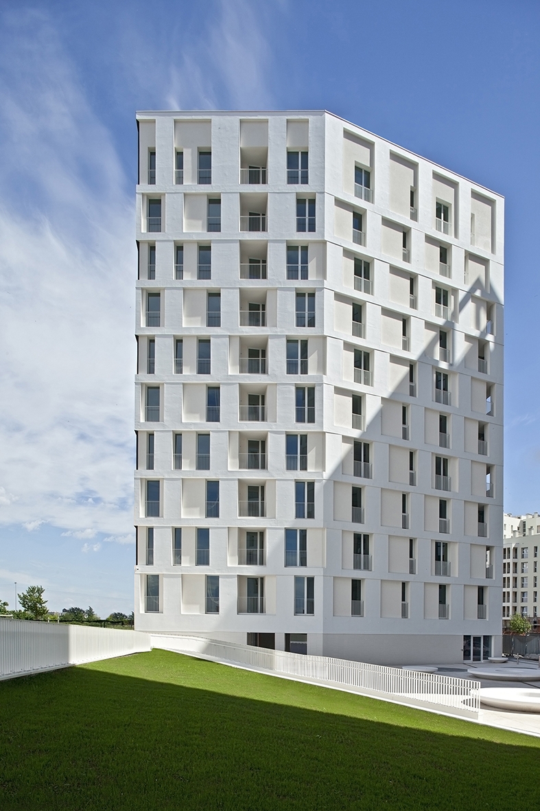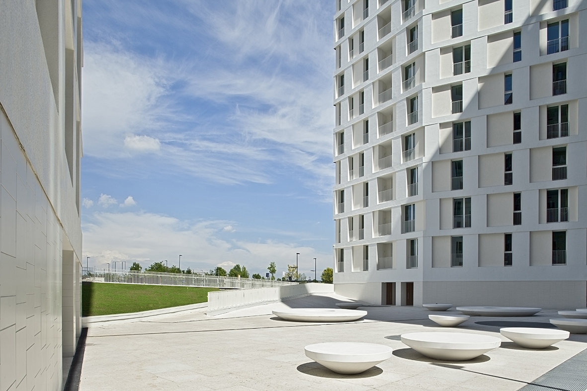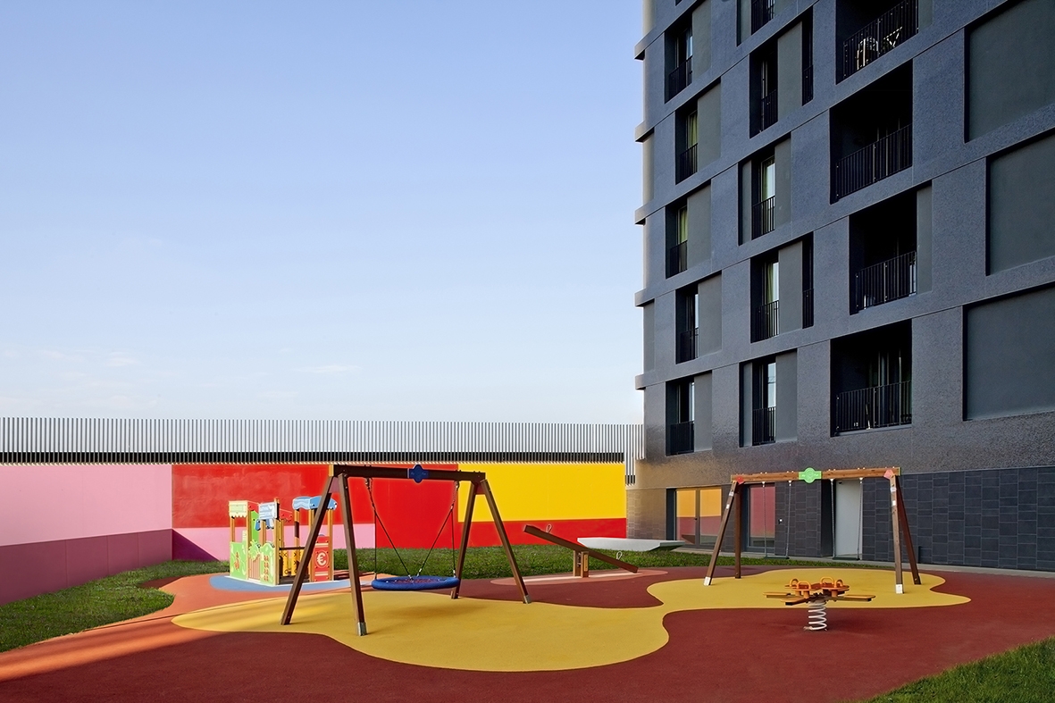 Designing for the public good. We feel we have turned an affordable housing project into an action to defend public space, giving it back to the community. The plot borders the park of Cascina Merlata, the largest housing development in Europe. Initially planned as a ‘gated community’, we have proposed to break the volume into two parts to give back the community a public space, creating a ‘urban door’ between the Village and the Park. The new Piazza is an open and accessible space for all people relating the different levels of the street and the park: a threshold between the built and nature. We physically design a square in material and chromatic continuity with the two towers of affordable housing (shred community spaces on the ground floor), to underline that sharing a collective space is a key point to strengthen the identity of the community. The square is a fun, fully accessible public space. The two towers (14 and 12 floor) seem to have been generated from the same volume, split in two. The towers are cladded in durable glass mosaic, recalling the Masters of Italian Architecture. The volume is NZeB, with photovoltaic, water recuperation and circularity of the materials.