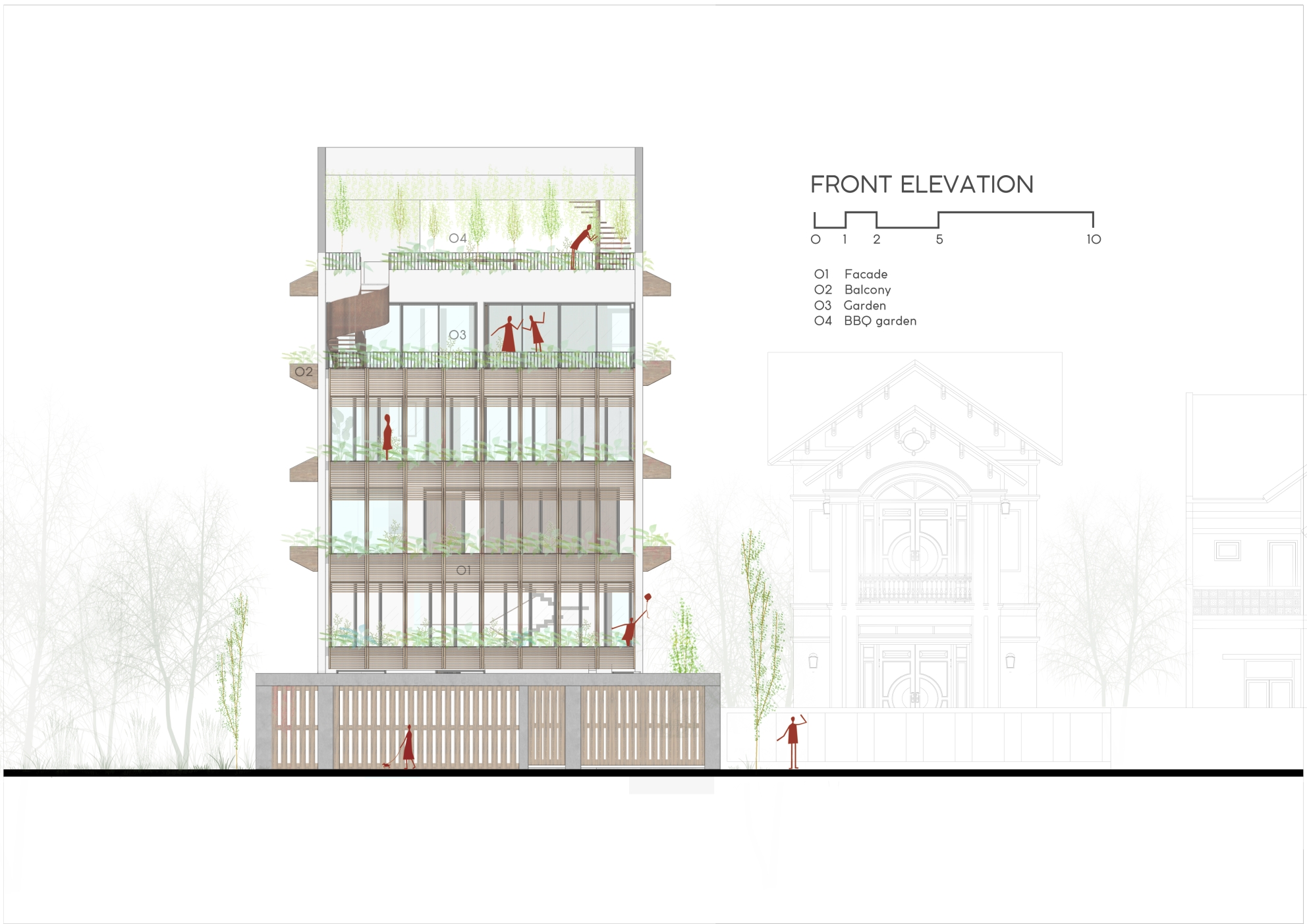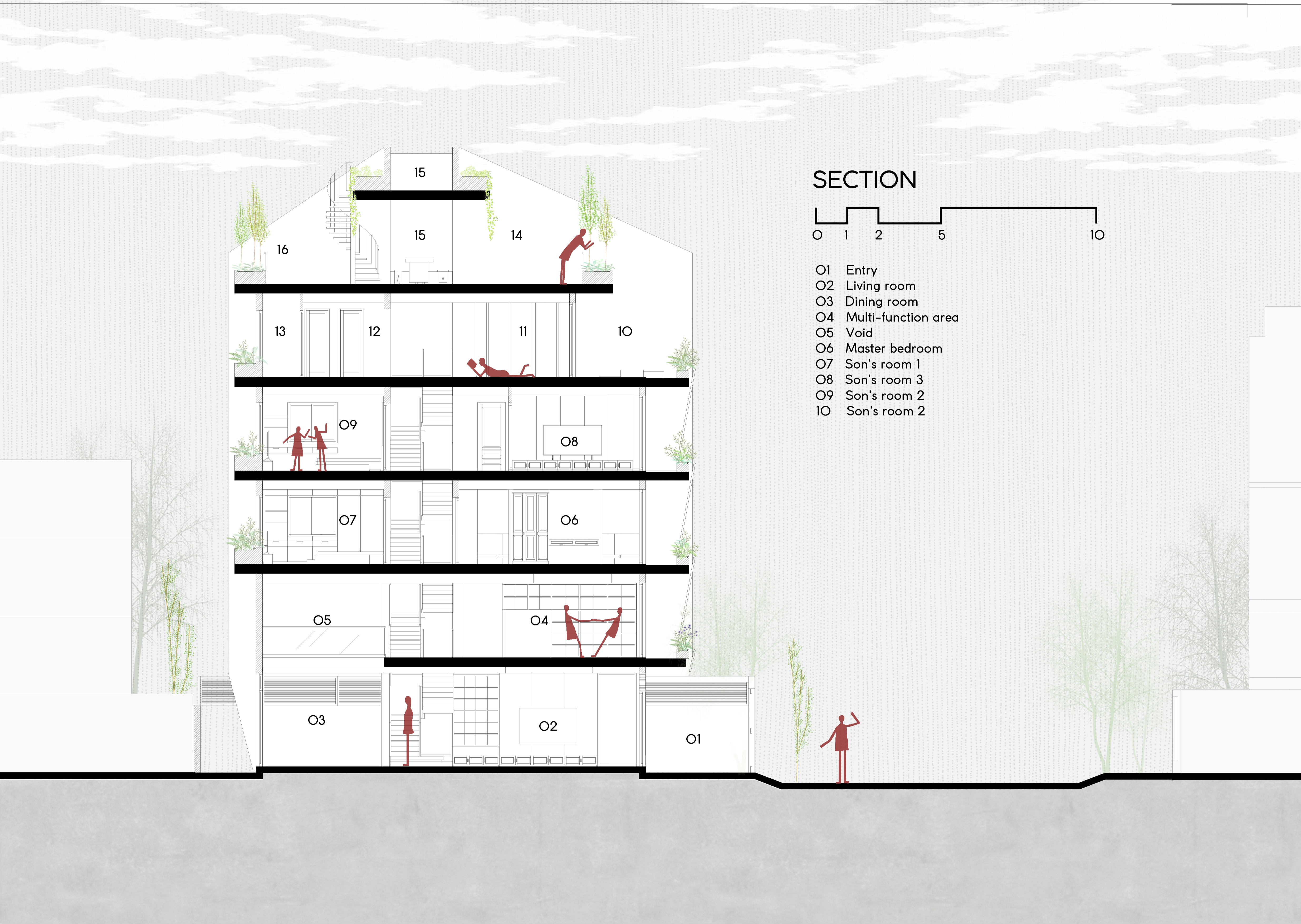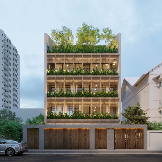 The location of the project is in Thu Duc city - a new urban area of Ho Chi Minh City, VietNam with high construction density and crowded vehicles. Not only that, Nam Villa is located in the context of large houses close together and at the foot of the apartment building. Therefore, we focus on finding design solutions to increase the privacy of the building. Surrounding the house are the buffers of wooden bars and trees combined with the two walls on both sides to make the building more private, handling the view from the neighbor's house and the adjacent high-rise apartment block. In addition, the sunshade system reduces solar radiation, catches the southeast wind at the main face of the building, limits the view from above, and opens the view from below. The interior space is flexibly opened and closed, the intersection is arranged in the middle to ensure that indoor activities always interact with the green outside. In particular, the void is located in the kitchen space, which connects family members. It can be seen that Nam Villa is an inspirational project about how to behave between the building and the context and people.