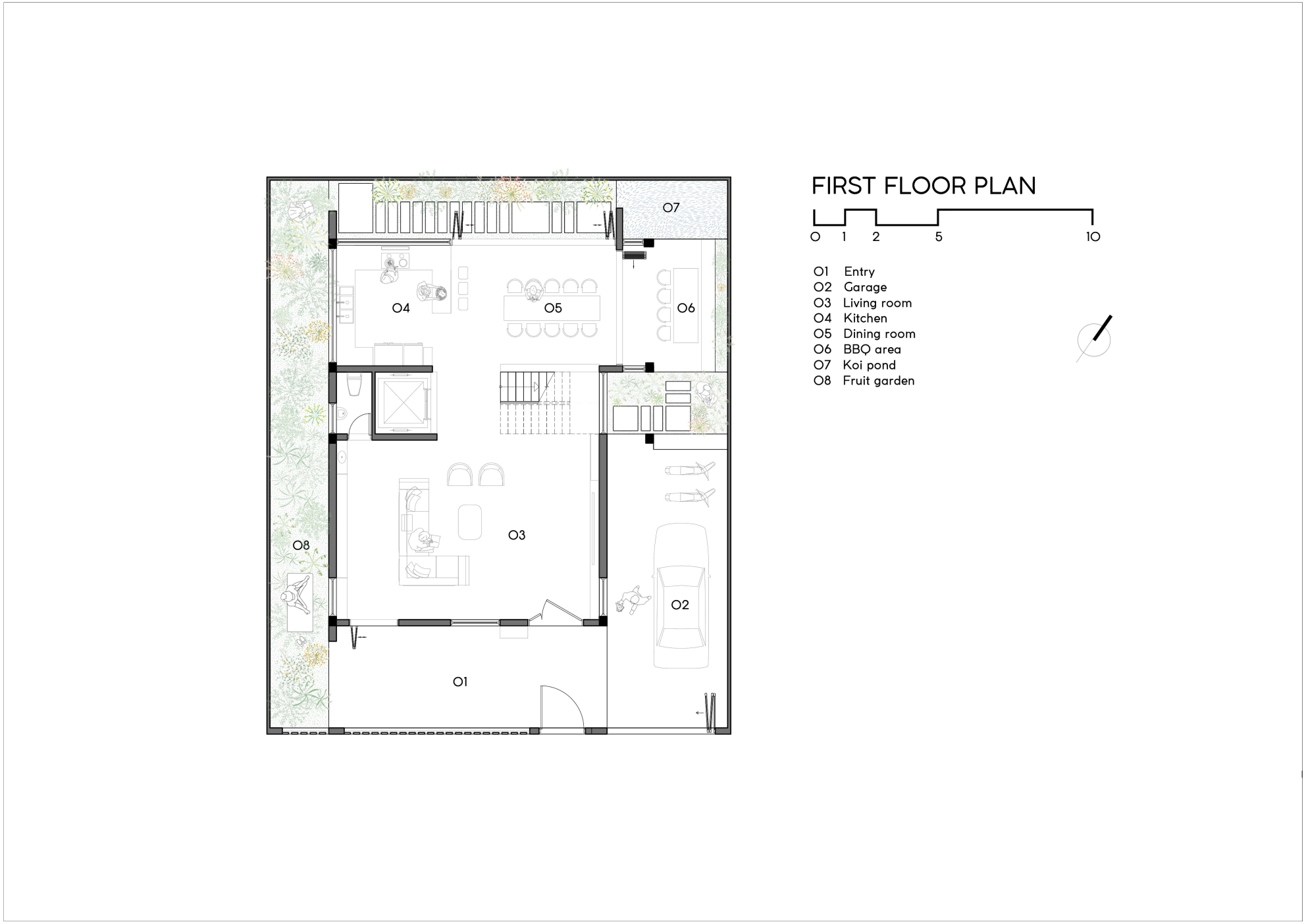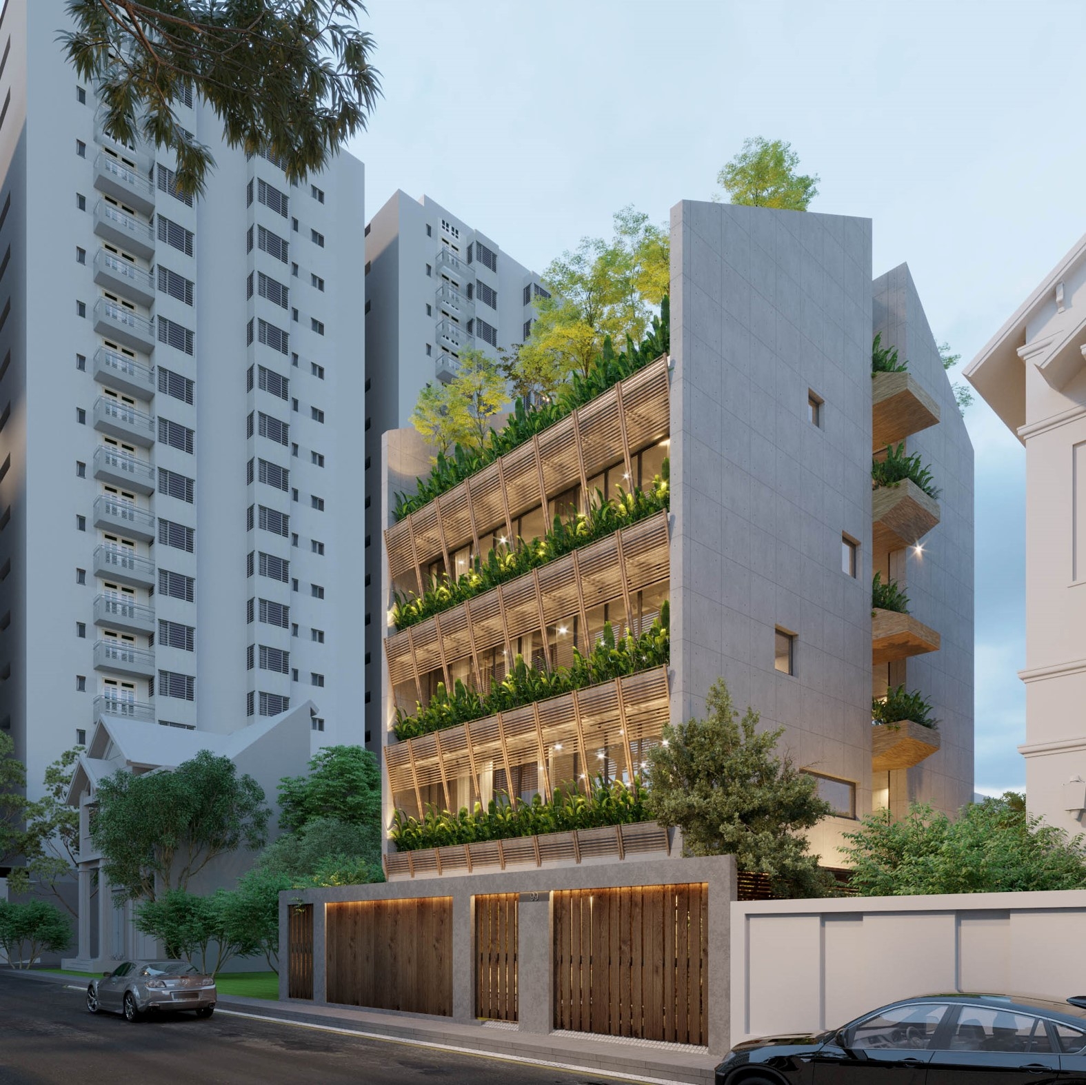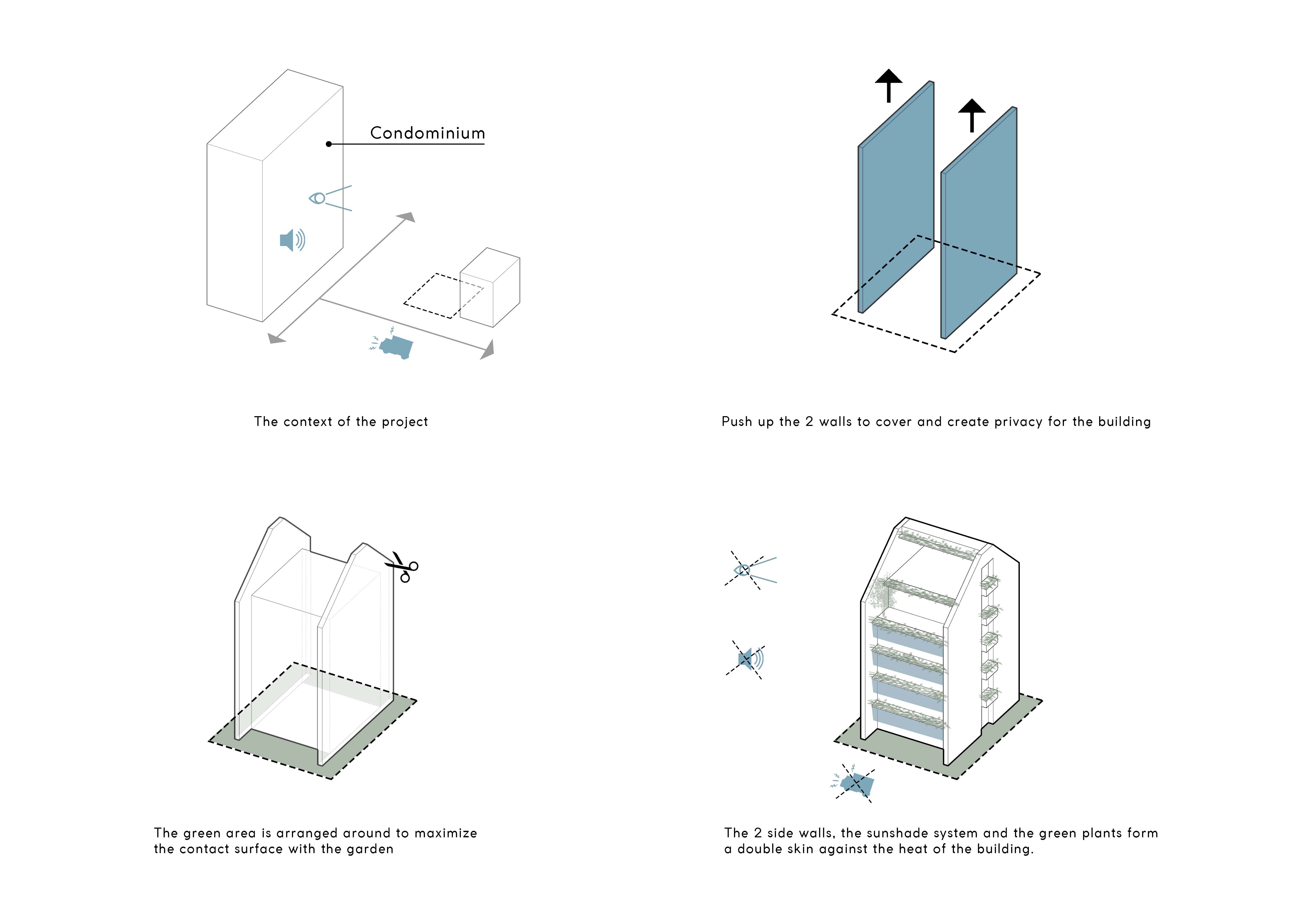 The location of the project is in Thu Duc city - a new urban area of Ho Chi Minh City, VietNam with high construction density and crowded vehicles. Not only that, Nam Villa is located in the context of large houses close together and at the foot of the apartment building. Therefore, we focus on finding design solutions to increase the privacy of the building. Surrounding the house are the buffers of wooden bars and trees combined with the two walls on both sides to make the building more private, handling the view from the neighbor's house and the adjacent high-rise apartment block. In addition, the sunshade system reduces solar radiation, catches the southeast wind at the main face of the building, limits the view from above, and opens the view from below. The interior space is flexibly opened and closed, the intersection is arranged in the middle to ensure that indoor activities always interact with the green outside. In particular, the void is located in the kitchen space, which connects family members. It can be seen that Nam Villa is an inspirational project about how to behave between the building and the context and people.