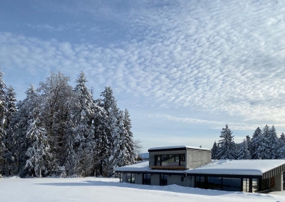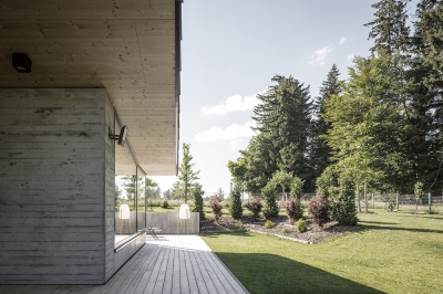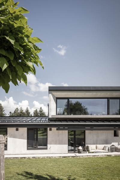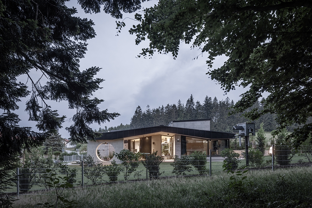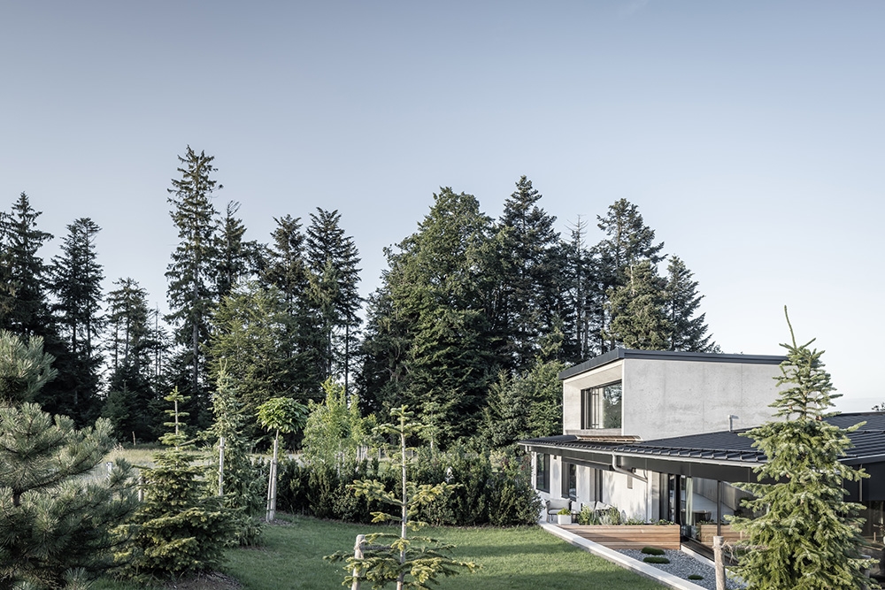 Like a boulder, the sculptural cast of fair-faced concrete sits on a gentle rolling hill. The pitched roof cantilevers against the sloping landscape backdrop and frames the views of the near Bavarian National Park.