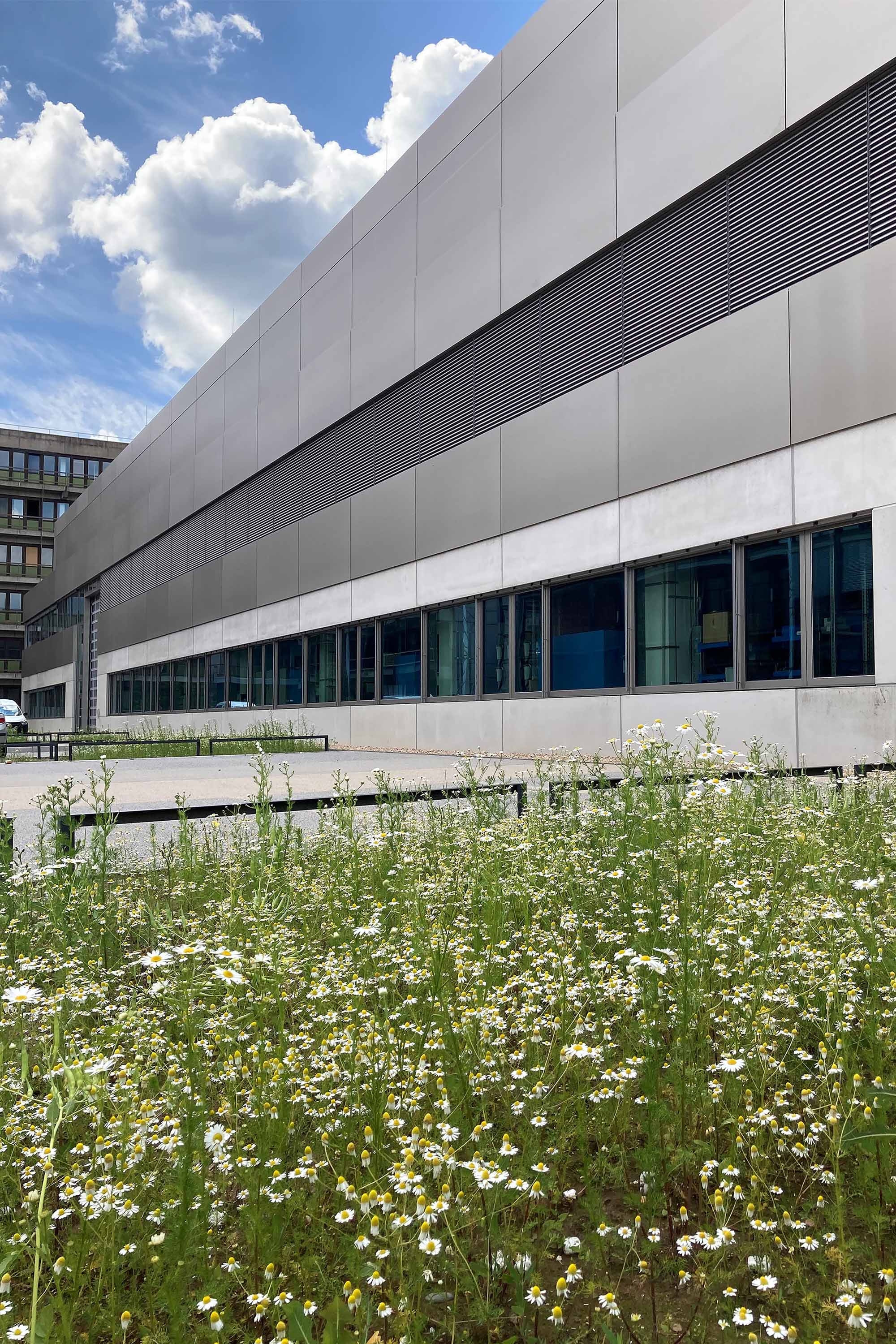 The roof of the building was extensively greened, with 28 skylight domes.