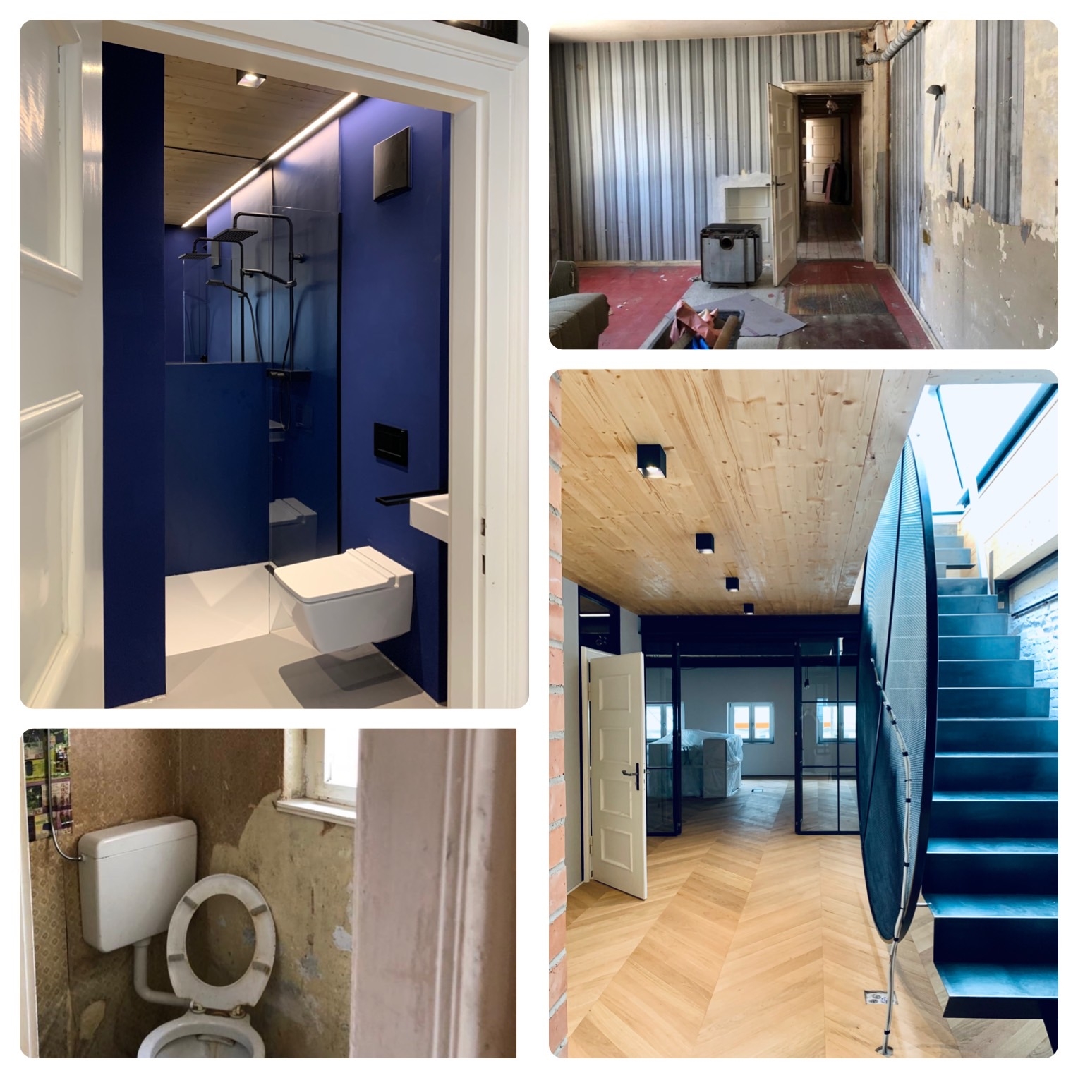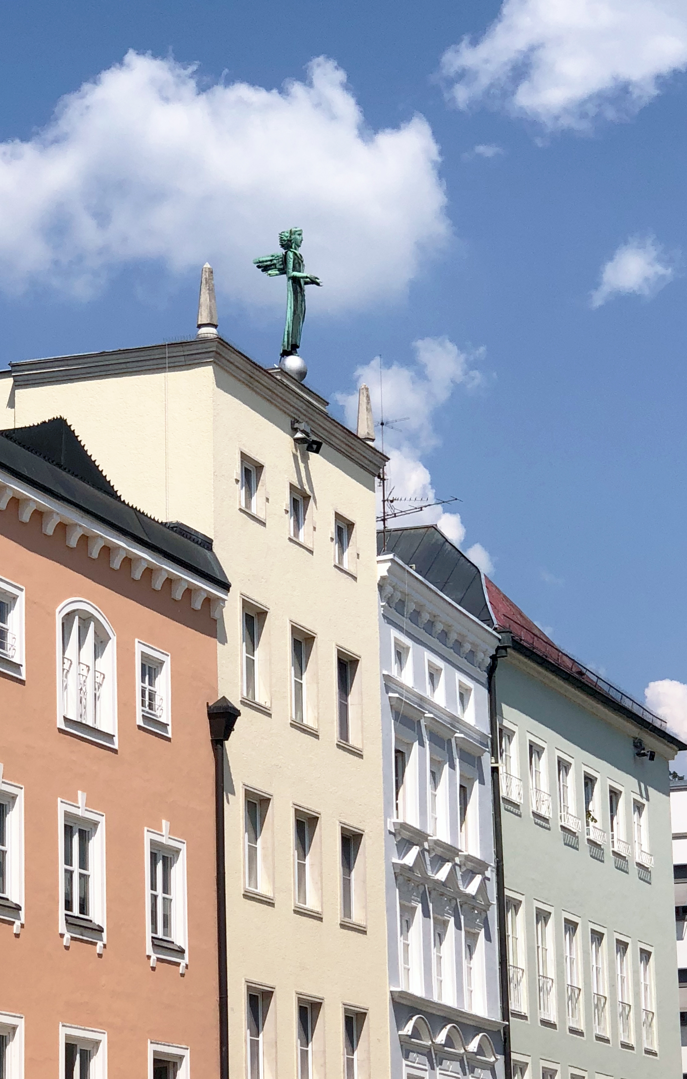 Once a butcher's shop, the building was a famous meeting point for the people of the baroque town of Passau. Part of the heritage-protected ensemble, the building from 1928 is today used as a commercial and residential building. A bronze Angel stands prominently over the facade flanked with two obelisks, restored as part of the 140m2 Art-Deco Loft.