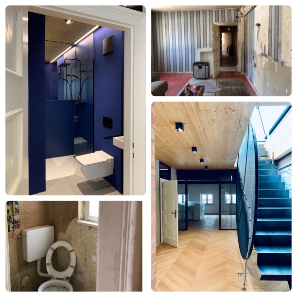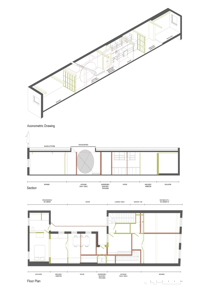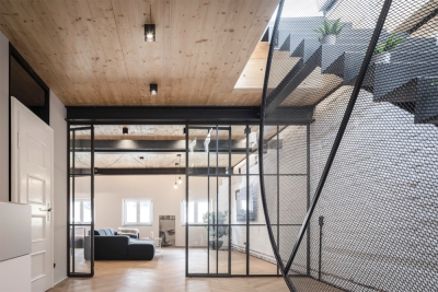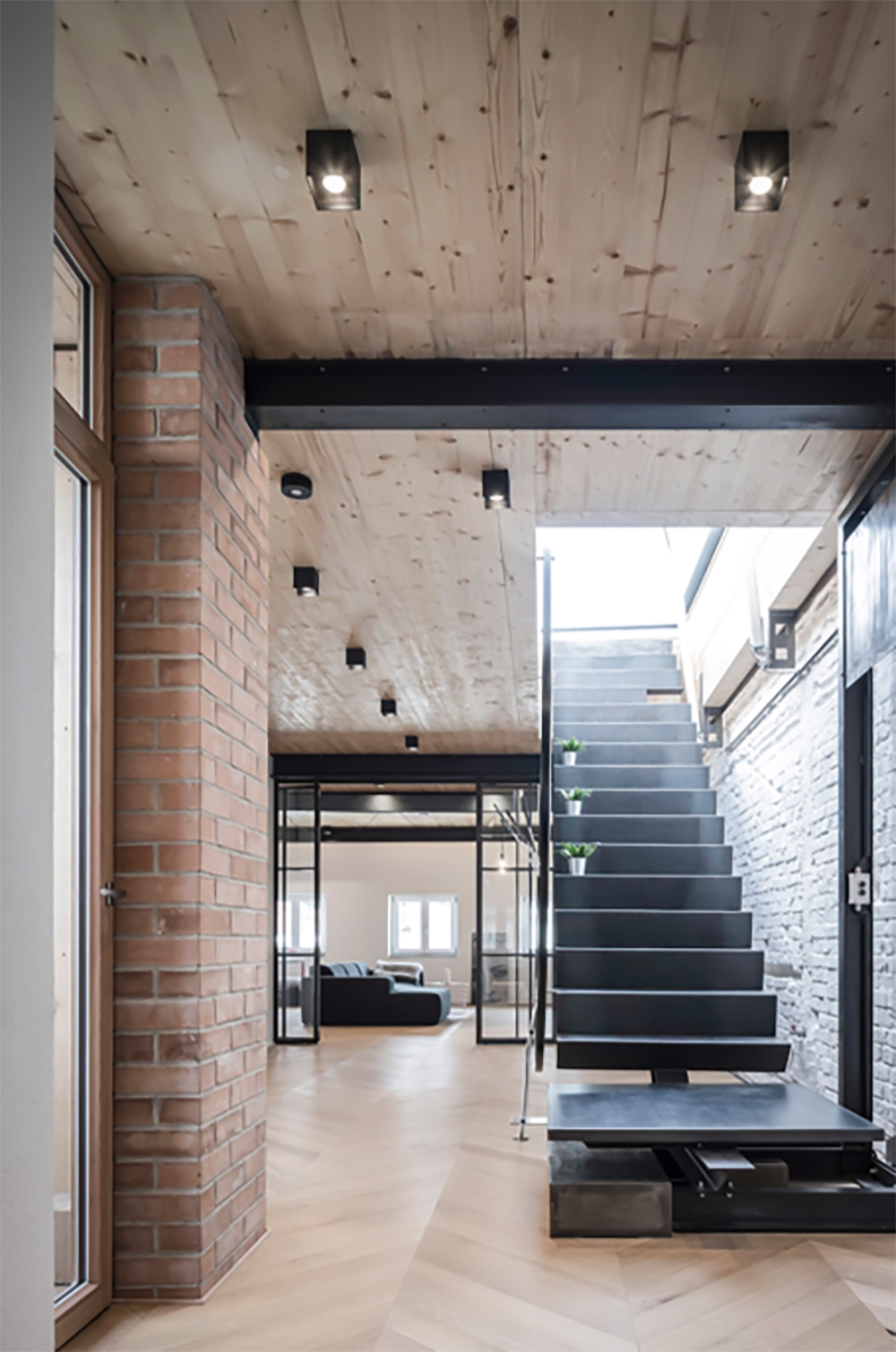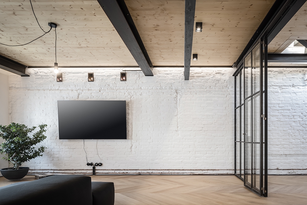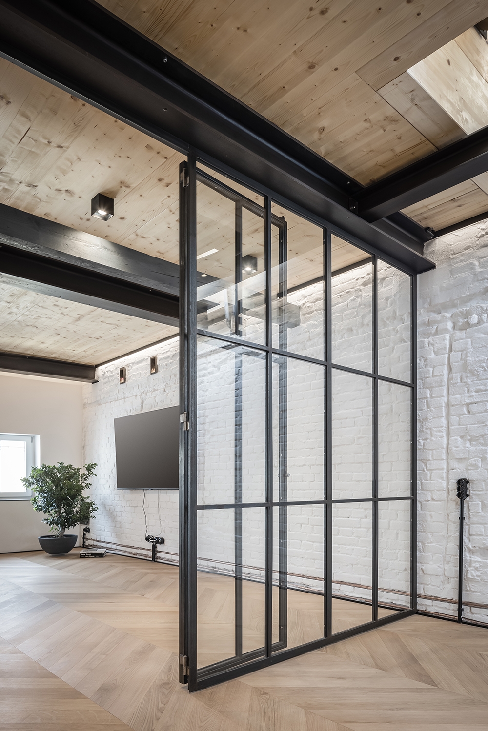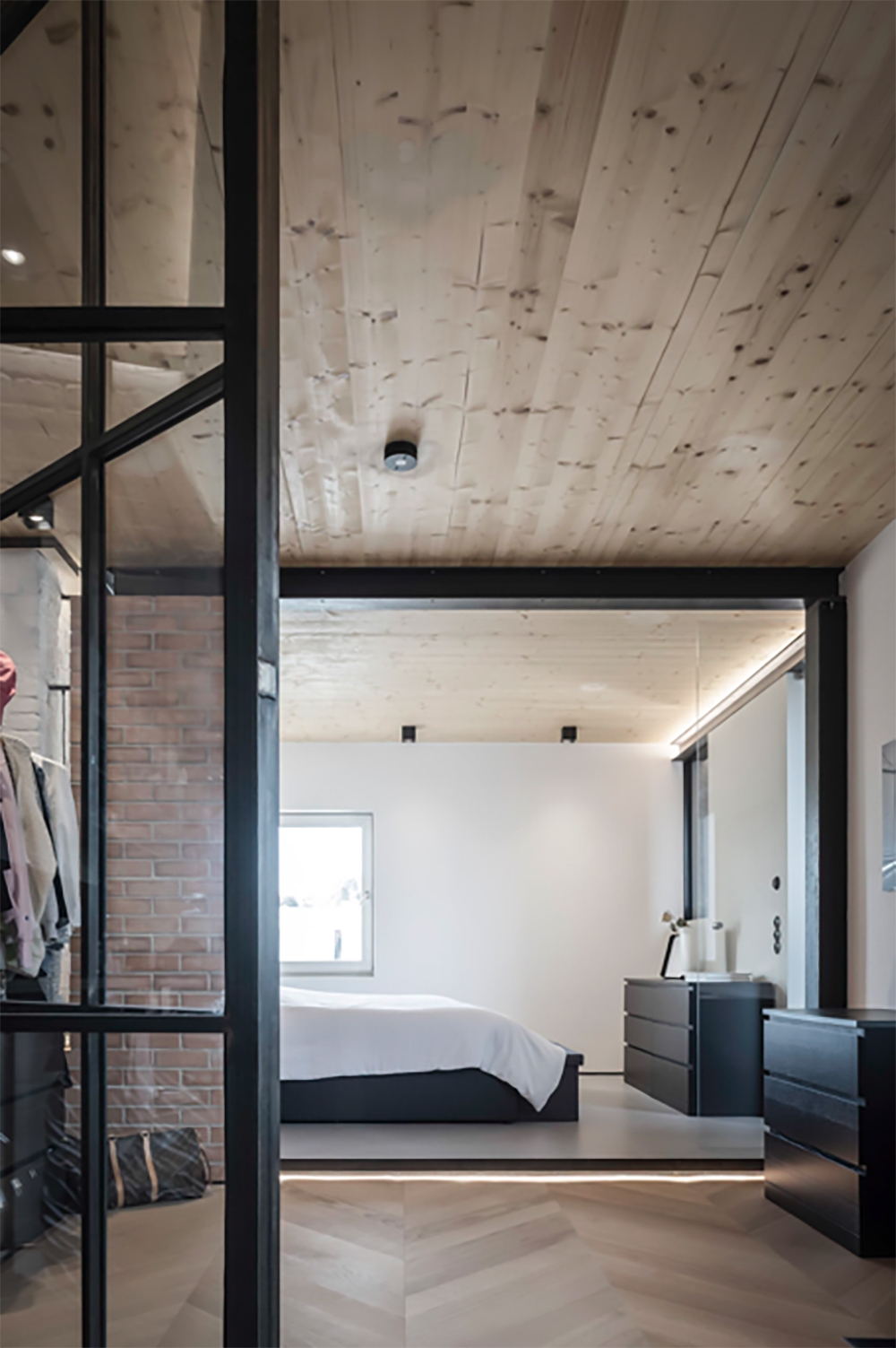 The old timber roof was replaced with cross laminated timber plates. Uncovered fair-faced masonry characterizes a long whitewashed wall as an ornament with post-industrial scars. The partition walls were replaced by wide glass doors in raw steel frames, allowing a spatial transition between hall, kitchen, living and Bedroom.