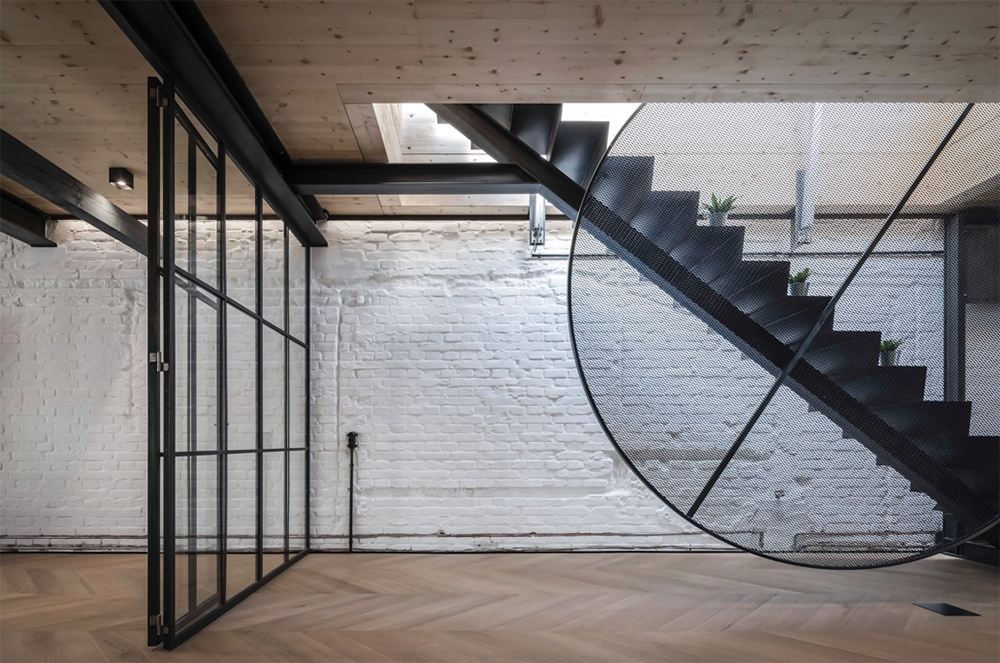 A staircase folded as one metal piece under a Skylight leads up to a restored copper roof with a garden. A large wheel of stretch metal serves as a railing and gives gravity and direction to the space. Raw metal and brushed oak are the primary materials used for kitchen shelves, counters, windowsills or former beam niches.