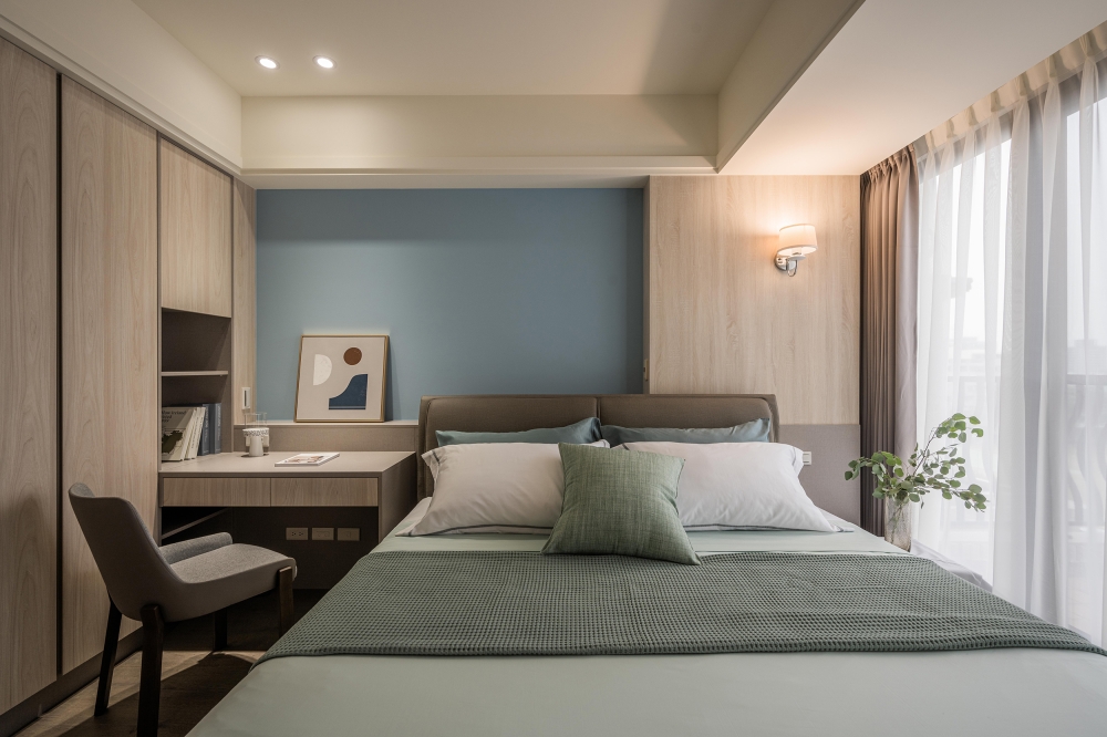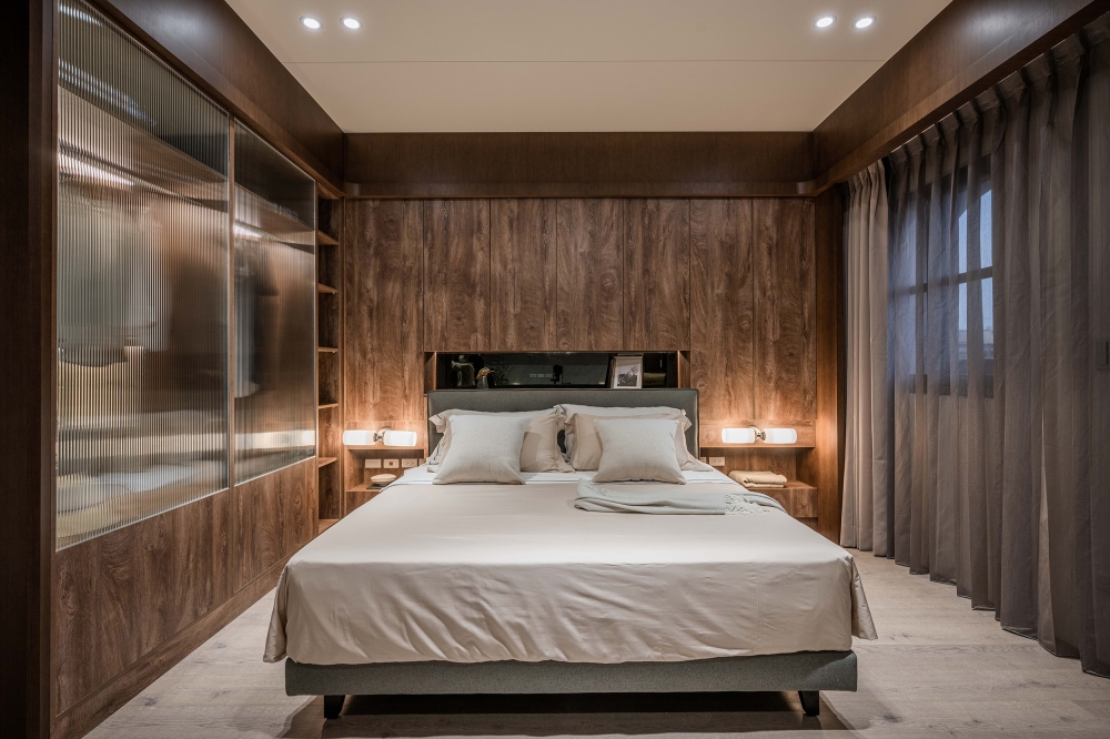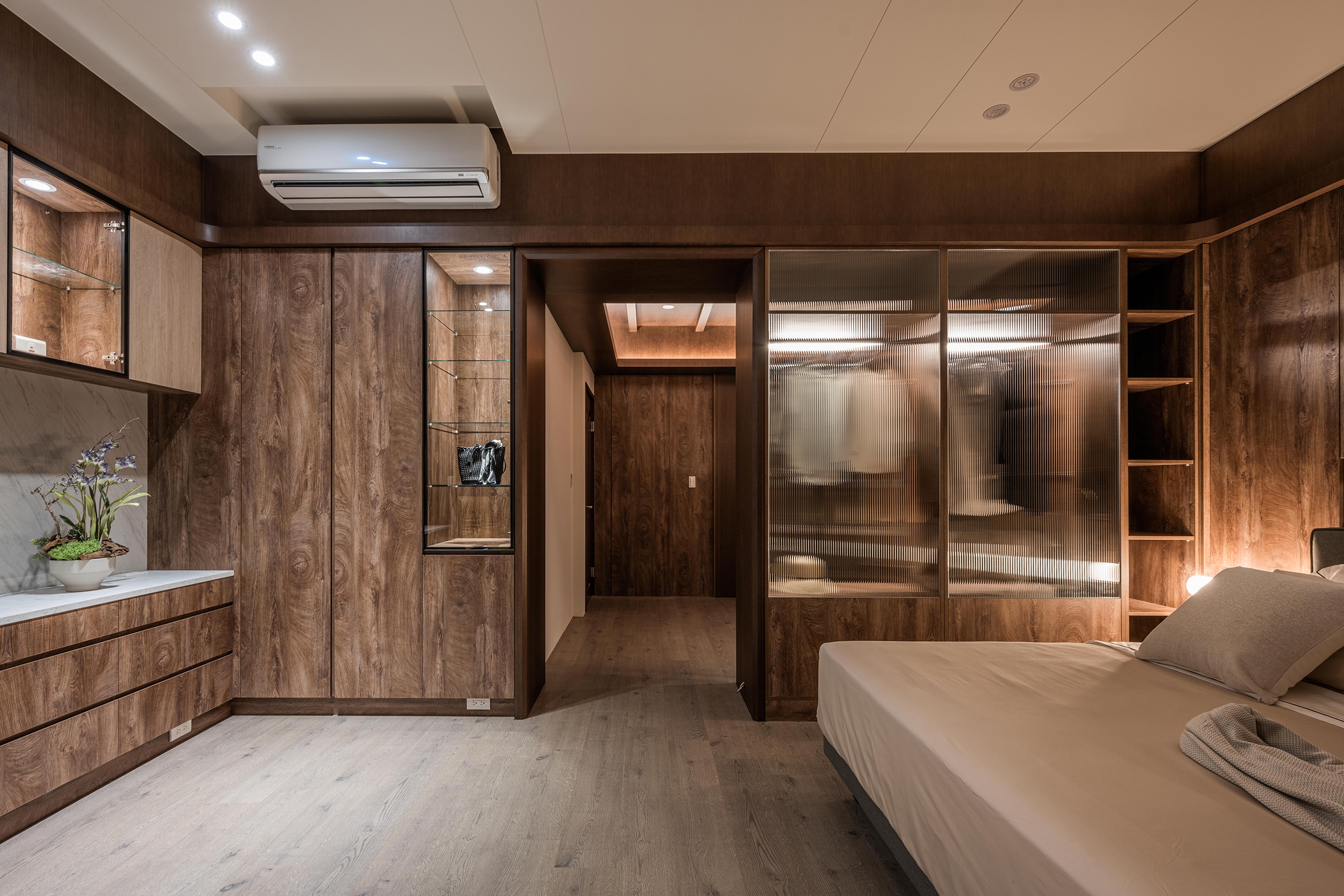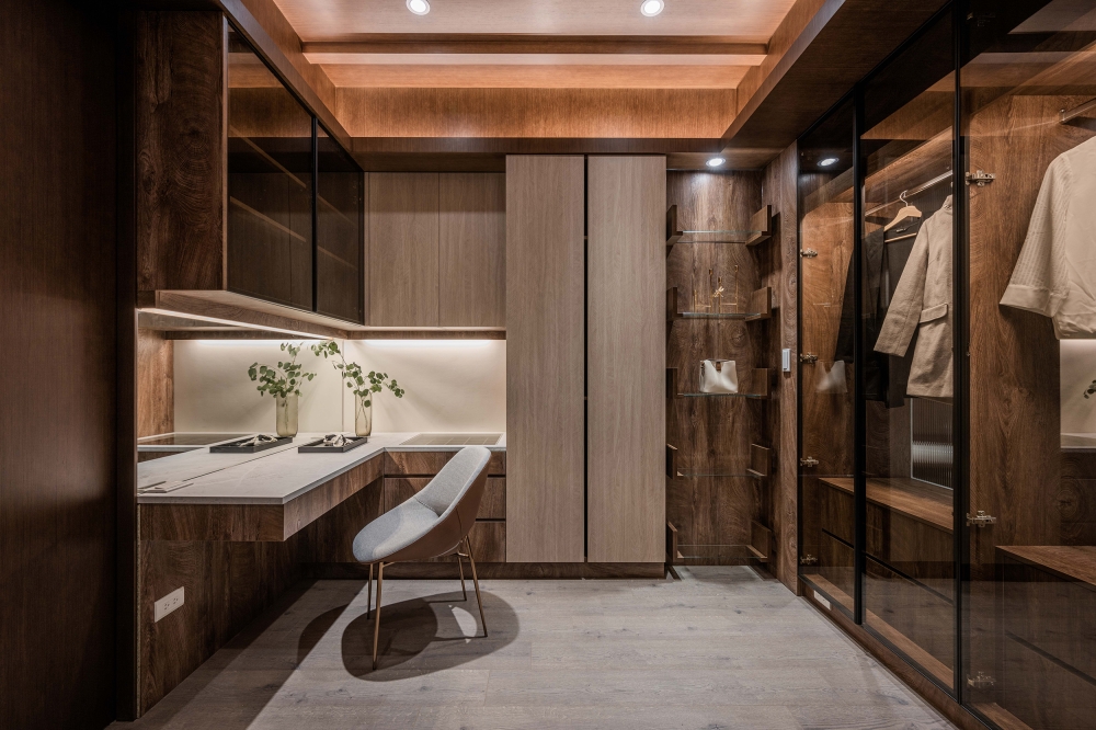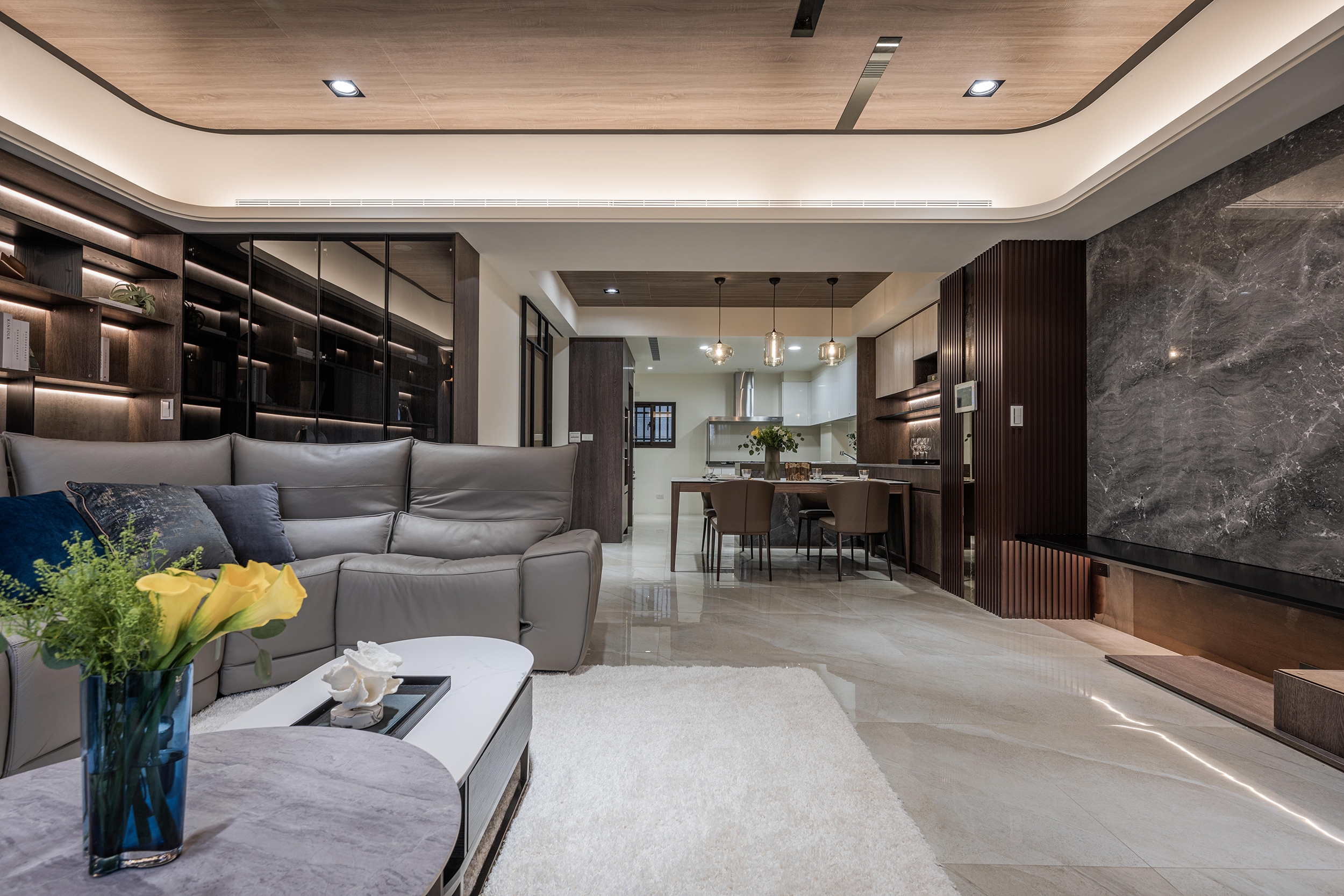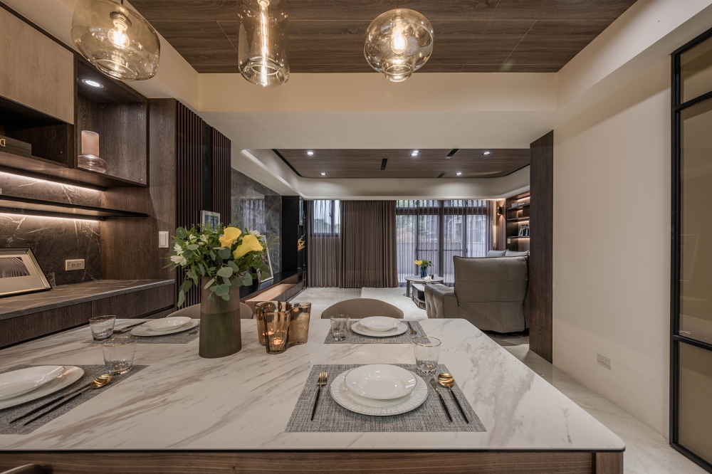 The designer uses wooden veneer of light and dark veins to shape varied feels for the different sections. Diverse materials such as marble, iron and glass are applied alternately, delineating a countenance of grandness and composure, while the thoughtful flow and color scheme make the long narrow space bright and spacious, cozy and pleasant. The entire mansion is shaped into a villa that is modern but mellow, without looking too sharp or high-profile.