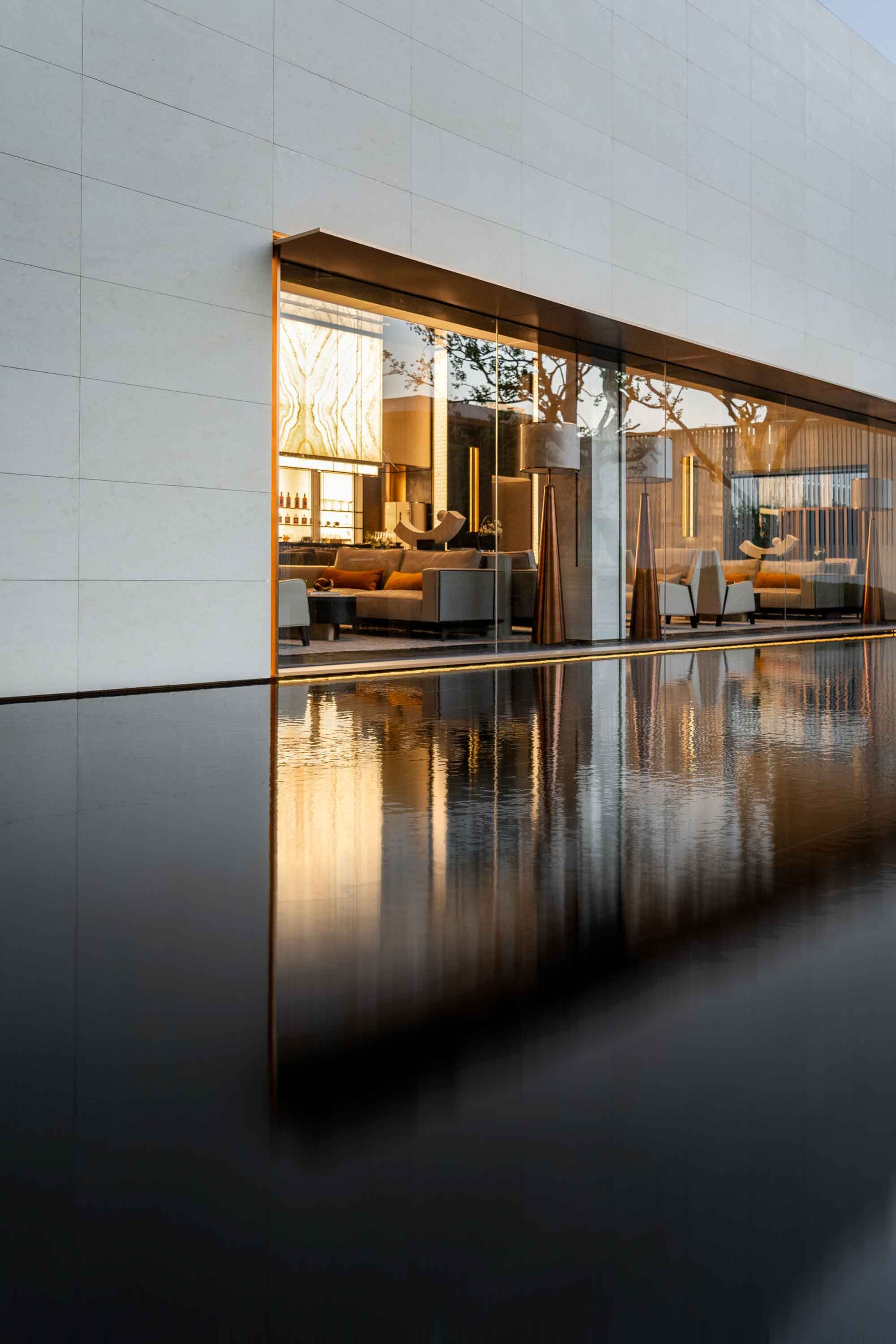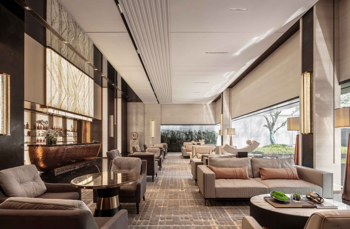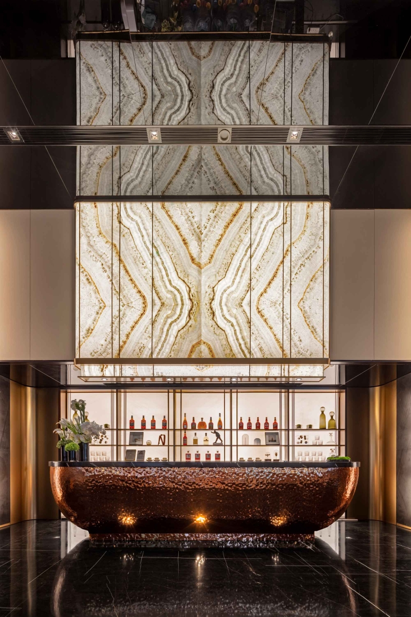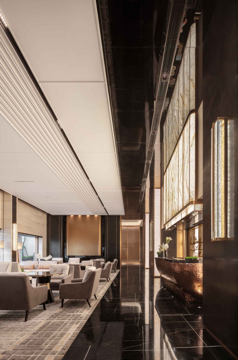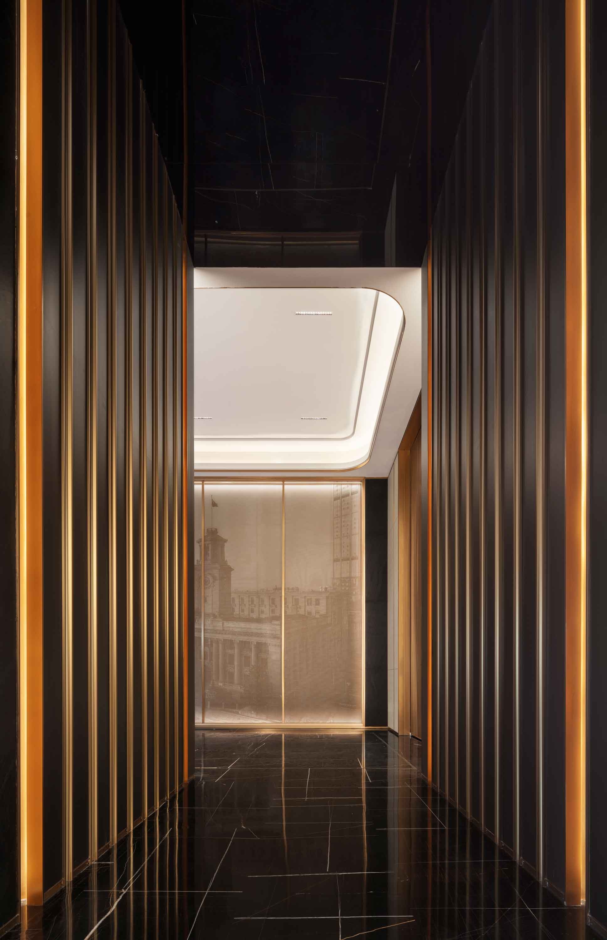 Traveling through a designed corridor with light and shadow, guests can experience wandering in a time machine which connects traditional and modern culture. The reception center is full of romantic and exquisite ambience due to star totem. With affluent metal materials and style variations together with the shadow of architecture, the designers create a strong and distinctive artistic aroma in the whole space.