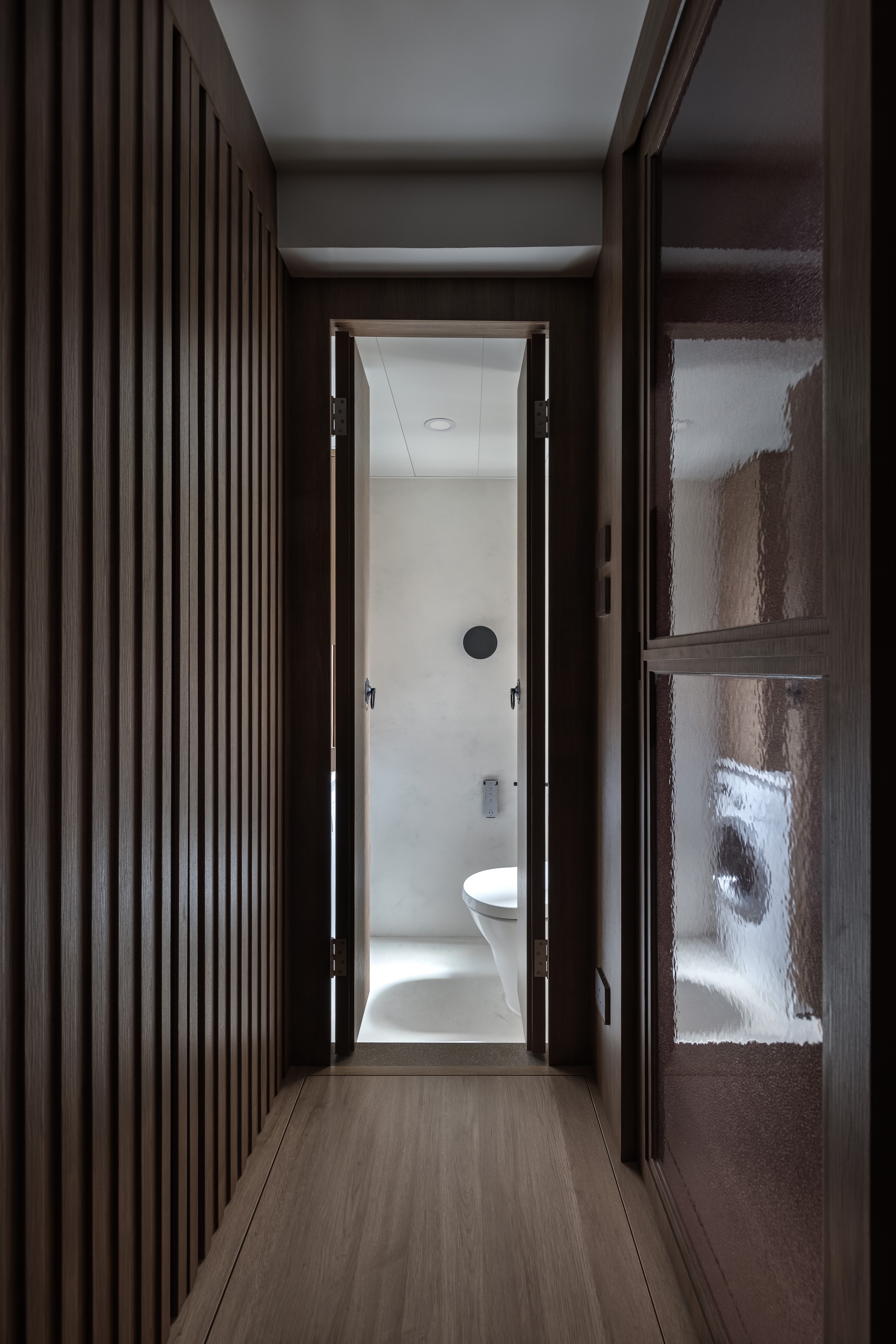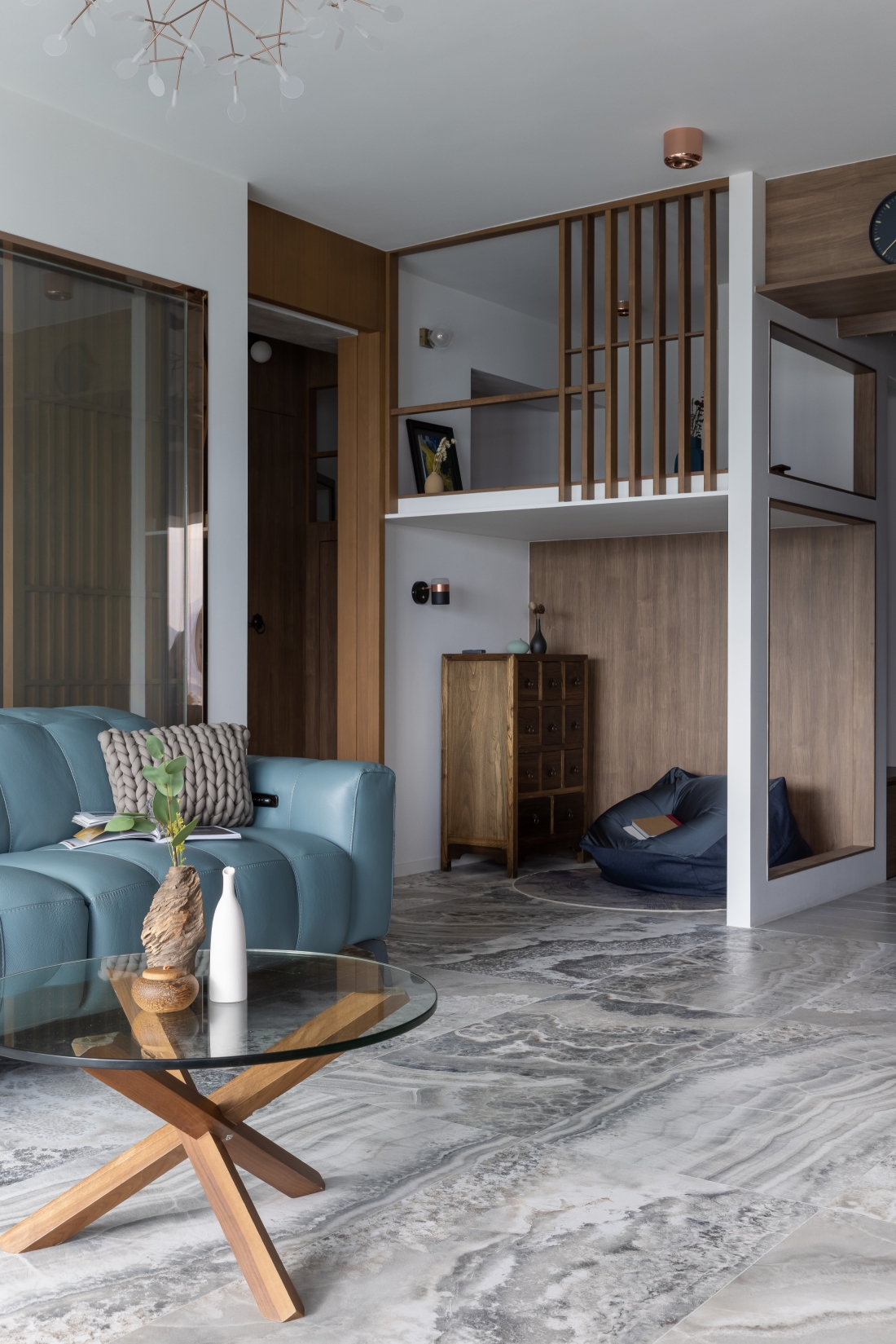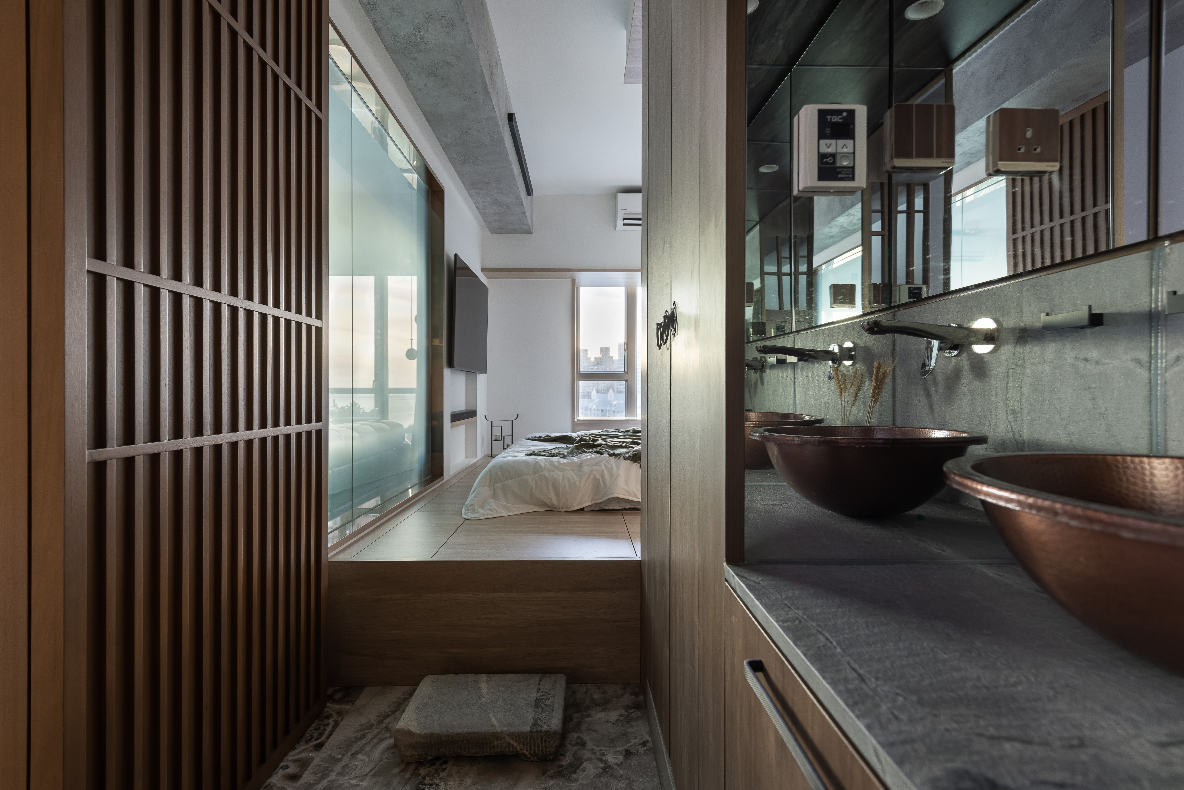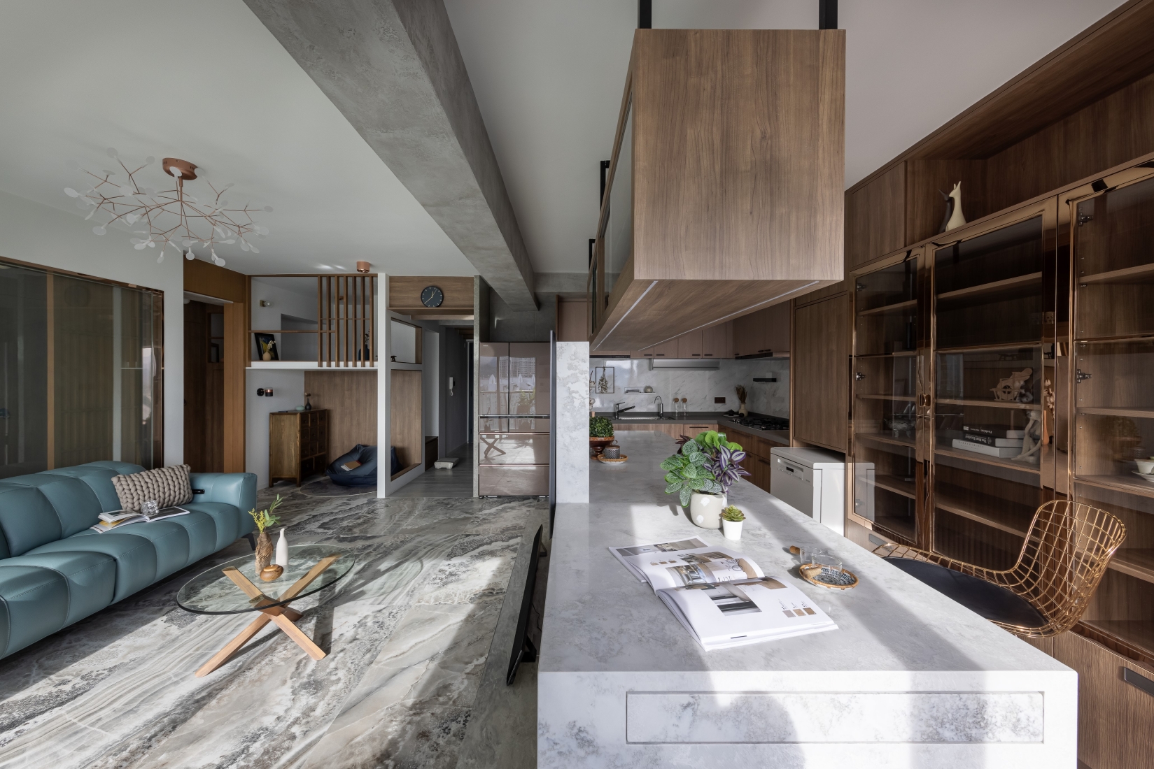 Hong Kong is a small place, but a big city to live. After work for a half entire life, finally facing the harvest period. Client couple would like to slow down a little bit, think about the future of life. Earned of this, designer uses a open-plan style, and according to clients' living habit to design the house. Open-plan design unleashes space potential, it brights more different feelings to the visual, broaden your horizons. About the color and materials, designer mainly uses dark wood color, and floor uses grey marble with clean vein lines. Wood and stone elements enrich the visual.