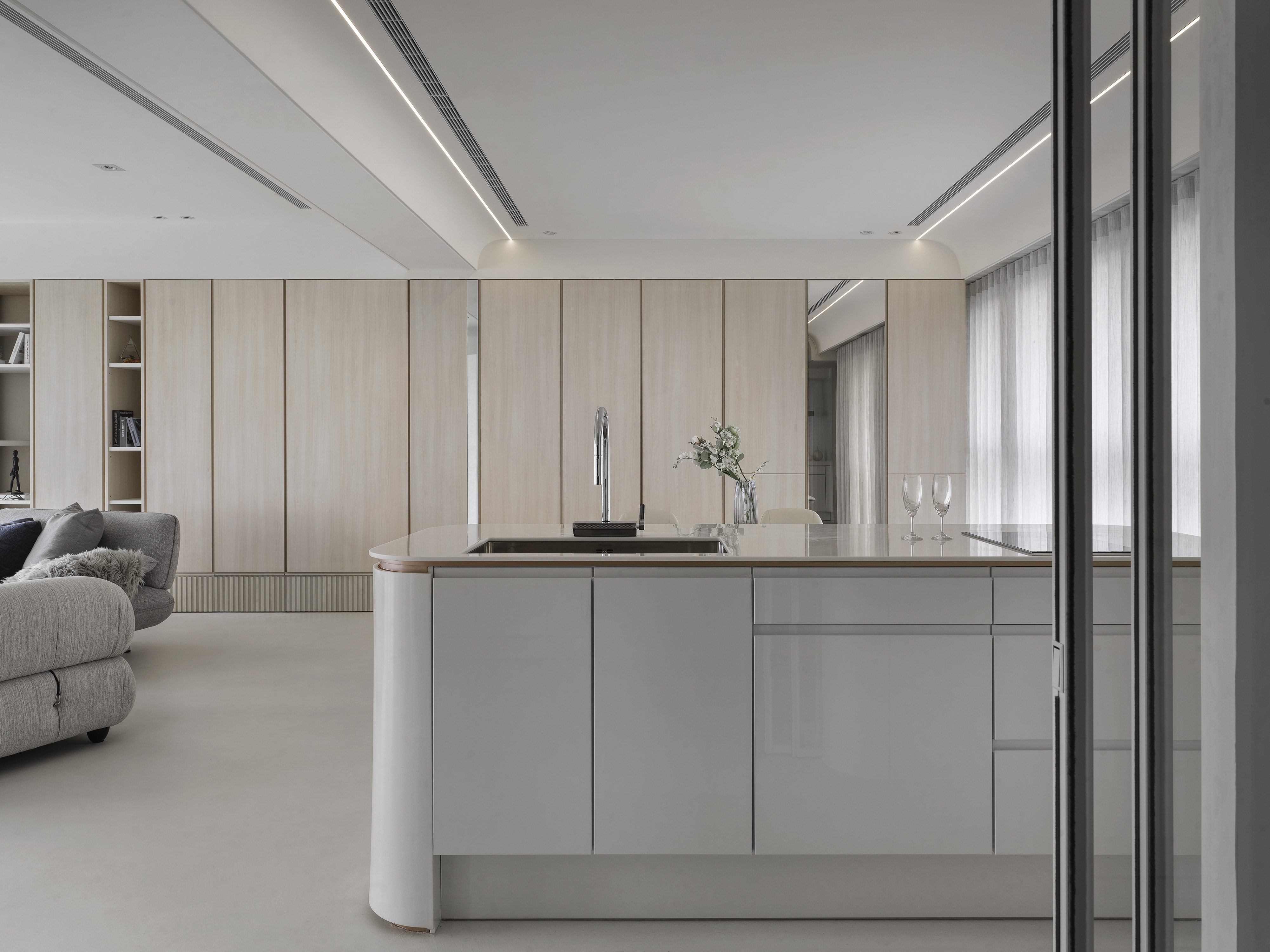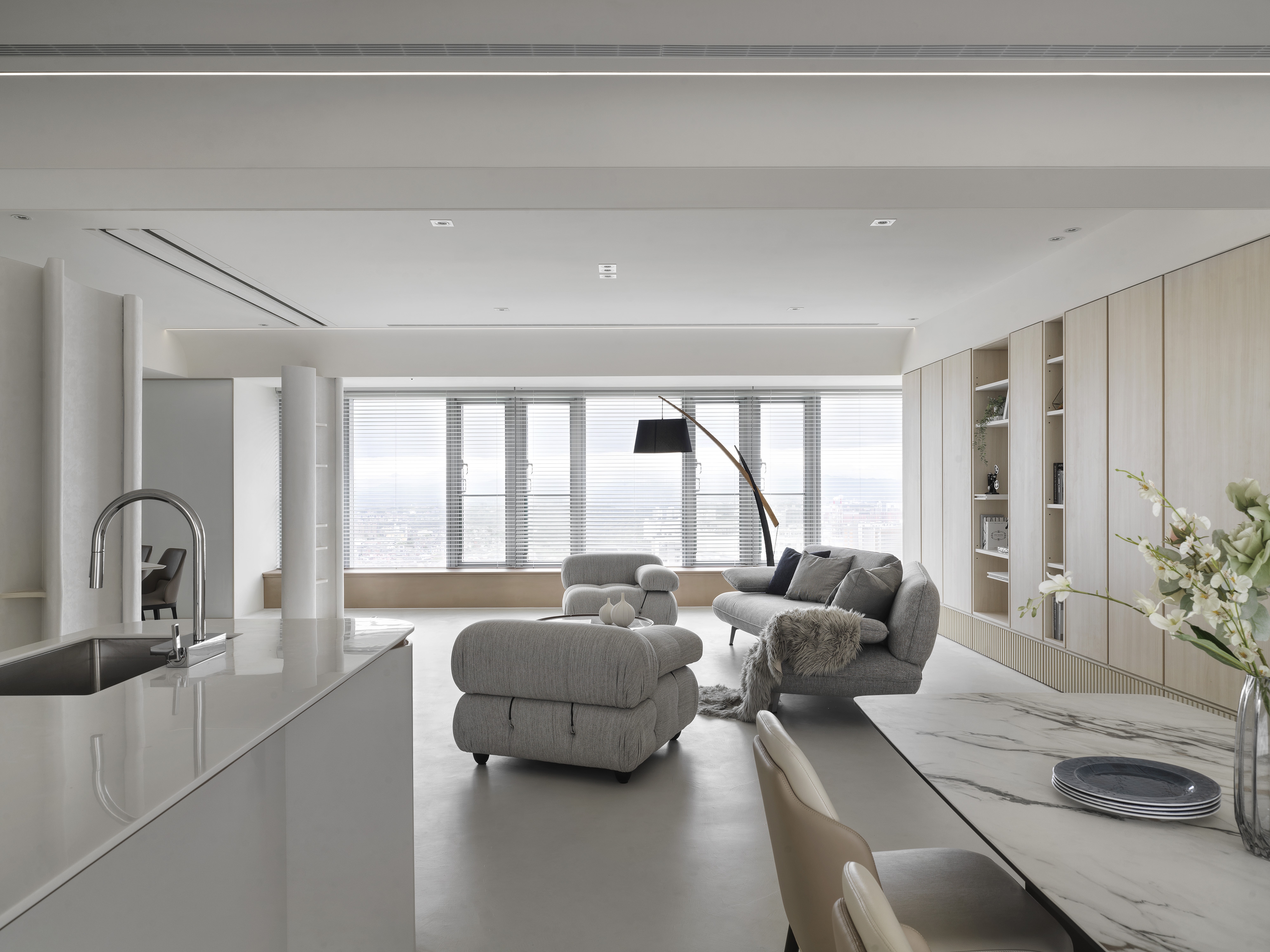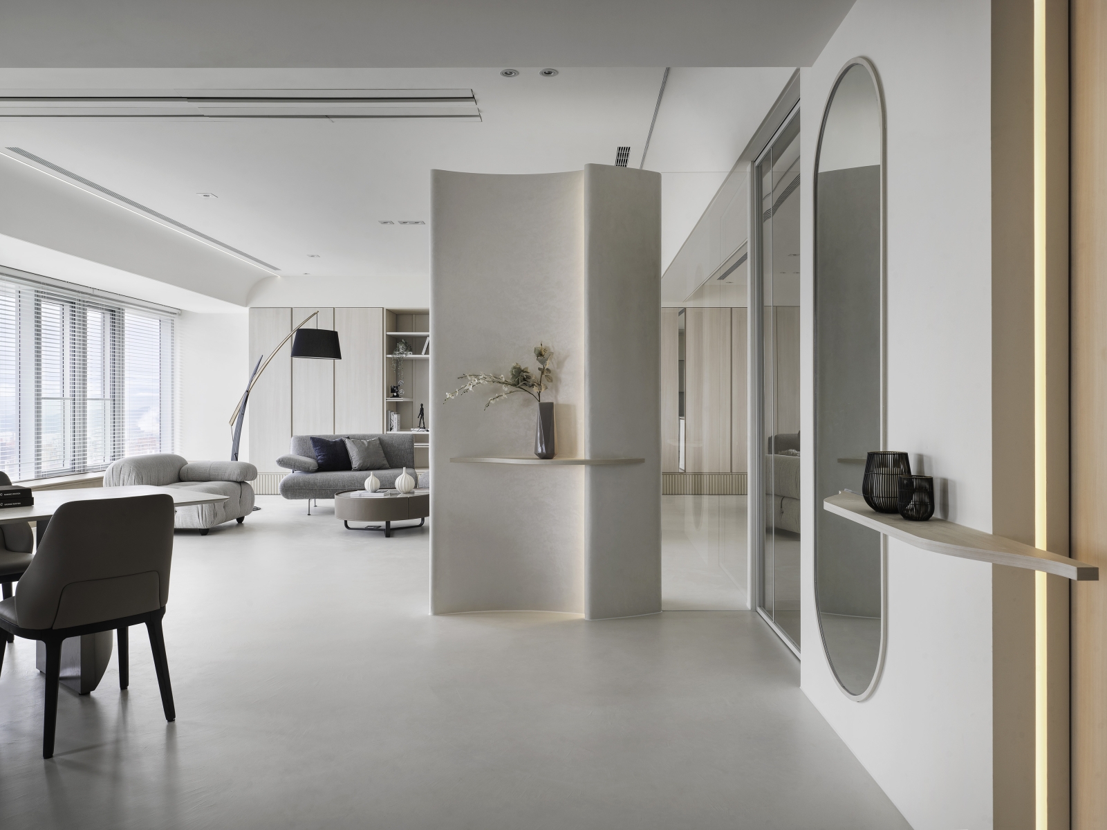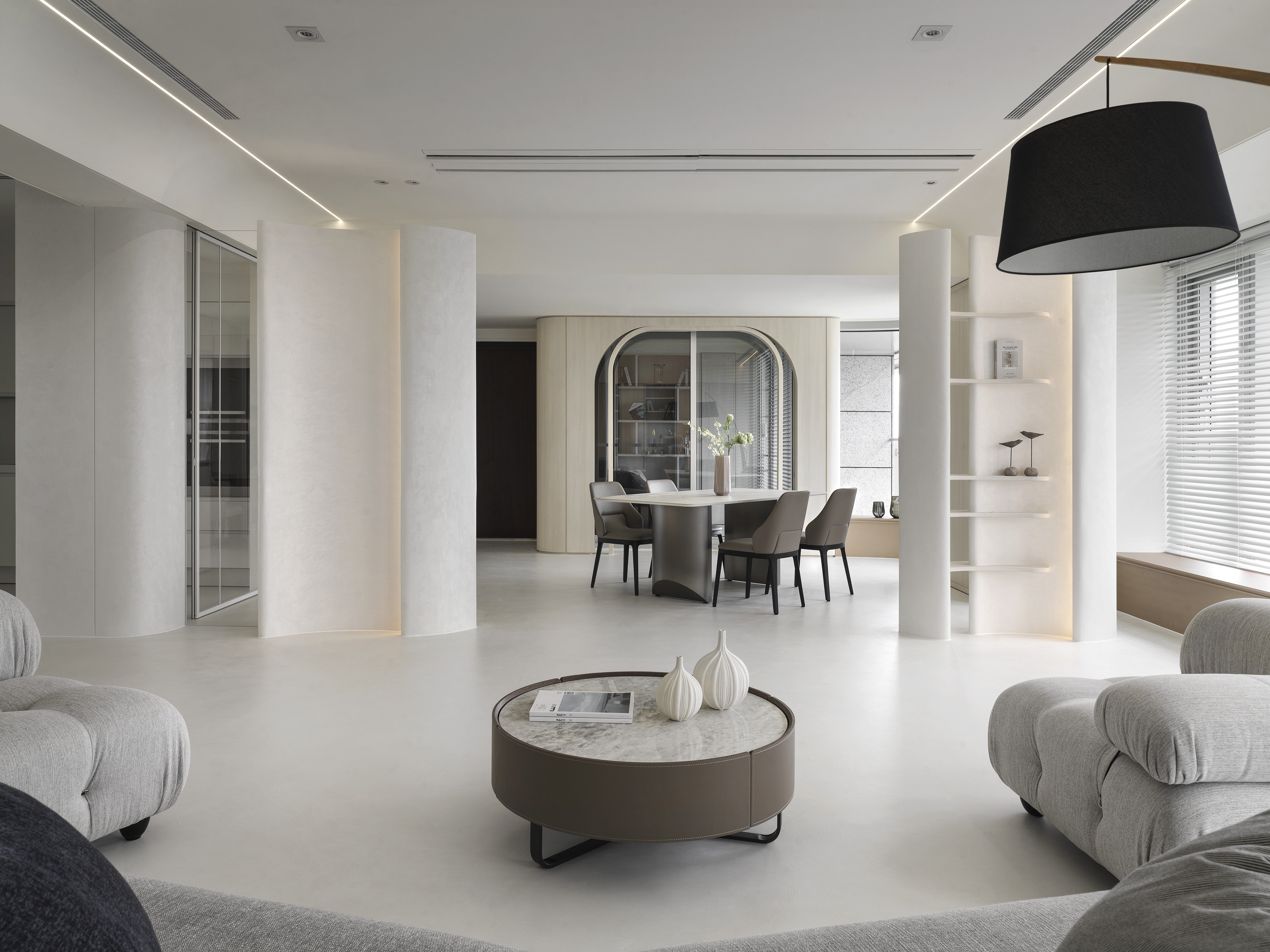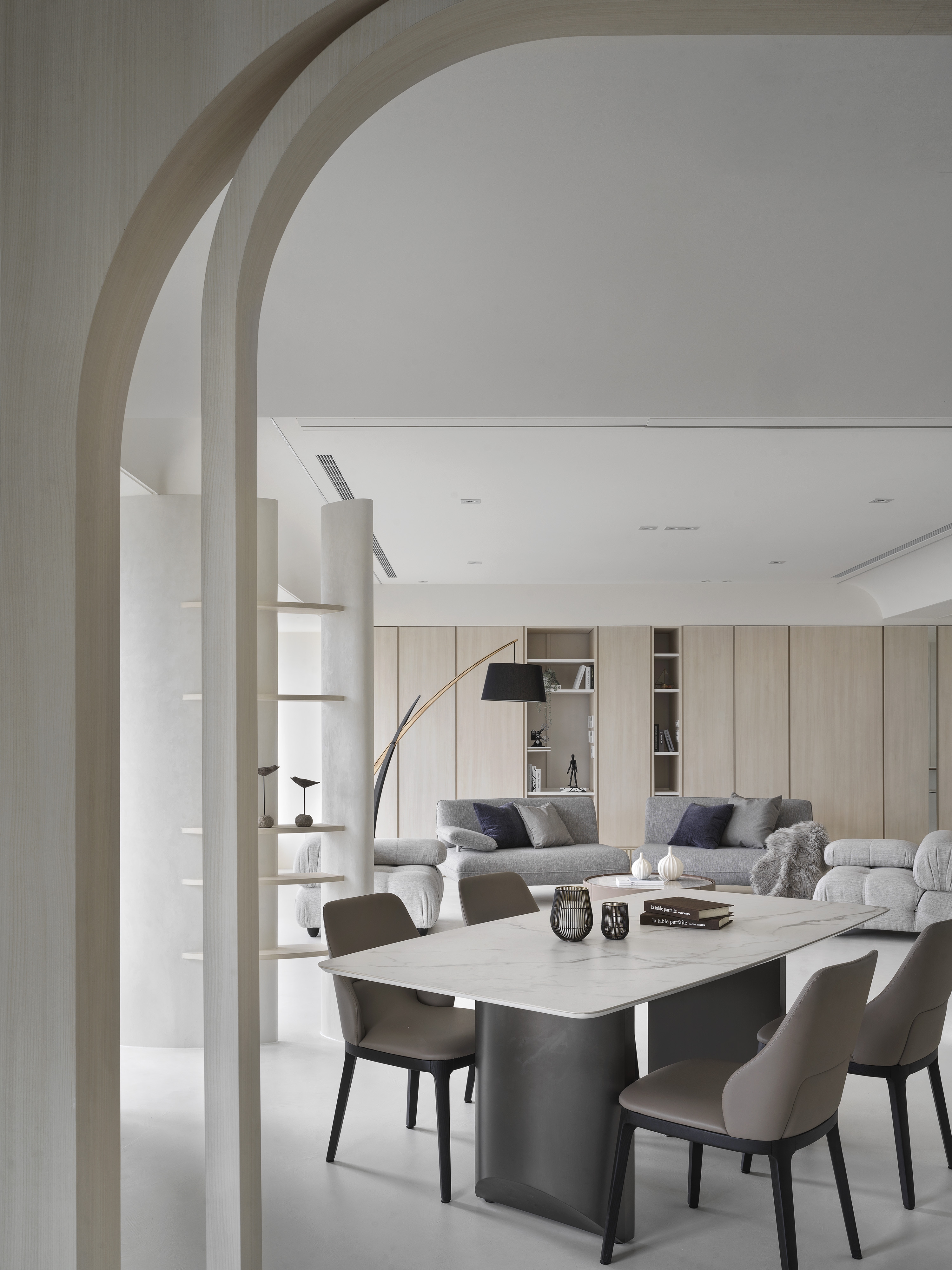The designer uses the arc and moving line arrangement to create a smooth sense of vision and space while connecting the 360-degree "circular" panoramic view; using the overlapping design techniques and extracting functions from corridor space to create high efficiency and enhance functional performance; then, the white material and the space are left blank to create a pure and completely relaxed atmosphere, retaining the flexibility that the owner embellishes with artworks and collections.