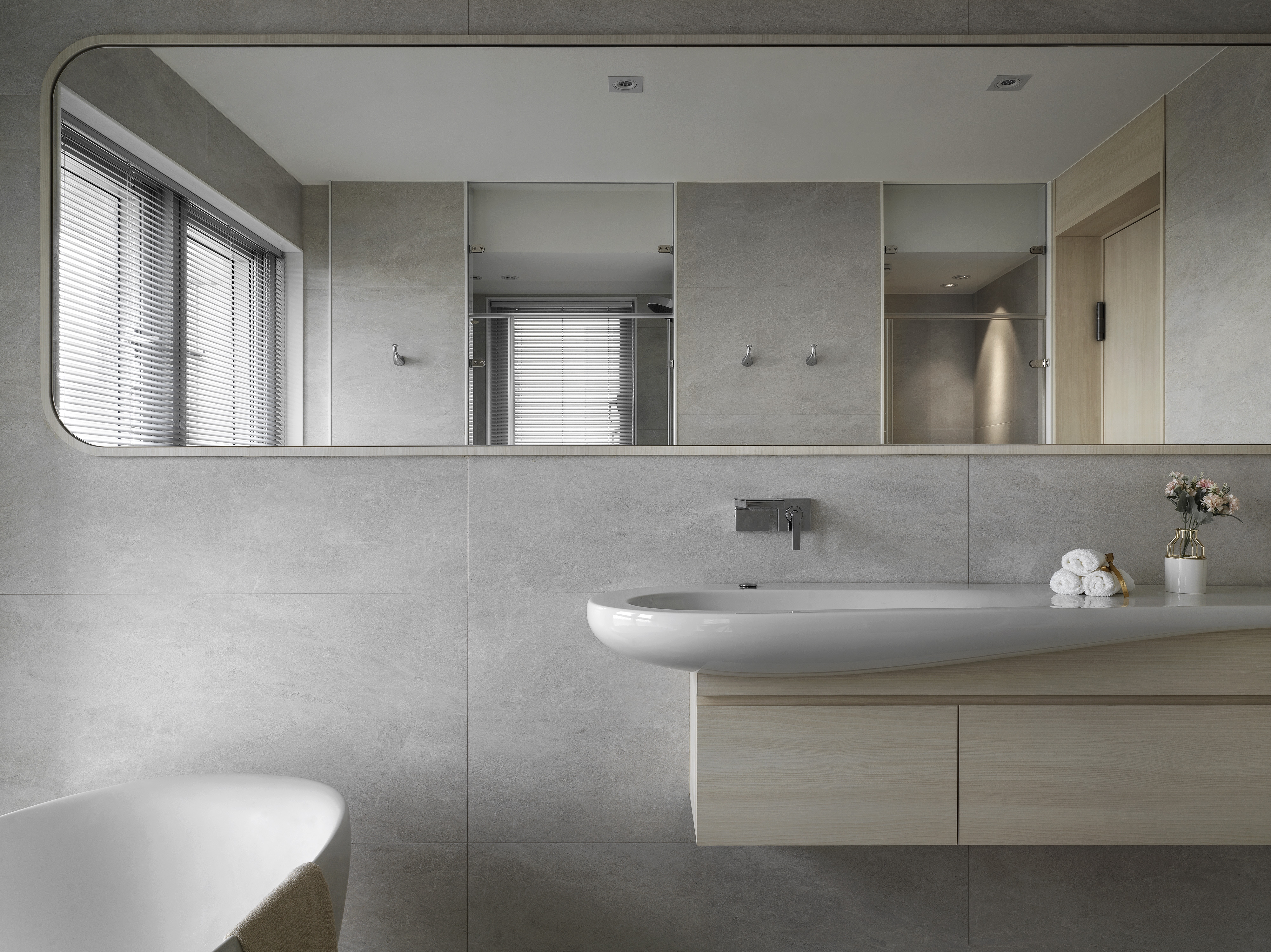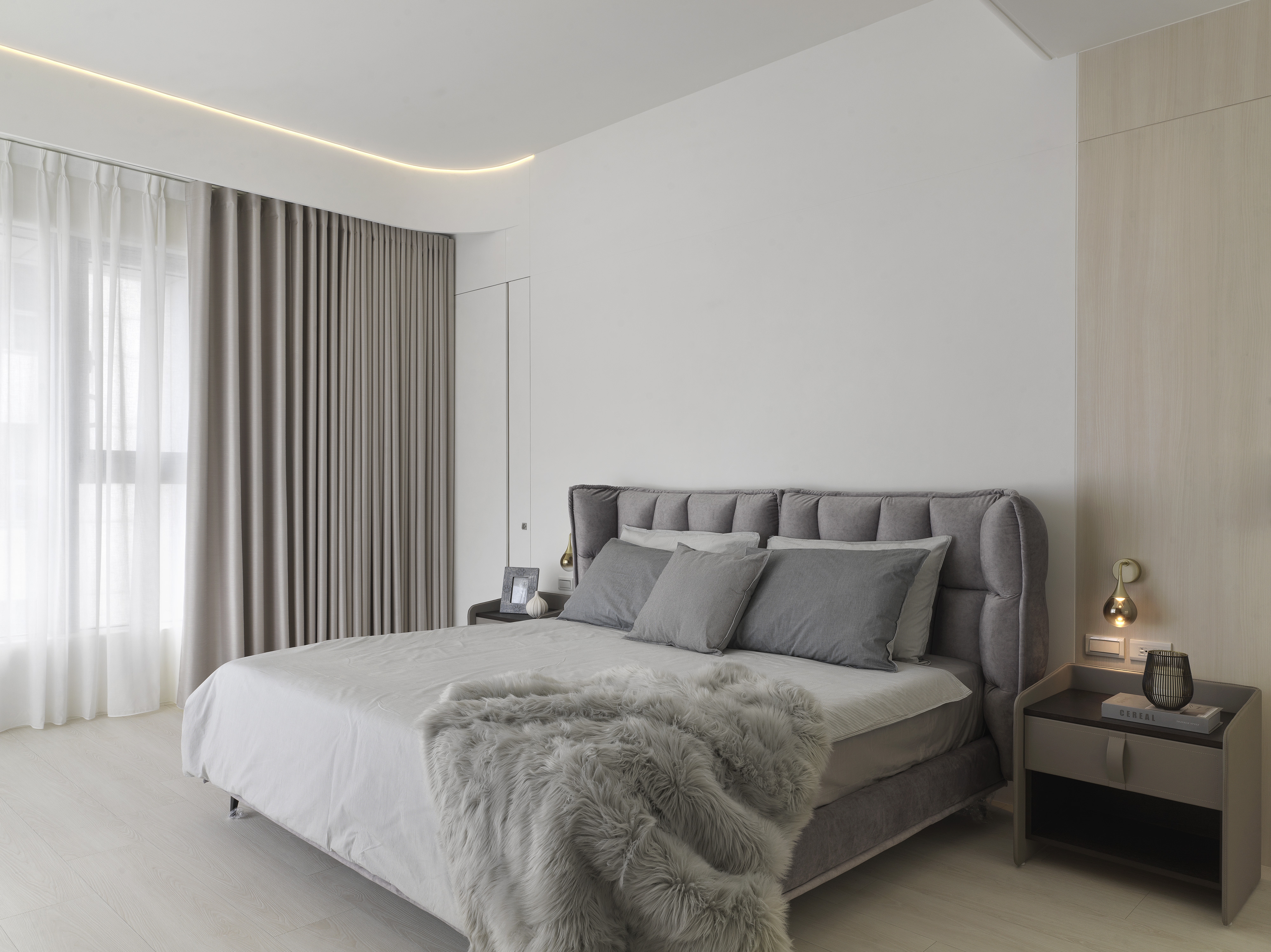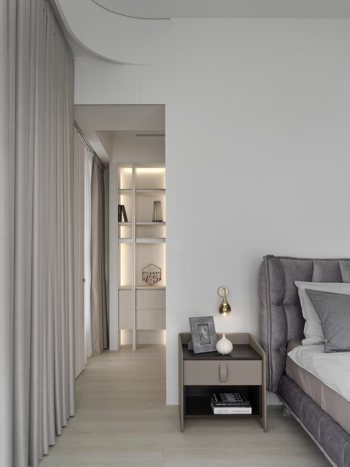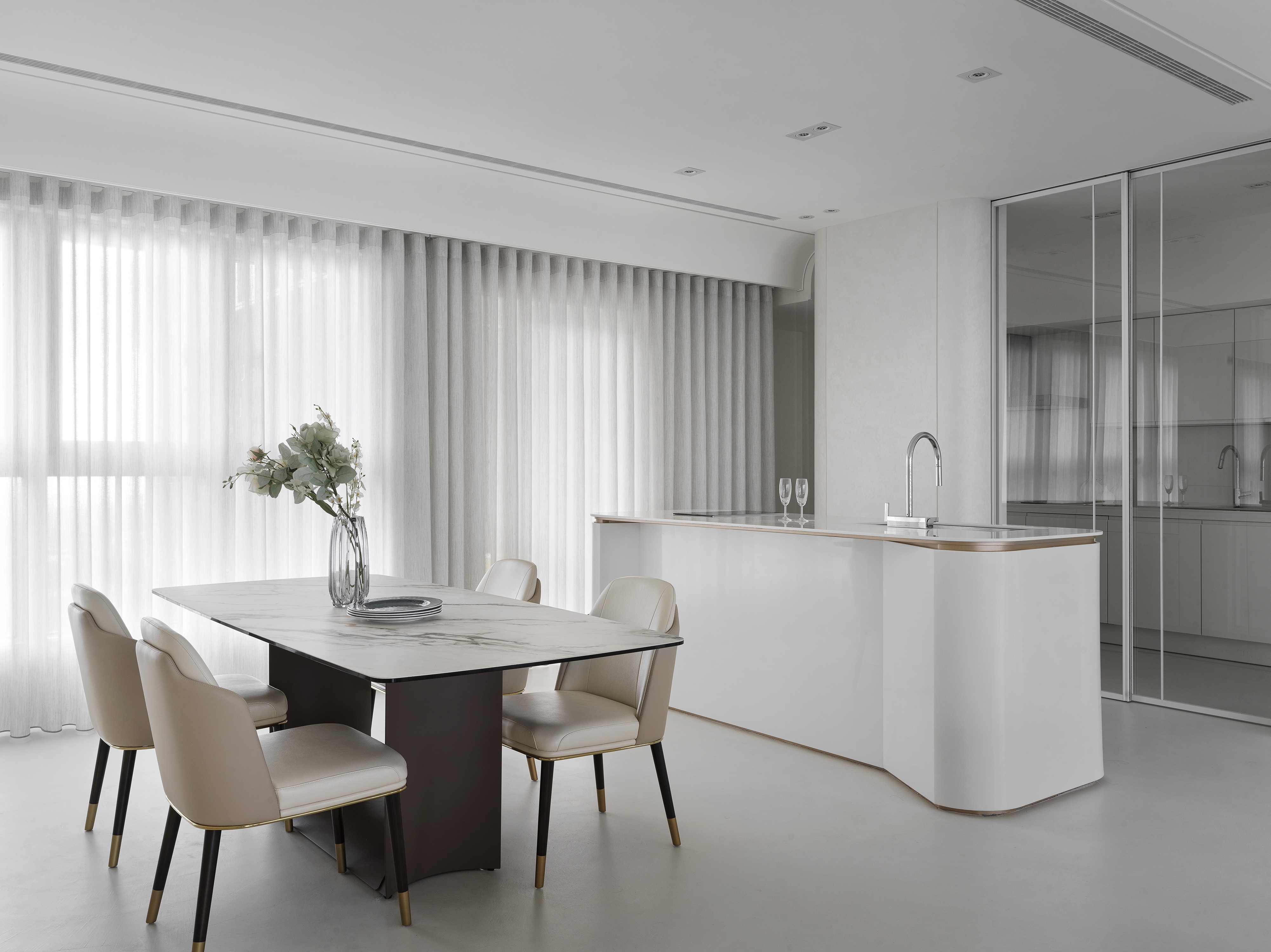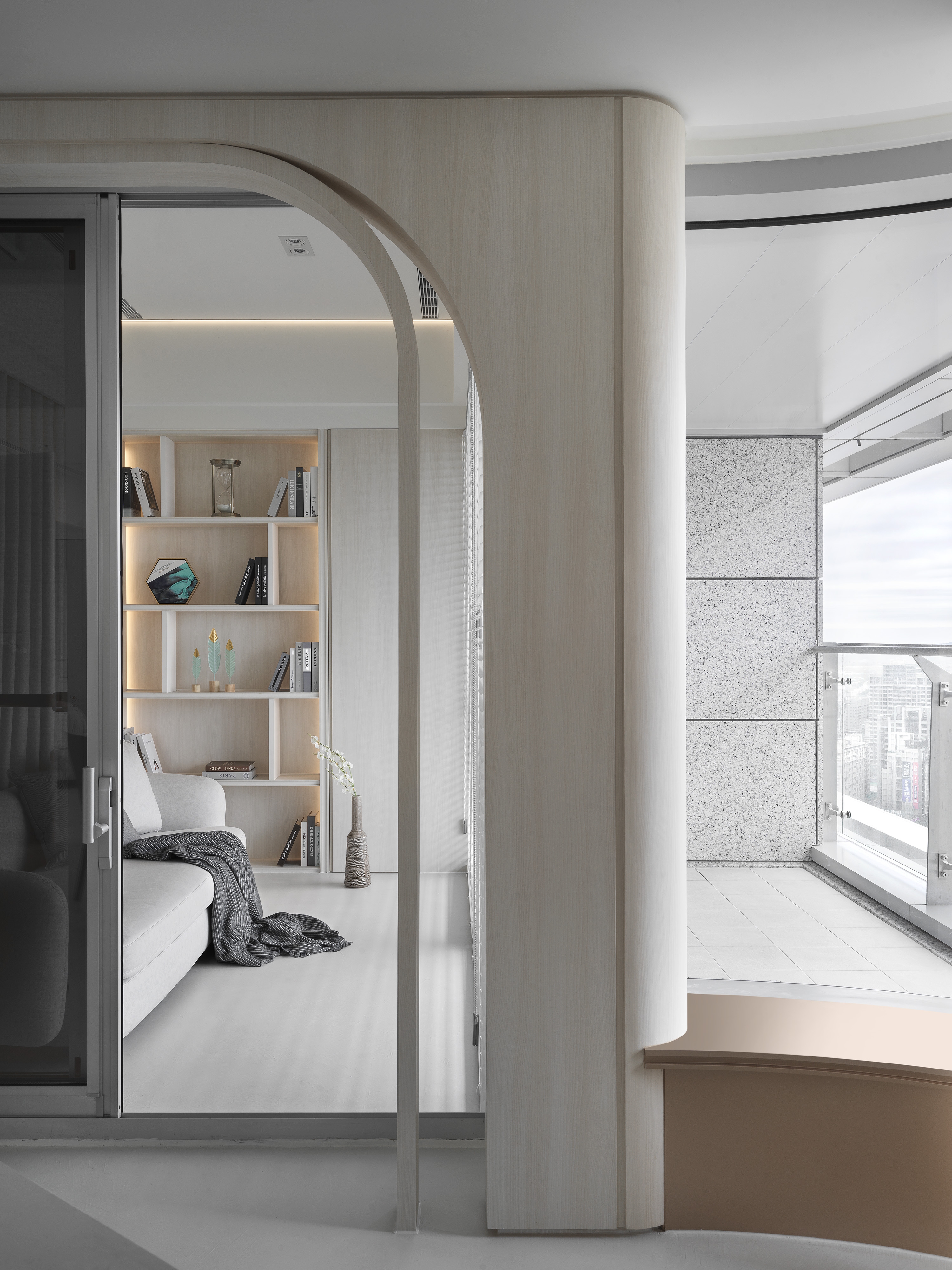 The designer uses the arc and moving line arrangement to create a smooth sense of vision and space while connecting the 360-degree "circular" panoramic view; using the overlapping design techniques and extracting functions from corridor space to create high efficiency and enhance functional performance; then, the white material and the space are left blank to create a pure and completely relaxed atmosphere, retaining the flexibility that the owner embellishes with artworks and collections.