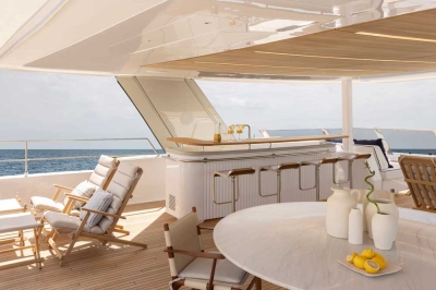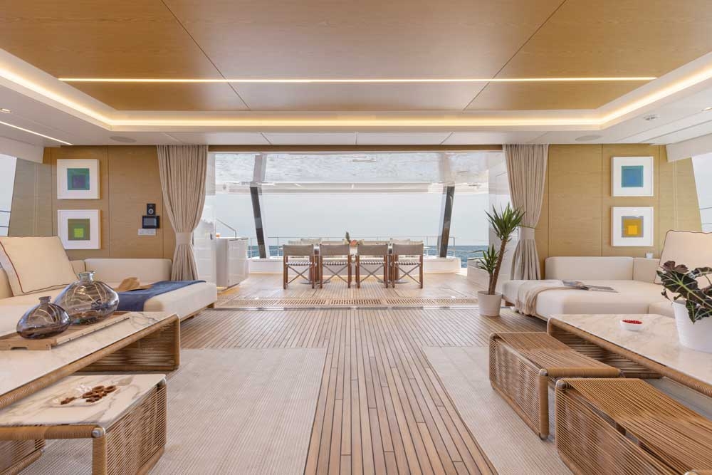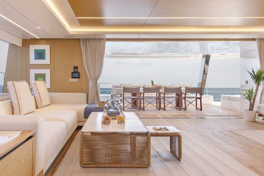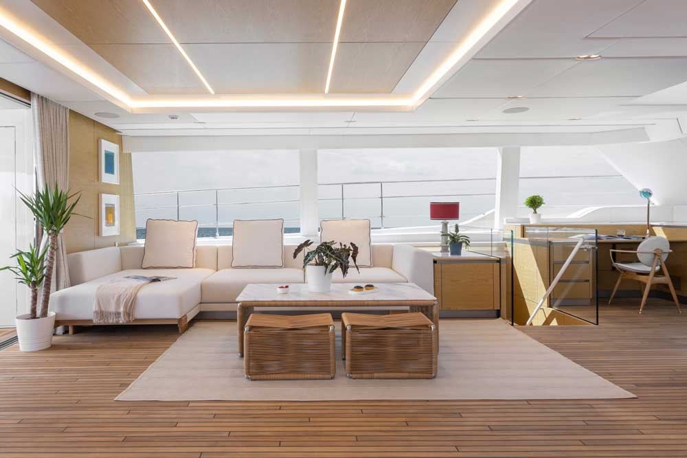 The main saloon opens wide onto the ample aft cockpit to combine the yacht’s interior dining space with the outdoor relaxation areas, where more seating is available along with a wet bar. The fully customizable main deck saloon is a warm and welcoming retreat with plenty of light-filled living and lounging space. To starboard, the lounging space offers a large sofa and custom-designed coffee tables matching the yacht’s beach-inspired décor. Towards the bow, the saloon features a dining space with seating for eight as well as another lounging area.