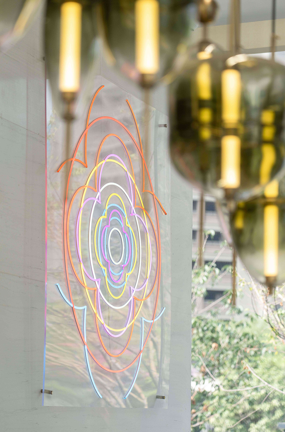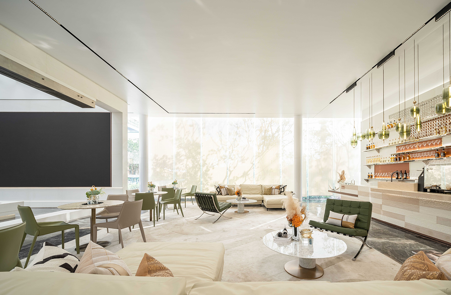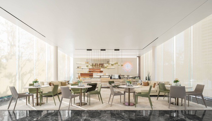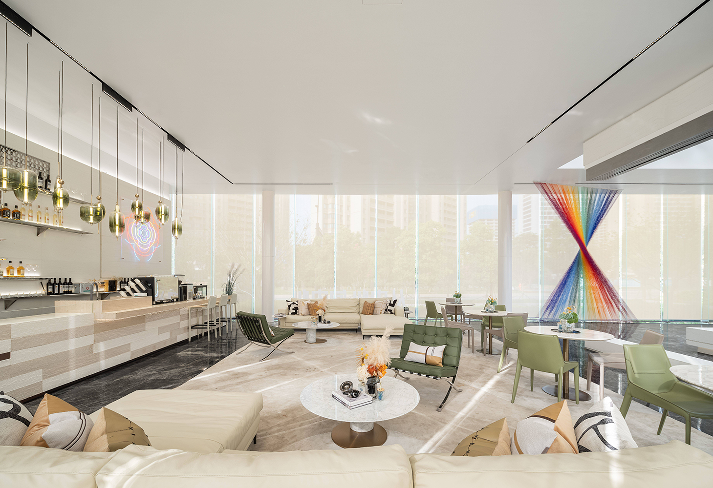 Entering the project, marble with rich patterns at reception gives a luxurious and elegant impression. The different color and texture combinations in the lobby demonstrate the activeness and the youthful energy, as the color green and orange give a natural tone to the atmosphere and works as a highlight. Visitors can also perceive a dynamic and pleasant experience brought by space art. The rainbow-colored line art creates a rich and romantic indoor scenery. This installation is also like the lead of time, weaving the long river of human history. The Barcelona chair is an iconic Bauhaus furniture. It symbolizes the perfect unity of modern art, craft, and technology. The liveness of the space exists in various contemporary art forms, continually extracting, evolving, and innovating.