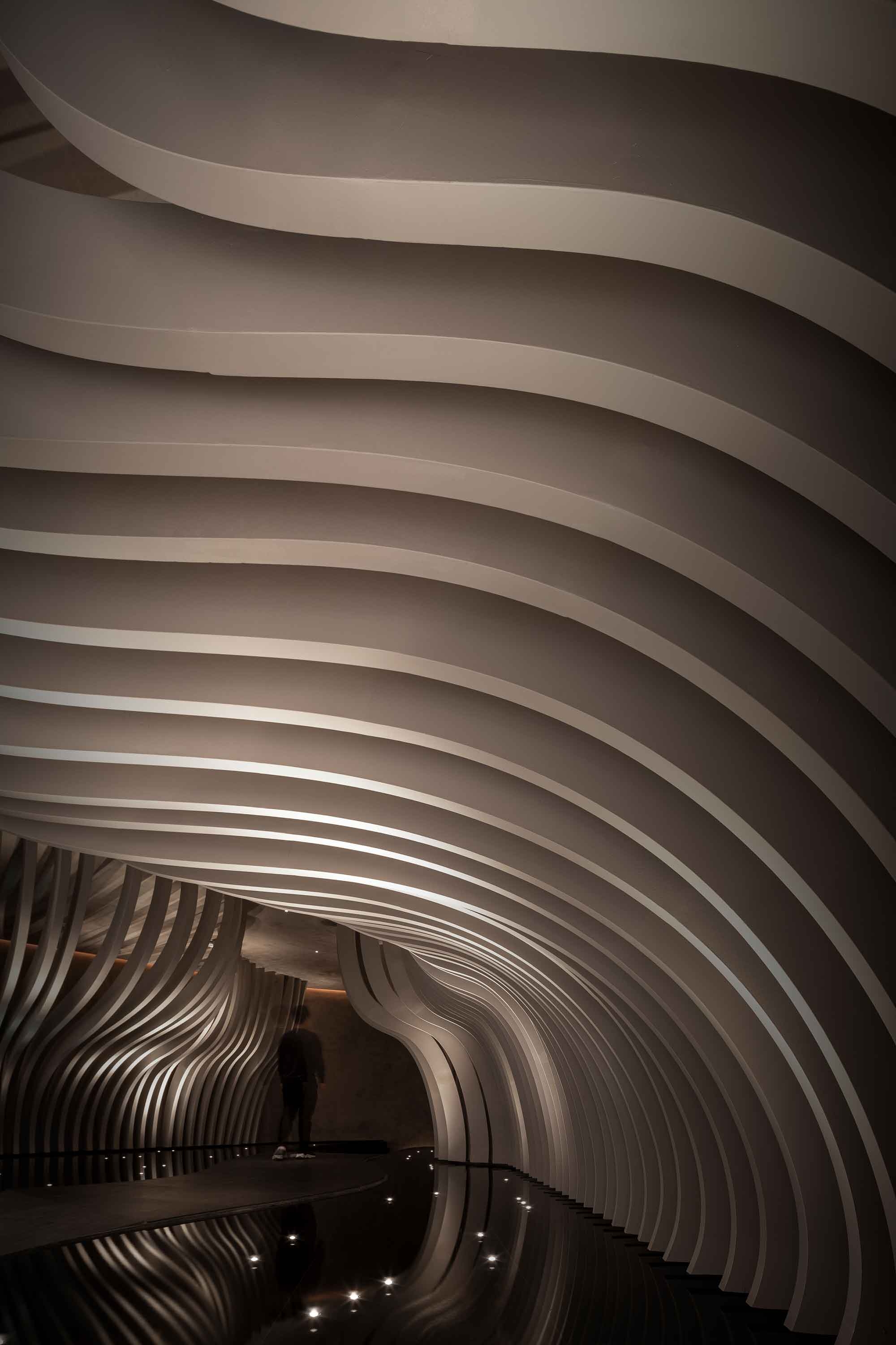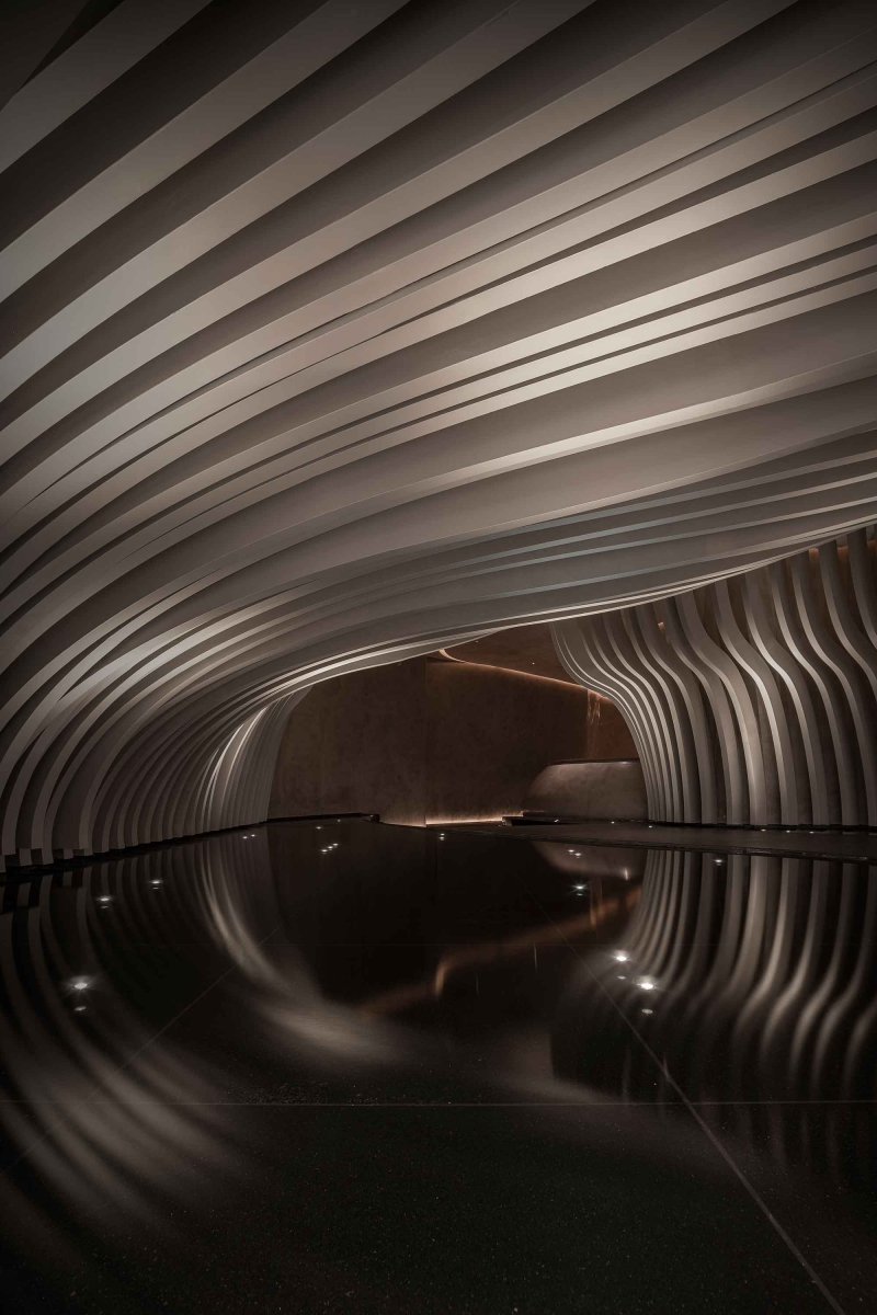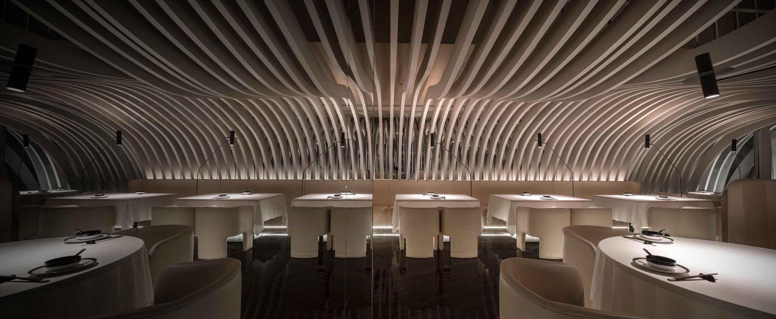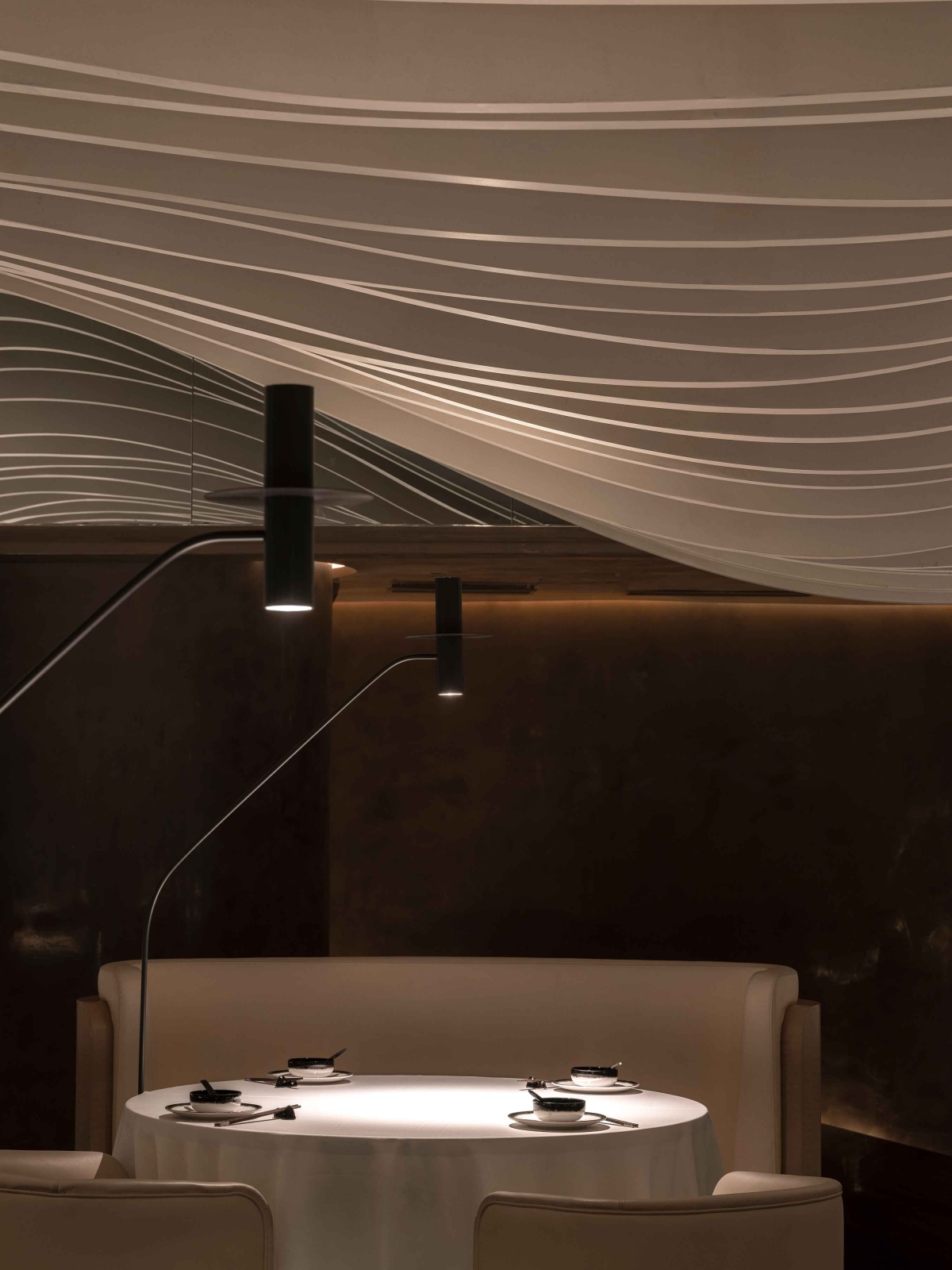 High skip-floor and floor-to-ceiling daylight rarely can be achieved in restaurant in the hall. The designers introduce the sunlight and wind into the restaurant. With sunshine, there will be vitality, dawn and dusk, as well as change of the sun and the moon.During the micro and macro realm, the designers create the details and spaciousness of natural image, demonstrating philosophy via the winding light shadow. With contemporary design, the designers express poetic expectation of writers and poets via the change of light shadow.Beyond the shape of mountain, the designers hope to present human’s emotion to nature and pursuit in spiritual world with oriental culture.