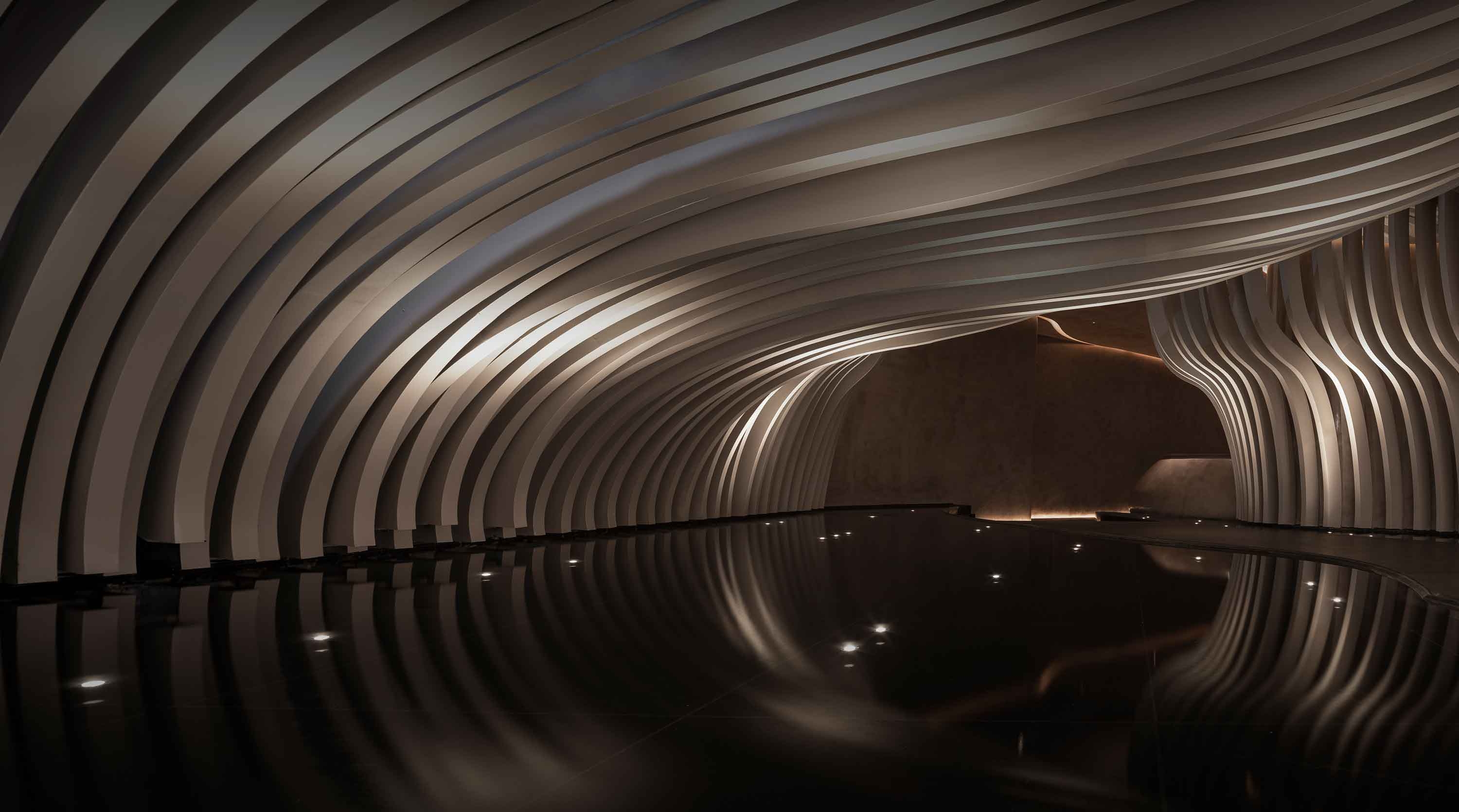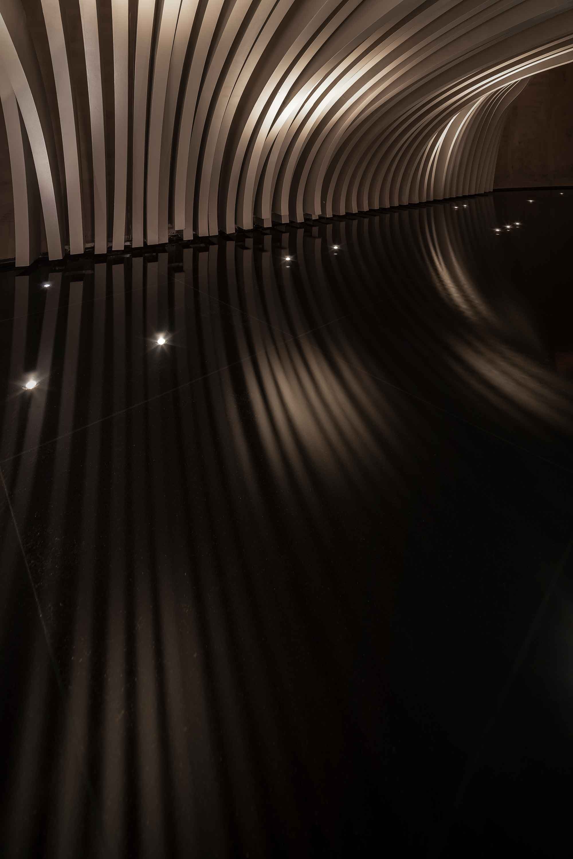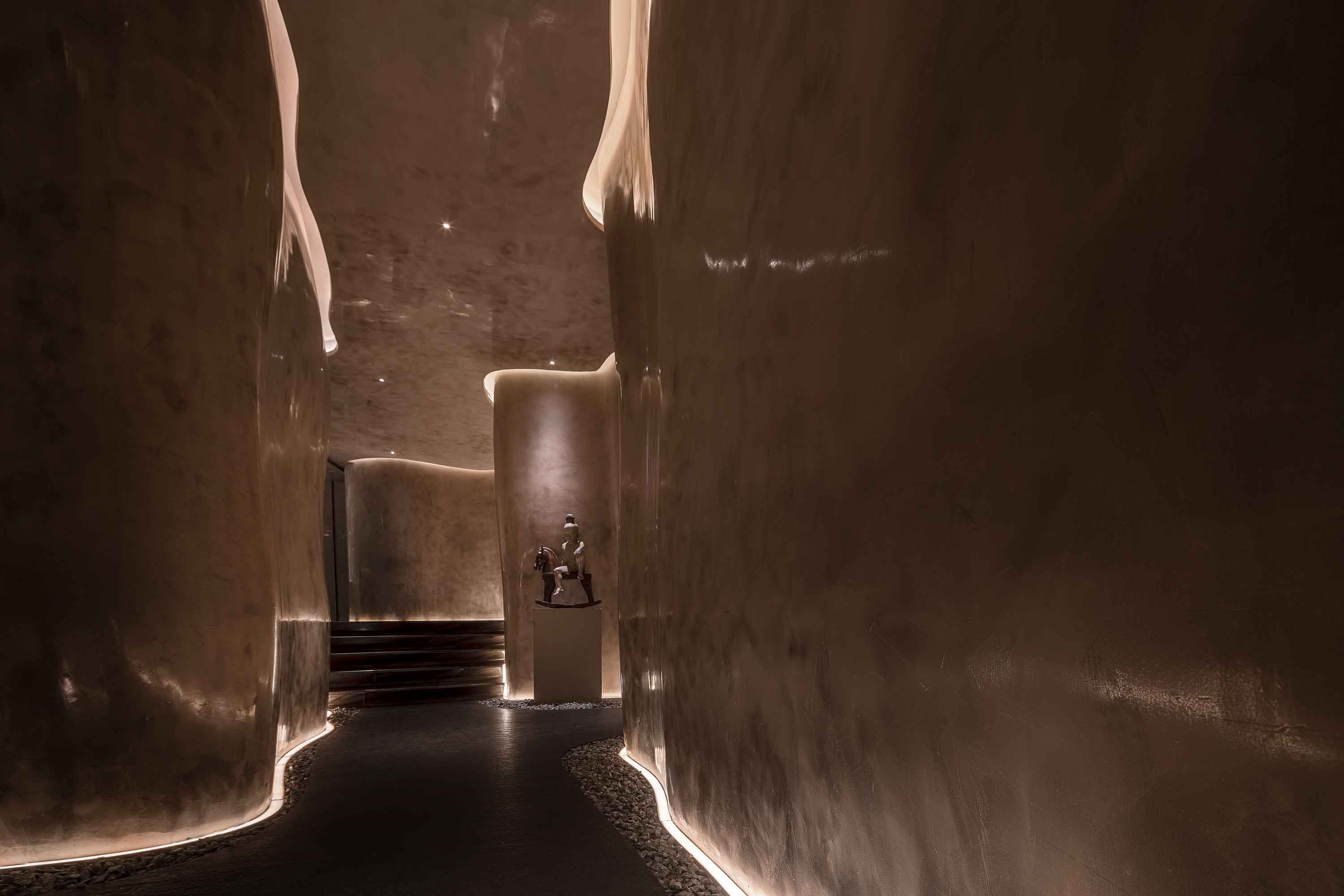 High skip-floor and floor-to-ceiling daylight rarely can be achieved in restaurant in the hall. The designers introduce the sunlight and wind into the restaurant. With sunshine, there will be vitality, dawn and dusk, as well as change of the sun and the moon.During the micro and macro realm, the designers create the details and spaciousness of natural image, demonstrating philosophy via the winding light shadow. With contemporary design, the designers express poetic expectation of writers and poets via the change of light shadow.Beyond the shape of mountain, the designers hope to present human’s emotion to nature and pursuit in spiritual world with oriental culture.